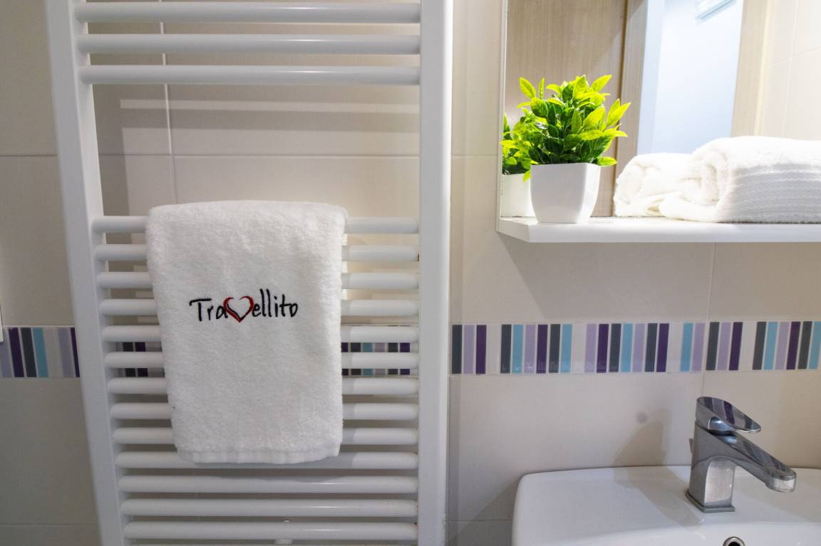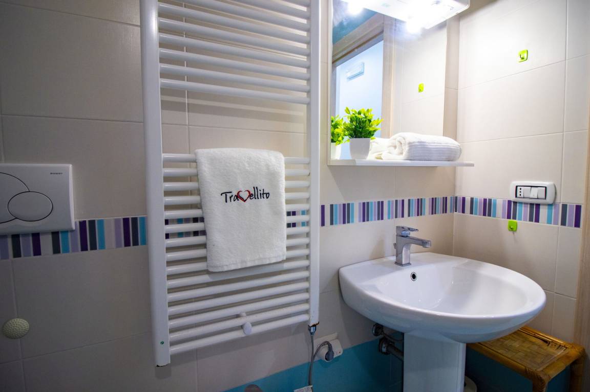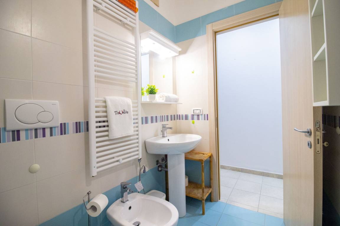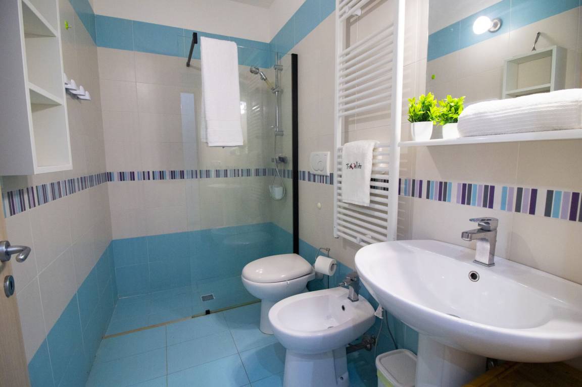 Badezimmer: Waschbecken, WC, Bidet, Dusche, Fön.