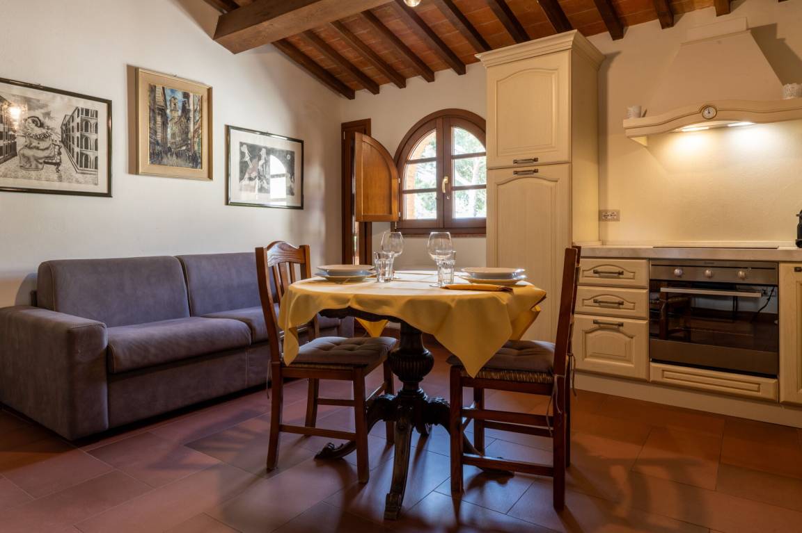 Speisen mit Freunden und Familie ist ein großer Bestandteil der toskanischen Kultur. Nutzen Sie die gut ausgestattete Küche, um Mahlzeiten aus lokalen Produkten vorzubereiten, während Sie im Urlaub sind. Die Küche kommt mit Kaffeemaschine, Mikrowelle und Kühlschrank, sowie ausreichend Geschirr und Besteck für bis zu zwei Personen.