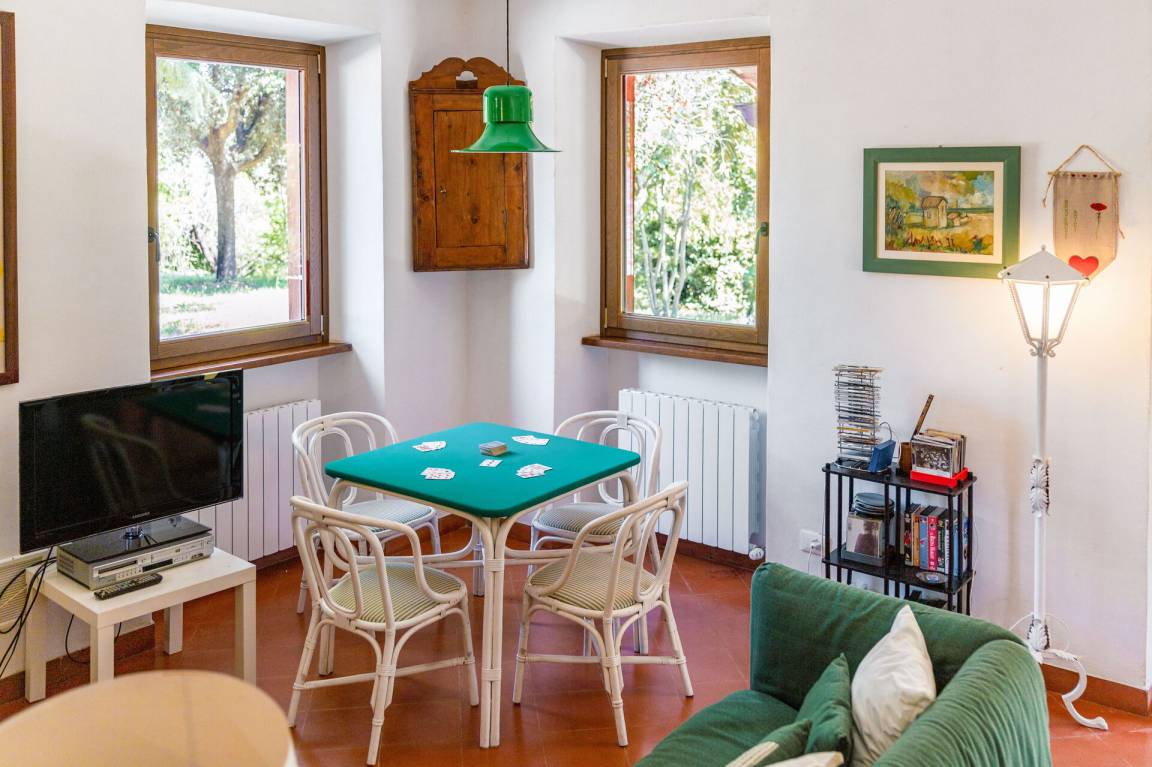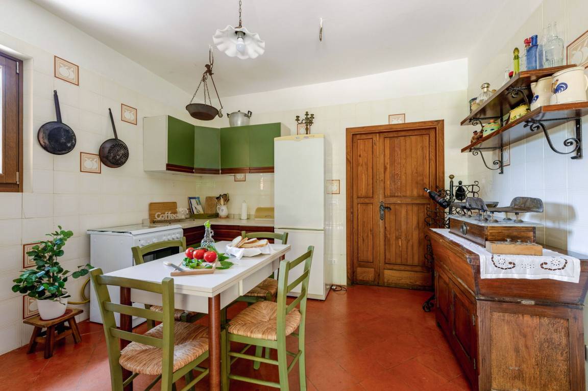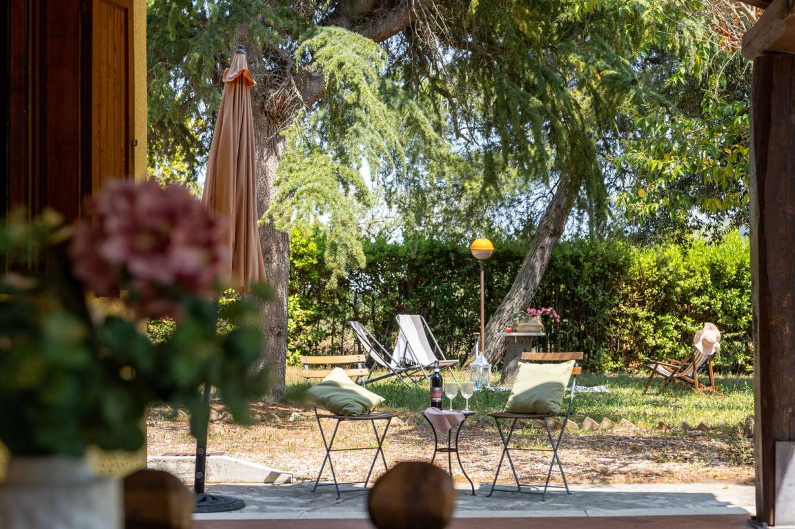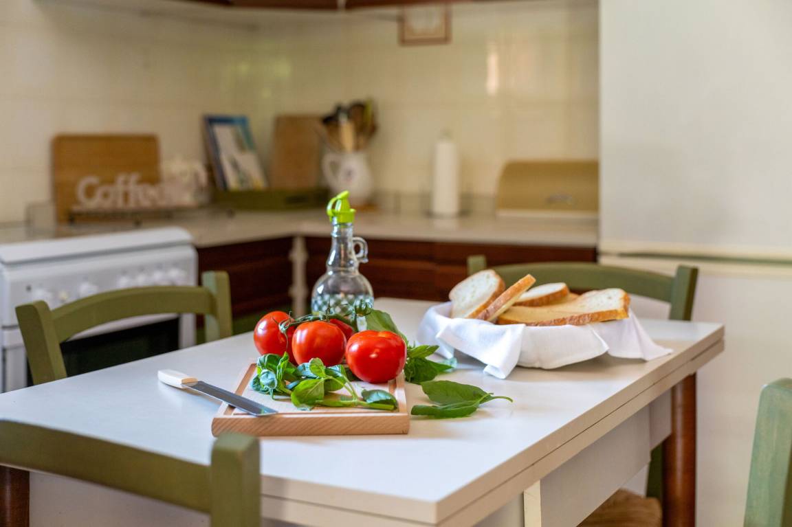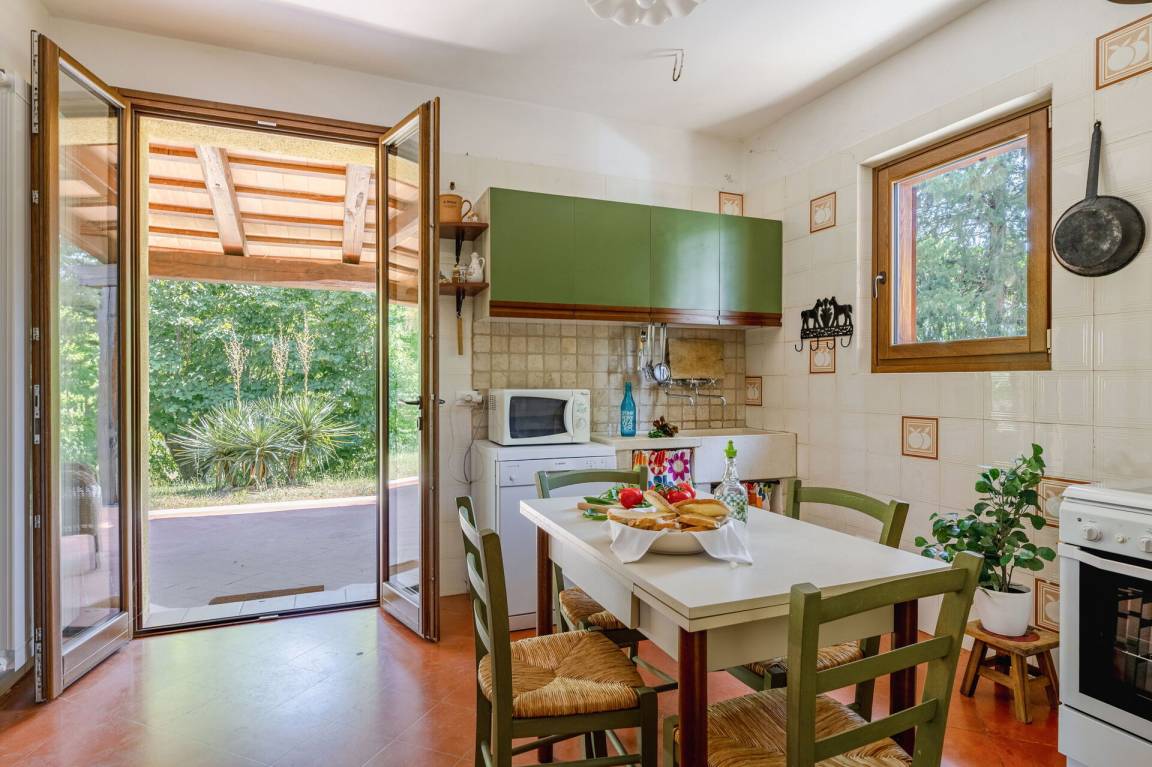 Wohnküche: gut ausgestattete Küche, Esstisch, Spülmaschine, Kühlschrank, Tiefkühler, Mikrowelle, Herd, Ofen, Italienische Kaffeemaschine, Waschmaschine, Sofa, Sessel, Kamin, WiFi Internet, Satelliten-TV, Rauchmelder, Ausgang auf den Garten, Ausgang auf den Patio.