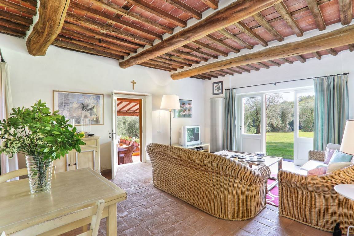 Wohnzimmer: zwei Sofas (Personen: 6), zwei Sessel, Esstisch (Personen: 6), WiFi Internet, TV, Video / DVD, Ausgang auf den Garten.