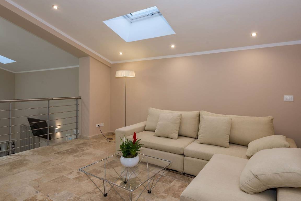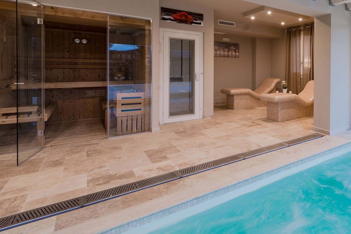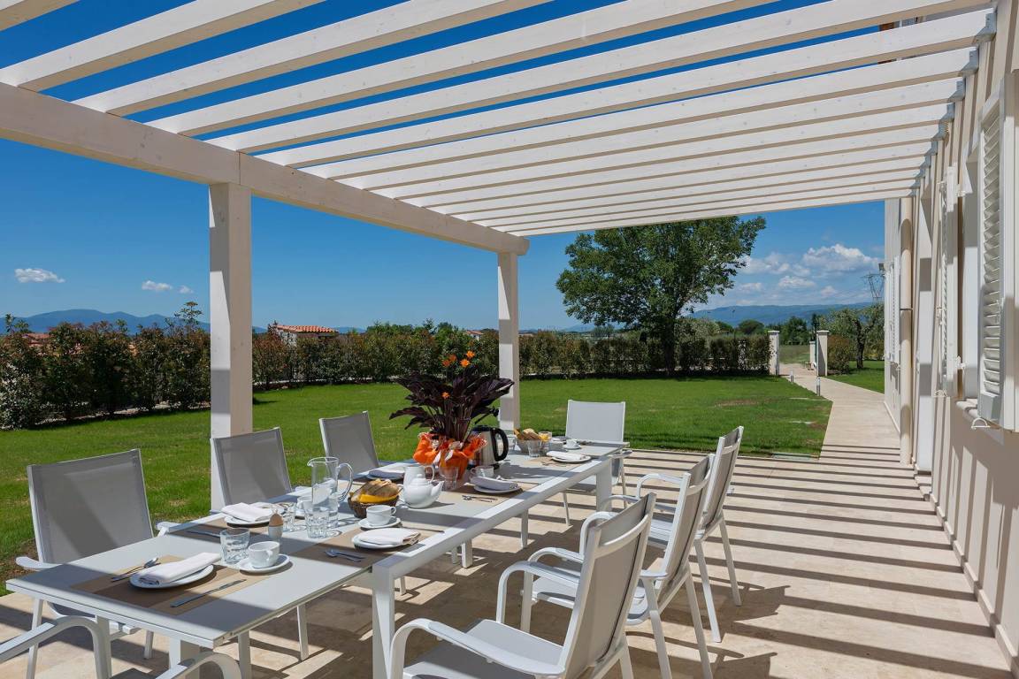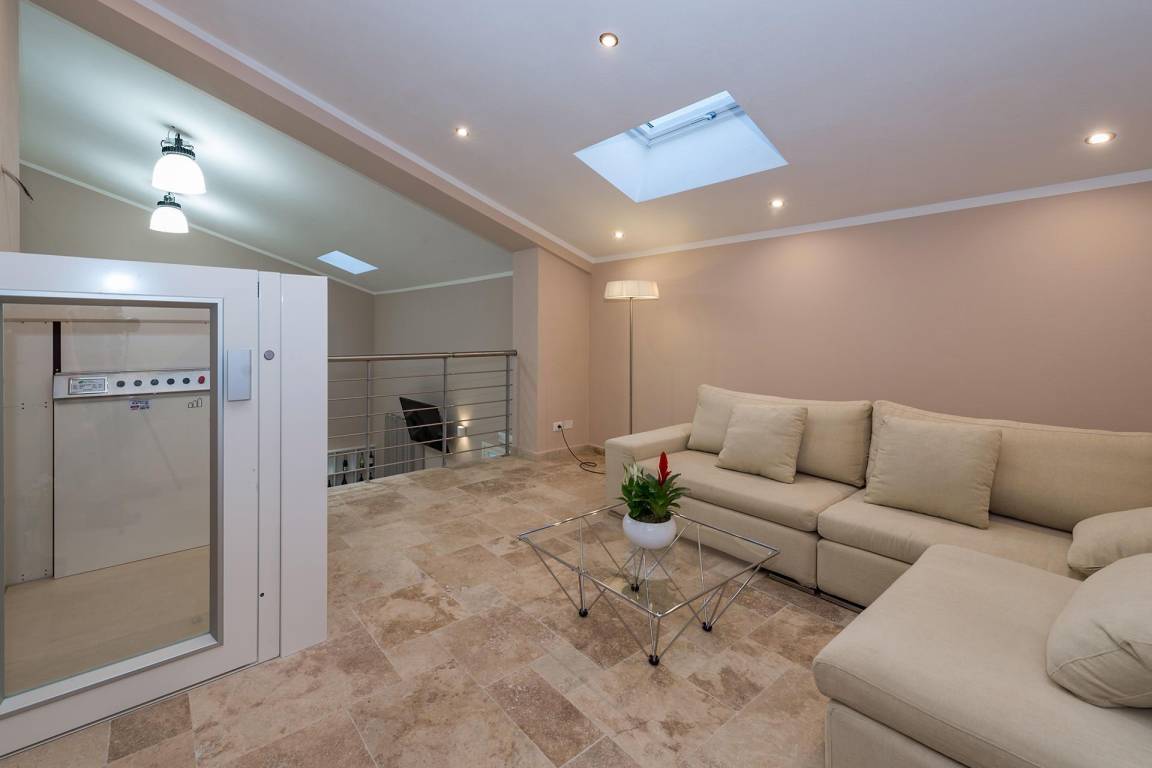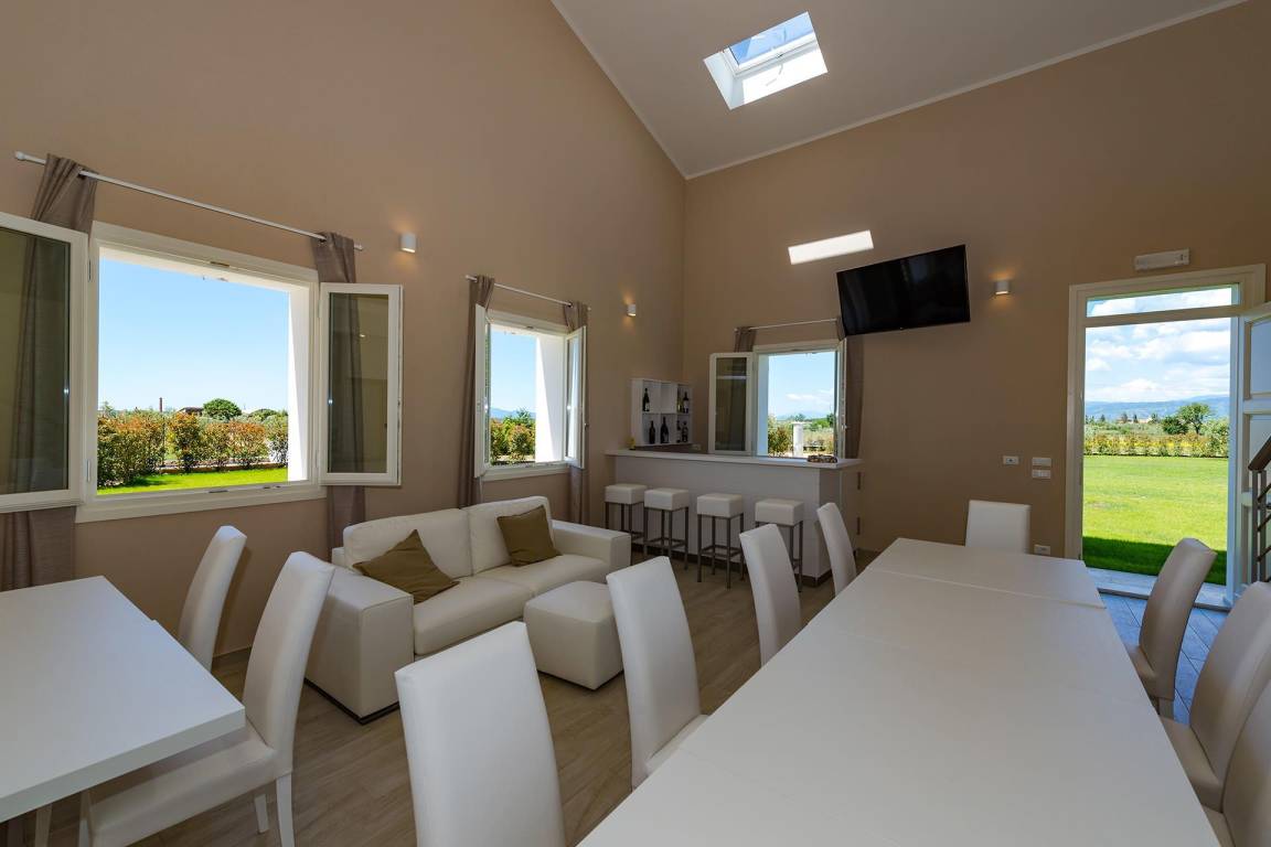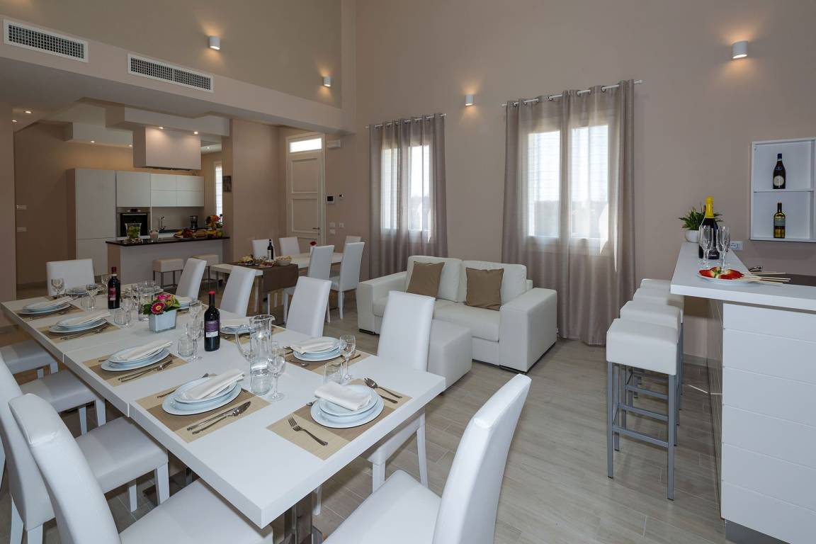 Die Villa erstreckt sich über etwa 340 Quadratmeter auf 2 Etagen und bietet Platz für bis zu 13 Gäste in 5 Doppelschlafzimmern und 6 Bädern. Das Erdgeschoss verfügt über einen großzügigen, offenen Wohn- und Essbereich mit komfortablen Sofas und einem geräumigen Esstisch, der direkt in die vollausgestattete Küche übergeht. Die Küche öffnet sich unmittelbar zur überdachten Außenterrasse. Im ersten Obergeschoss befinden sich alle 5 Doppelschlafzimmer, jedes mit eigenem En-Suite-Bad mit begehbarer Dusche und Satellitenfernsehen; in 3 dieser Schlafzimmer steht zusätzlich ein Einzelbett zur Verfügung. Ein separater Fernsehraum mit Loungebereich ist über einen internen Aufzug erreichbar, der direkt zum SPA-Bereich im unteren Geschoss führt.
