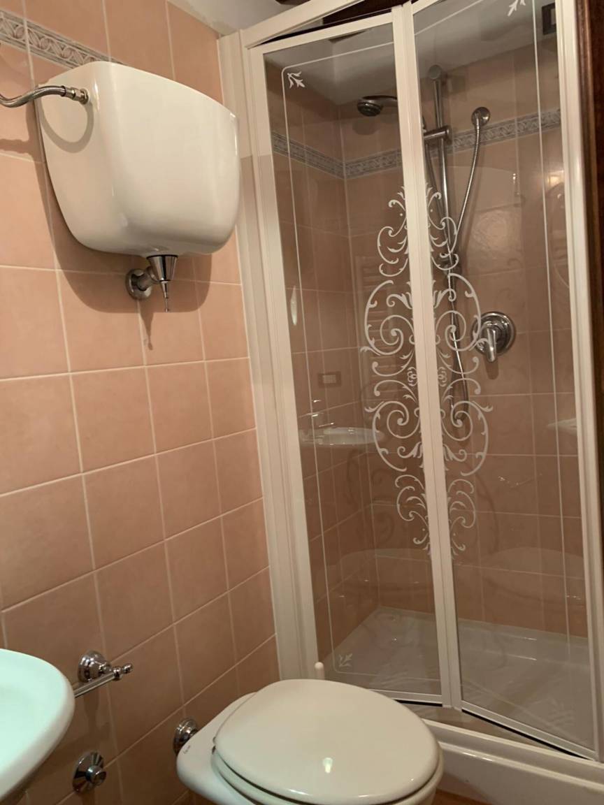 Badezimmer: Waschbecken, WC, Dusche.
