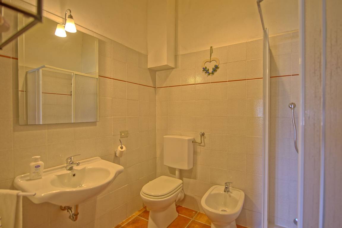 6 Stufen tiefer: Doppelzimmer mit Ehebett, Zweibettzimmer, Bad mit Dusche.