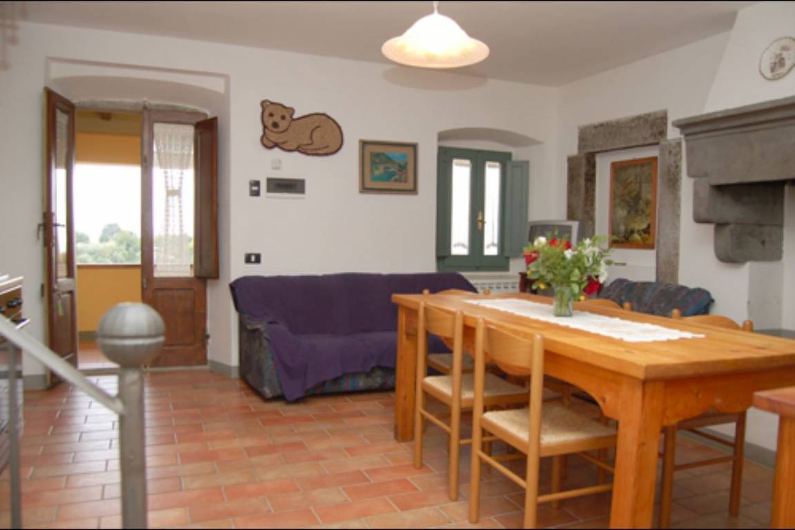 Erster Stock: Wohn-/Esszimmer mit Kochnische und großem Kamin, Doppelzimmer, Bad mit Wanne.
