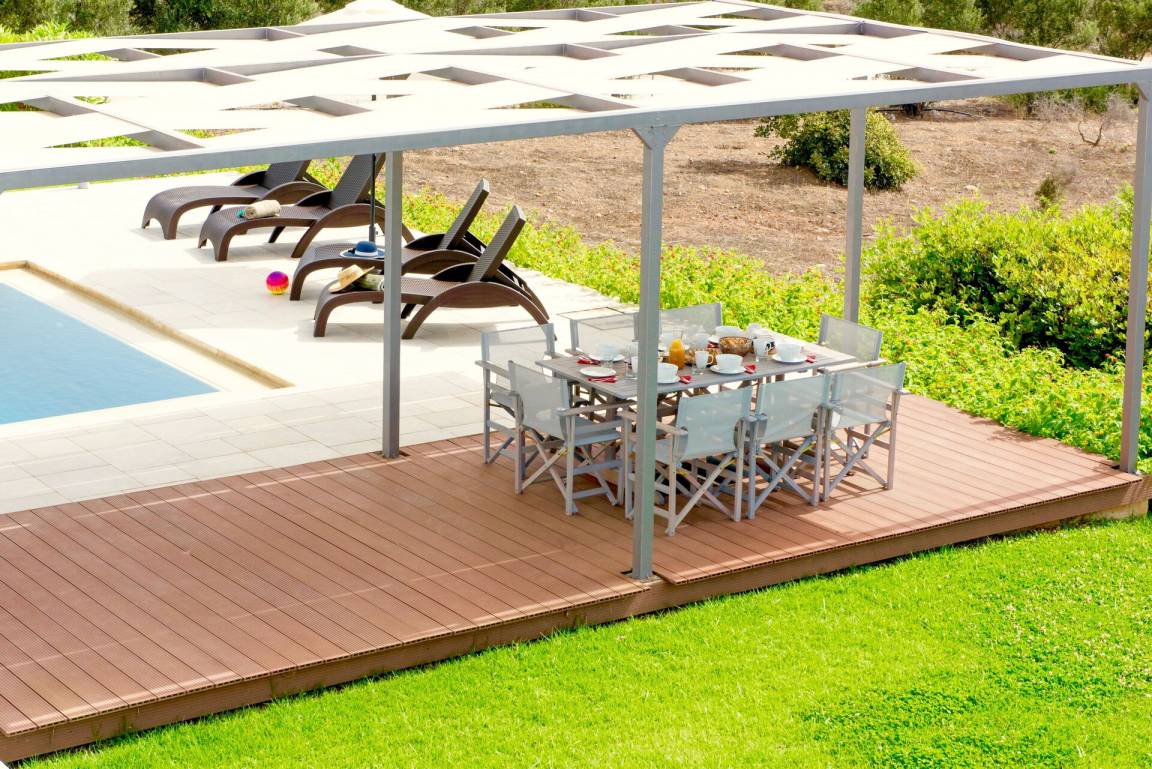 Terrasse: Außenbereich für das Essen im Freien, Esstisch, Grill, Terrassenmöbel.