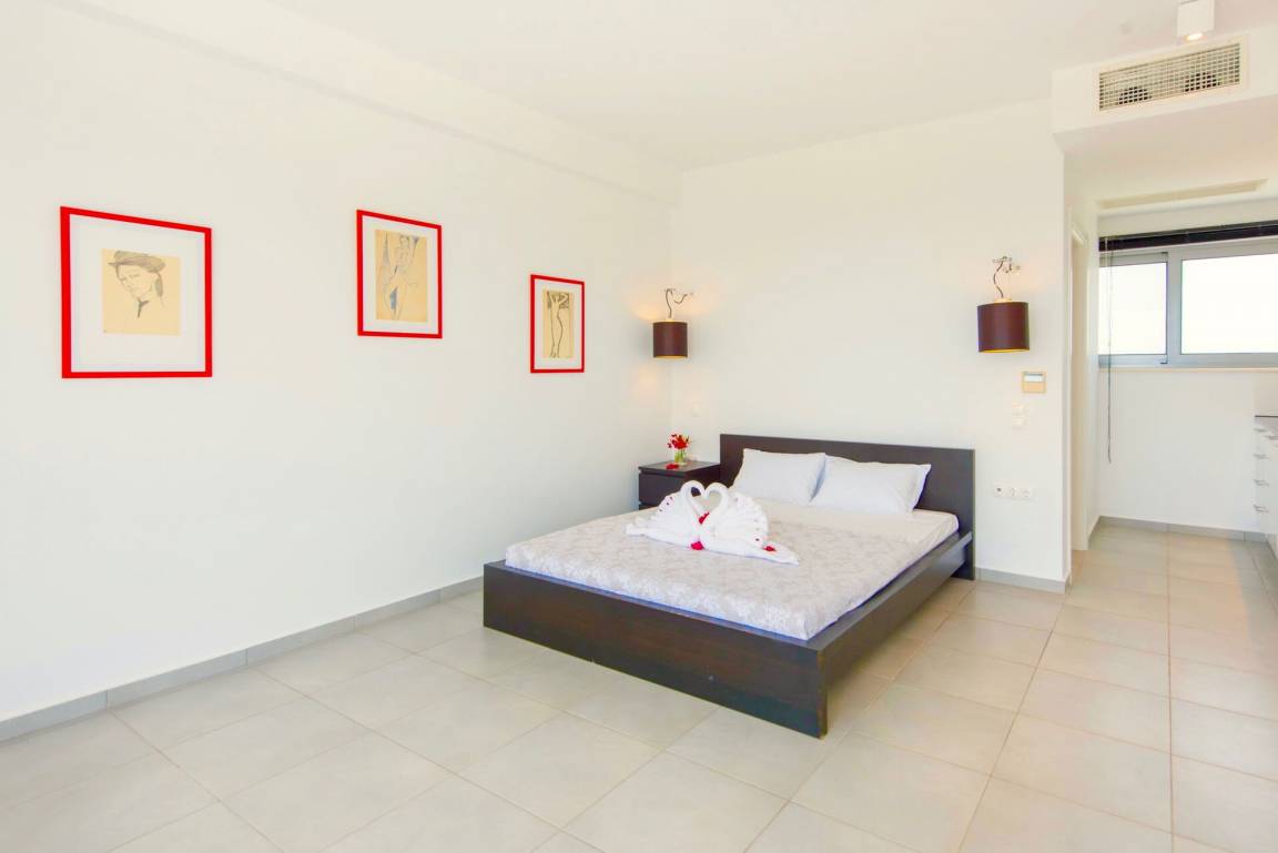 Schlafzimmer mit Bad: Doppelbett, WiFi Internet, Klimaanlage, Waschbecken, WC, Dusche, Bügeleisen, Fön, Waschmaschine, Ausgang auf den Balkon.