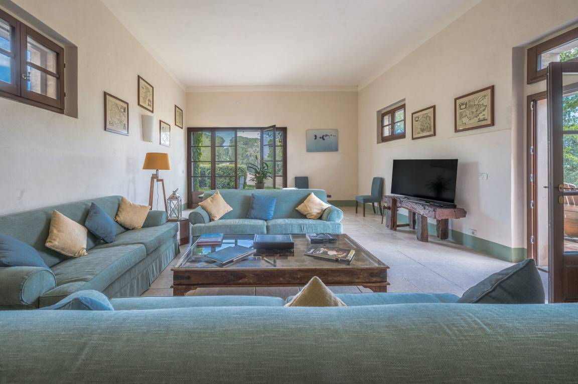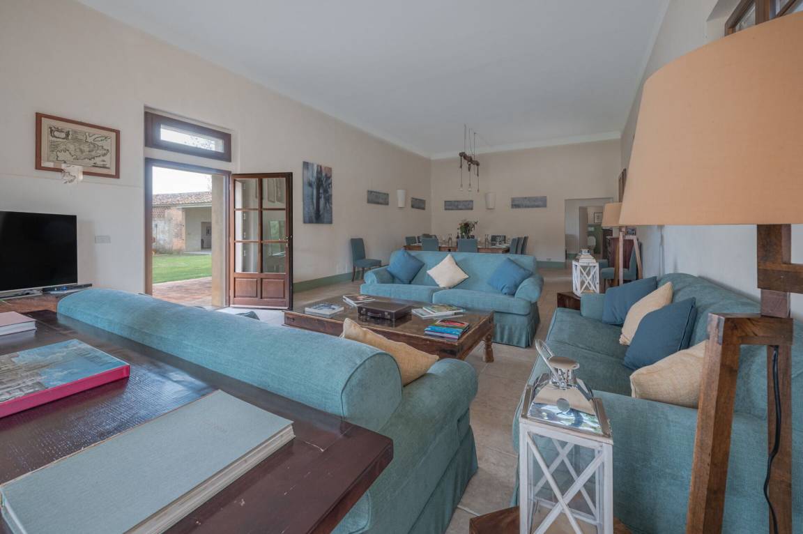 Wohnzimmer: drei Sofas, Esstisch (Personen: 20), WiFi Internet, TV, Video / DVD, Stereoanlage, Ausgang auf den Garten.