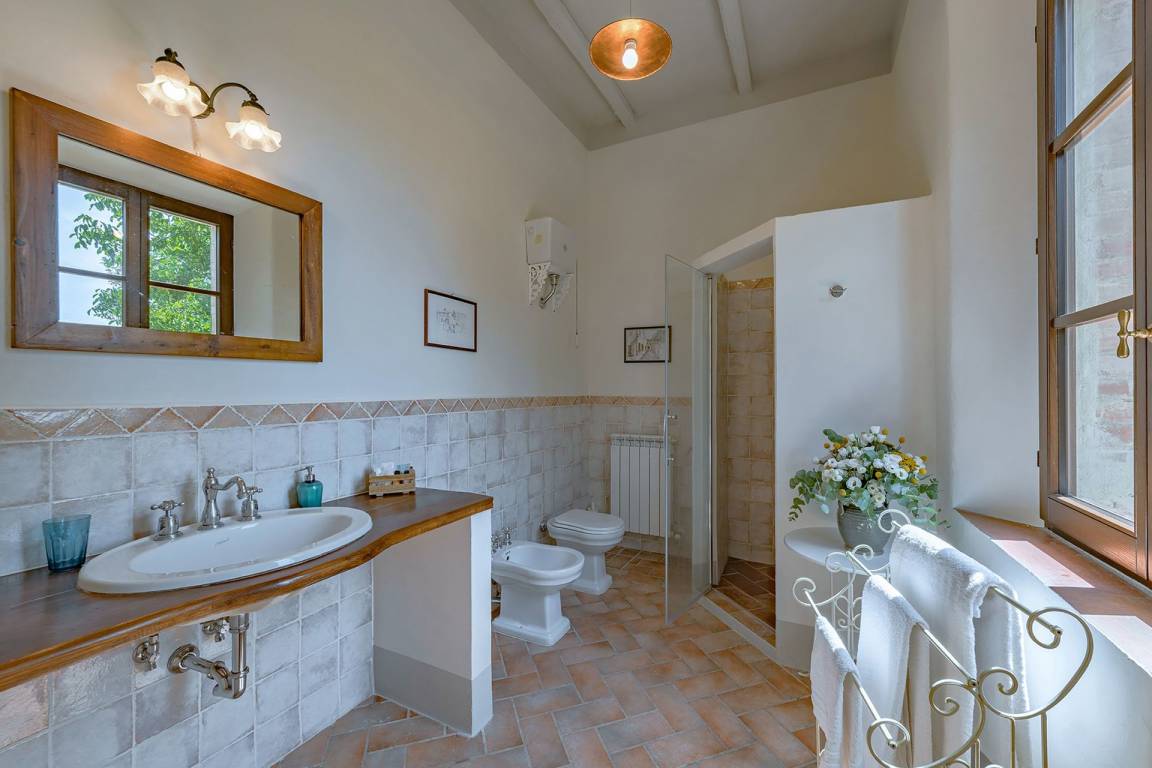 Badezimmer 4: Waschbecken, WC, Bidet, Dusche.