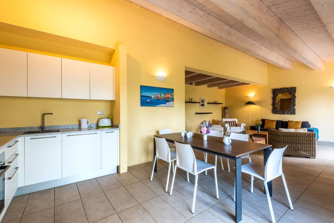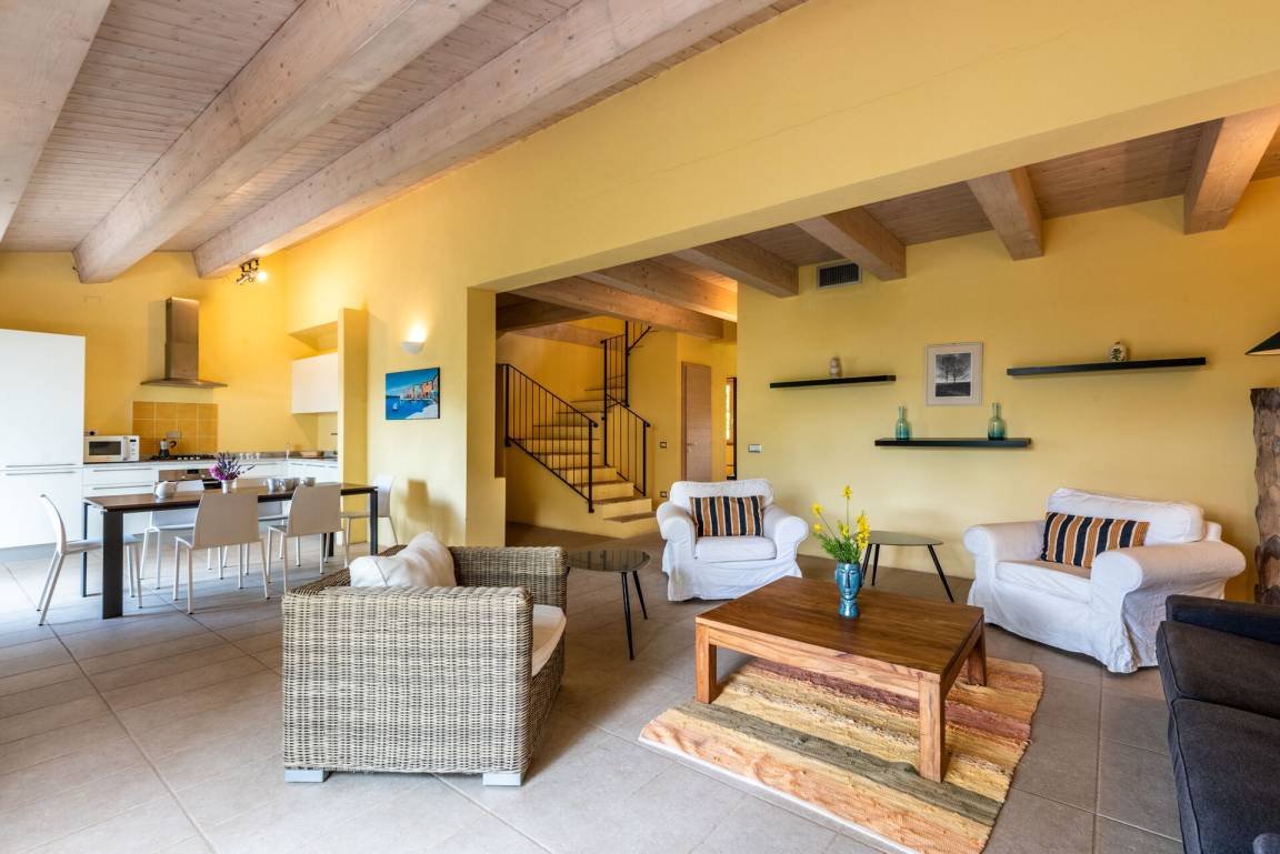 Wohnküche (50 m²): gut ausgestattete Küche, Esstisch, Spülmaschine, Kühlschrank, Tiefkühler, Mikrowelle, Herd, Ofen, Italienische Kaffeemaschine, drei Sofas, Sessel, WiFi Internet, Klimaanlage, Satelliten-TV, TV, Ausgang auf den Garten.