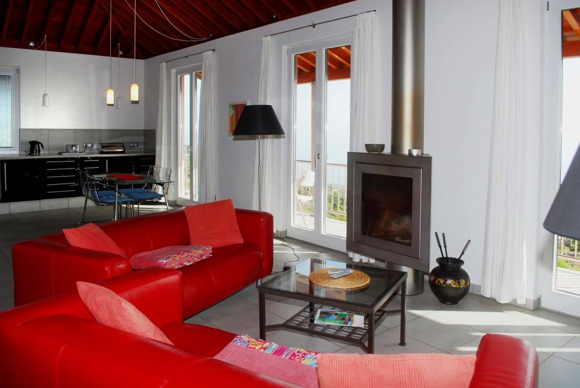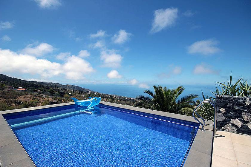 Design-Villa auf der sonnigen Westseite der kanarischen Insel La Palma auf großem Grundstück in ruhiger Alleinlage; privater beheizbarer Außenpool mit Schiebedach, Design-Innenkamin, fantastischer Atlantikblick; kein Durchgangsverkehr, Privatweg zur Ferienvilla.