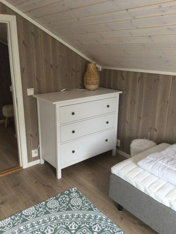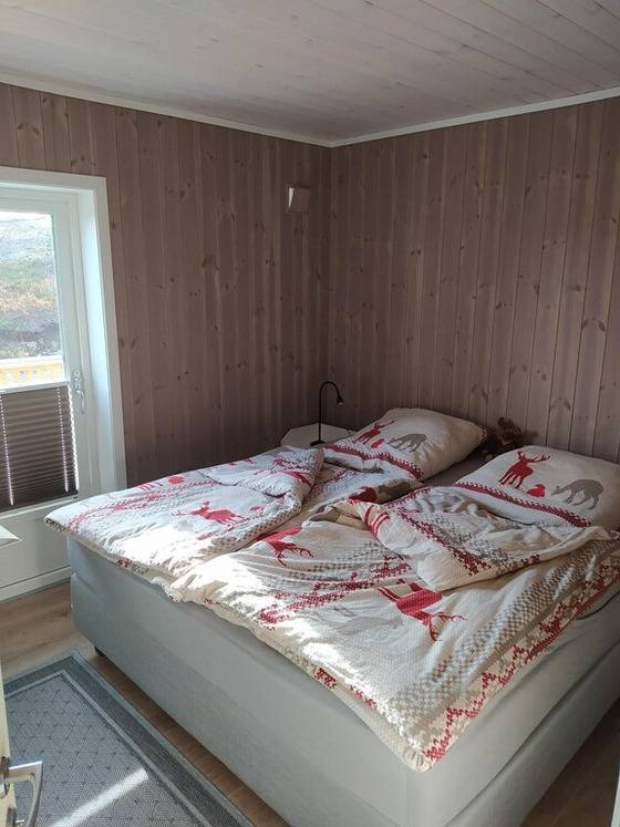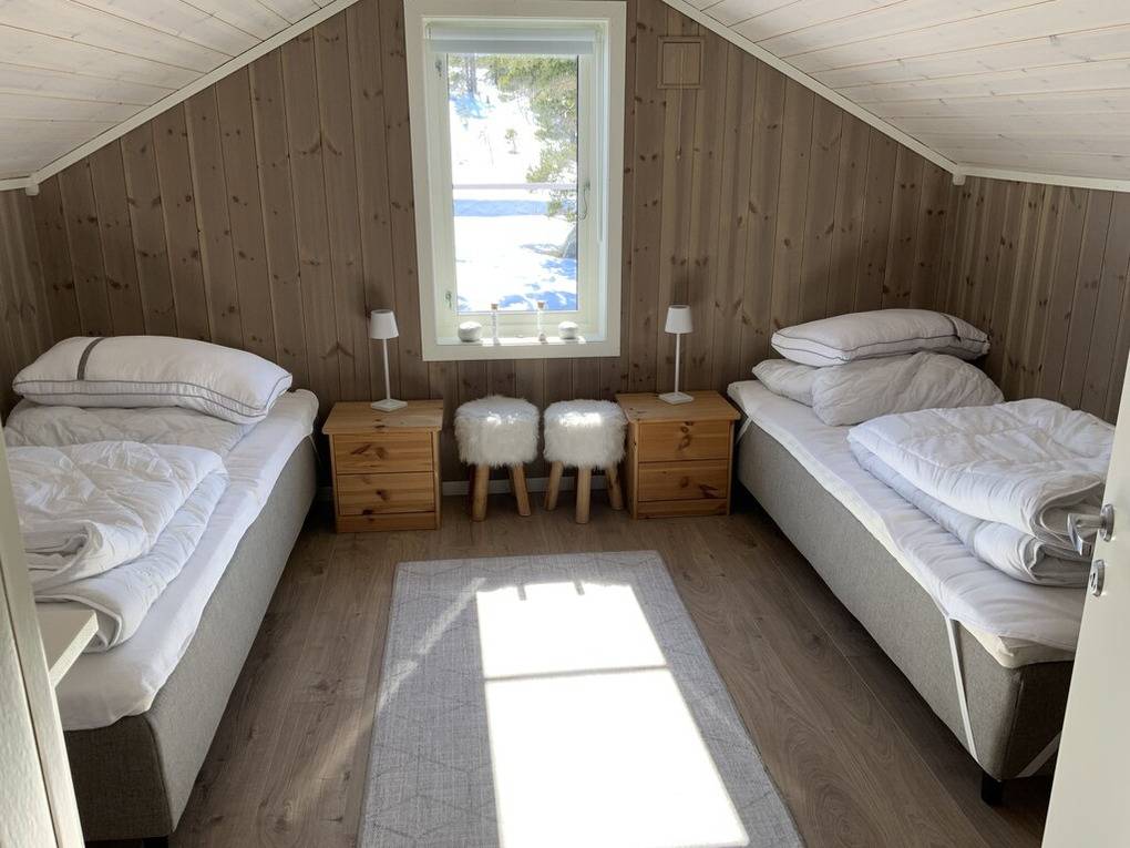 Im Obergeschoss befinden sich zwei Schlafräume. Im einen Schlafraum mit Panoramablick ins Tal auf den Nissersee und den Vråvatnsee stehen ebenfalls zwei Boxspringbetten 0,90 m x 2,00m, die beliebig gestellt werden können, zusammen als Doppelbett oder einzeln . Im 2. Schlafraum stehen zwei Boxspringbetten 0,80m x 2,00m ebenfalls beliebig stellbar. Beide Schlafräume verbindet ein kleiner Flur, indem sich auch ein kleines Gäste-WC befindet.