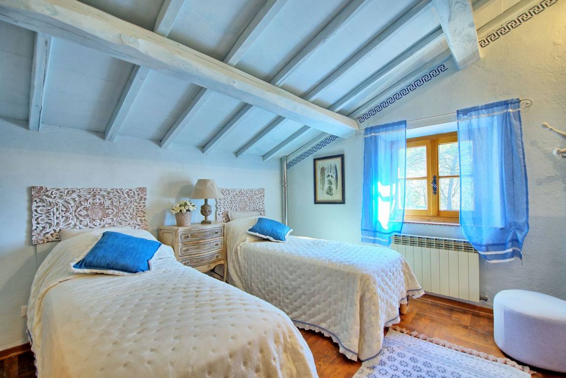 Erste Stock: kleines Wohnzimmer mit Doppelschlafsofa, Schlafzimmer mit Doppelbett (Klimaanlage), Bad mit Dusche, Schlafzimmer mit 2 Einzelbetten (Klimaanlage) und eigenem Bad mit Dusche.