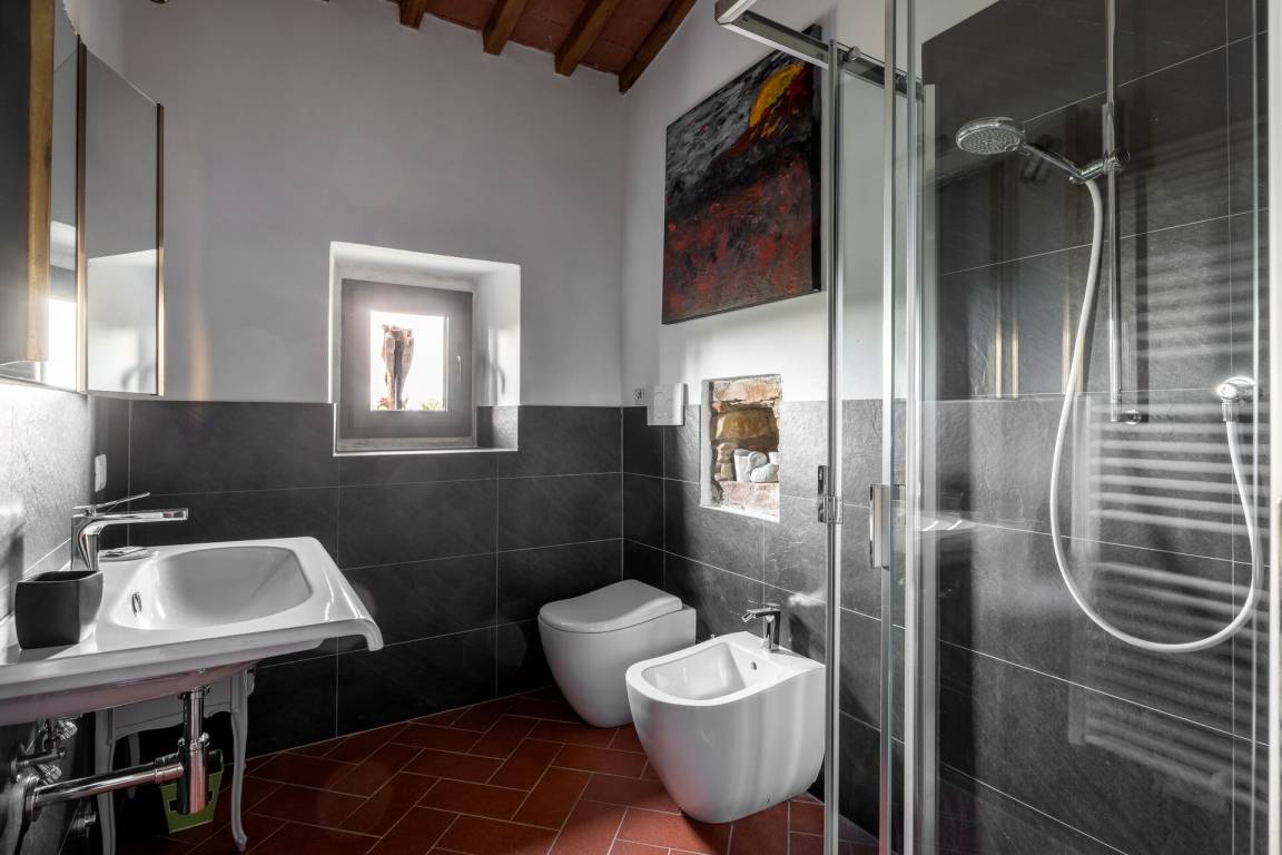 Badezimmer: Waschbecken, WC, Bidet, Dusche, Fön, WiFi Internet.