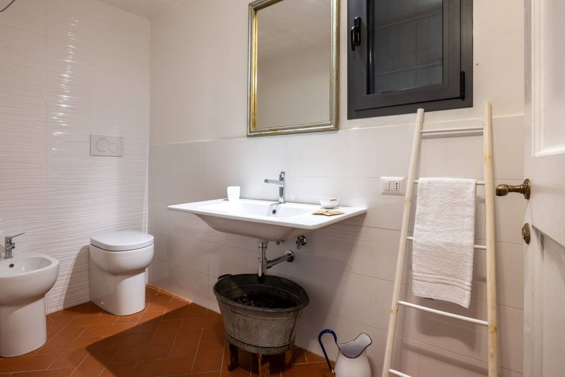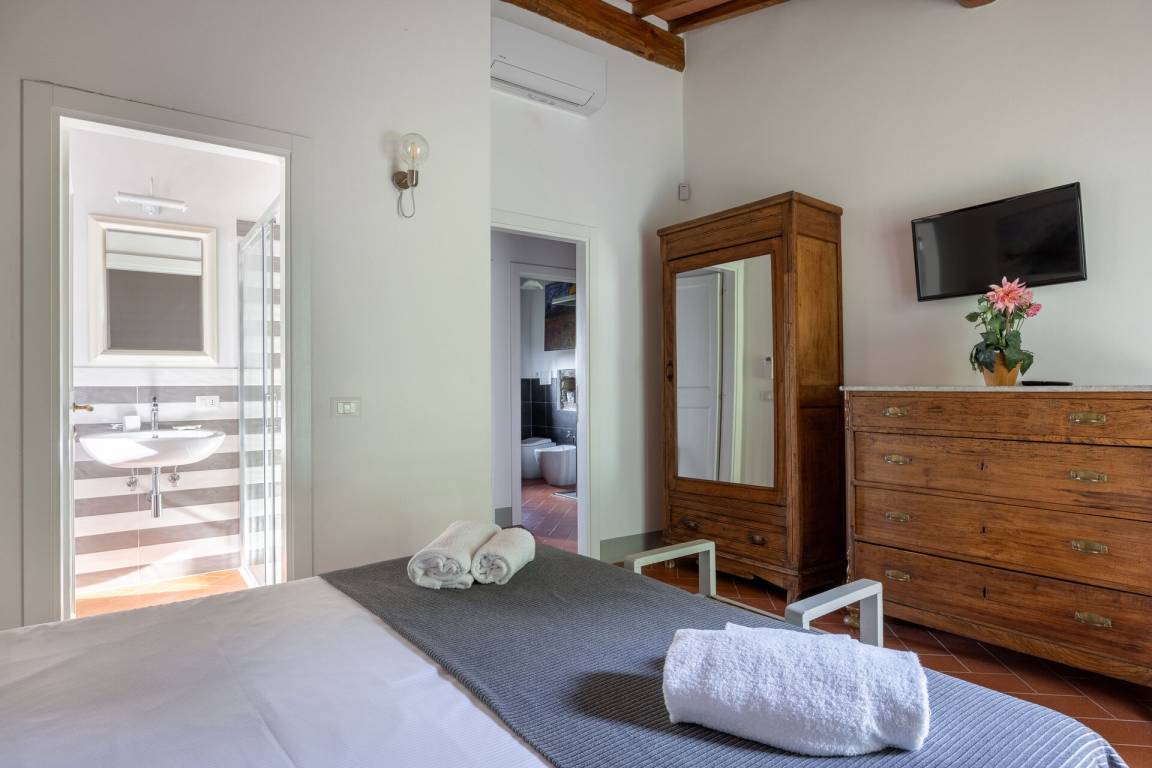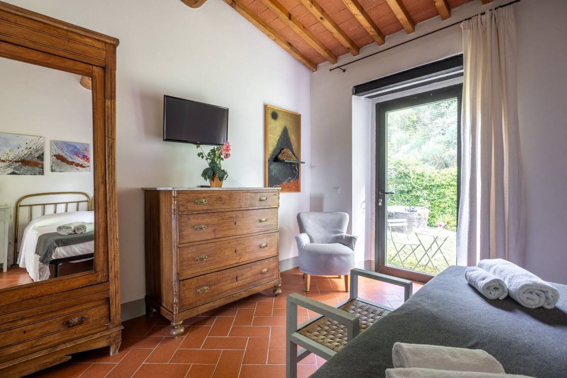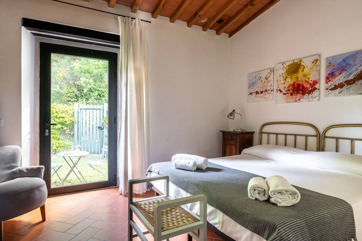 Schlafzimmer mit Bad: Doppelbett, WiFi Internet, Klimaanlage, Satelliten-TV, Waschbecken, WC, Bidet, Dusche, Fön, Ausgang auf den Garten.