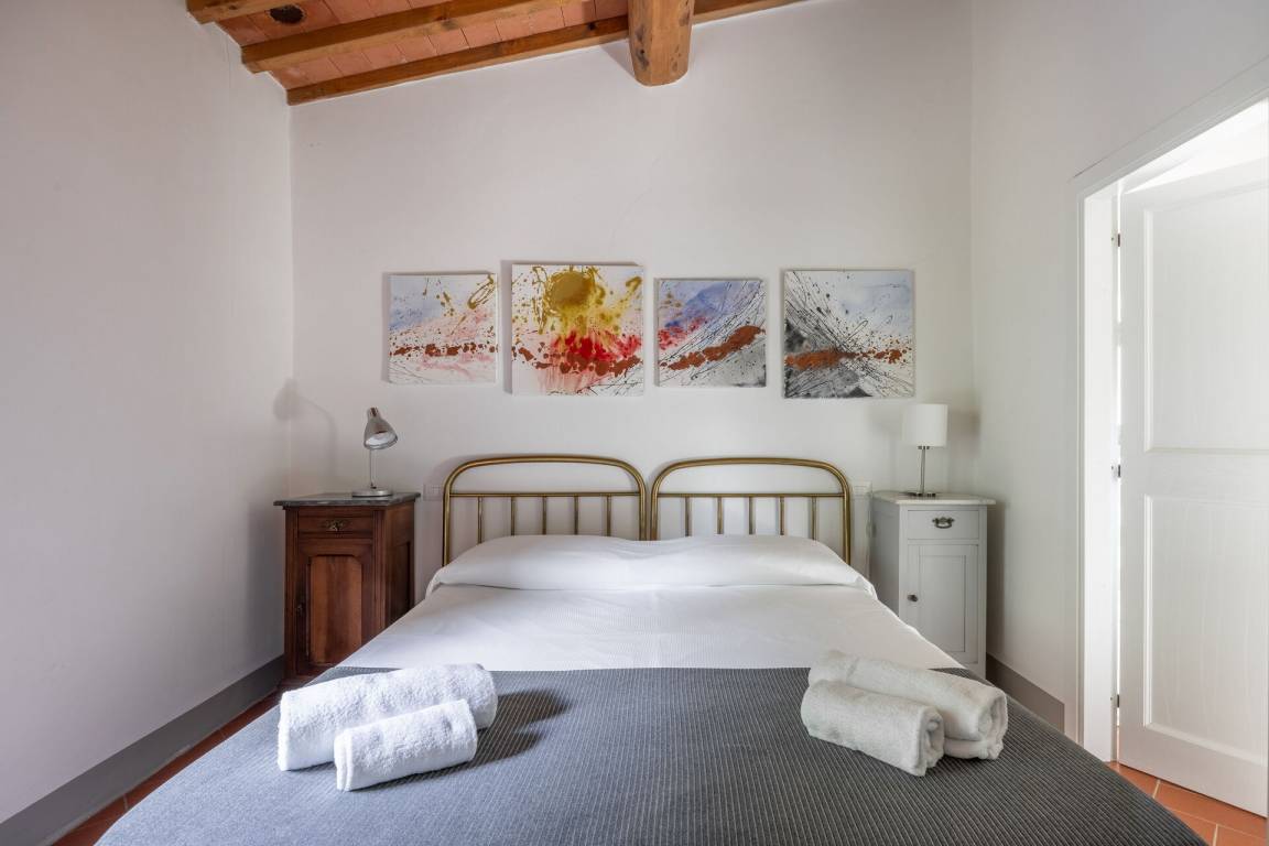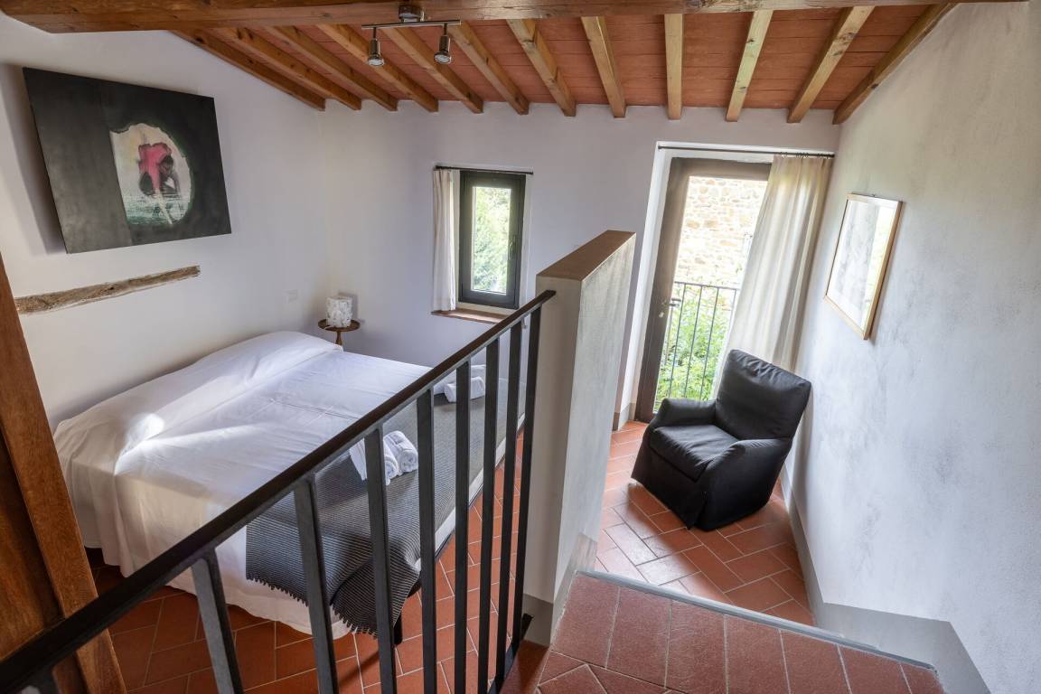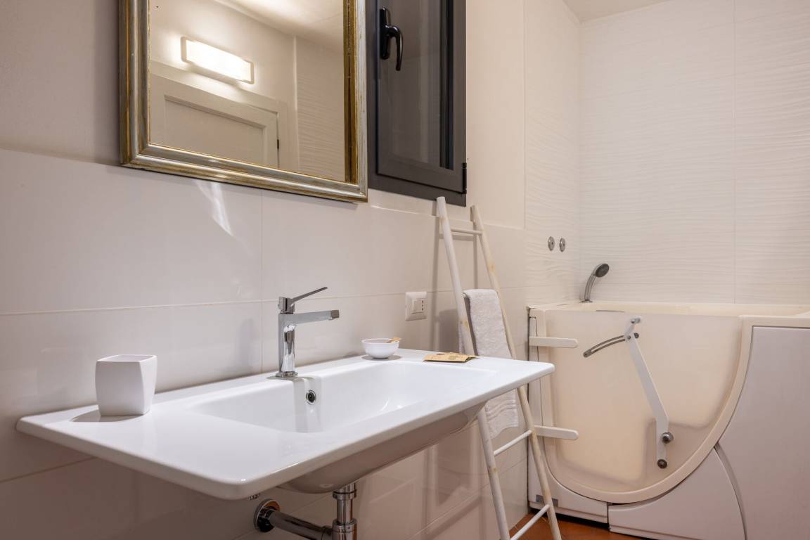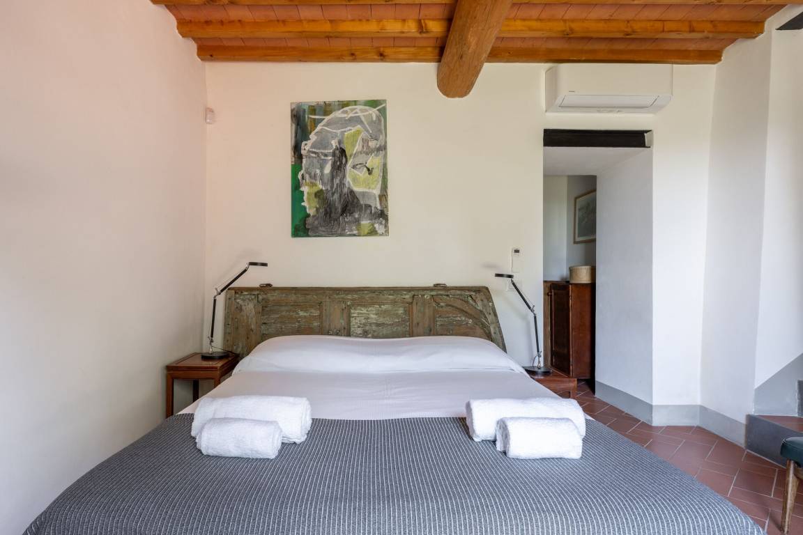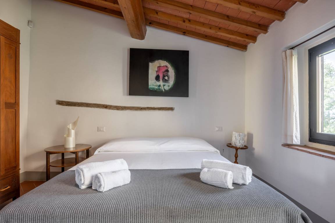 Schlafzimmer mit Bad: Doppelbett, WiFi Internet, Klimaanlage, Satelliten-TV, Waschbecken, WC, Bidet, Dusche, Fön, Ausgang auf den Garten.