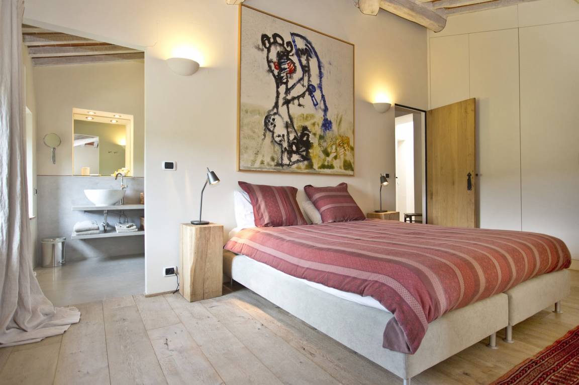 Schlafzimmer mit Bad 1: großes Doppelbett, WiFi Internet, Klimaanlage, Sessel, Doppelwaschbecken, WC, Badewanne, Dusche, Fön.
