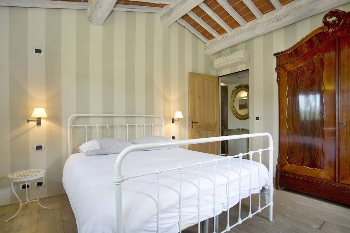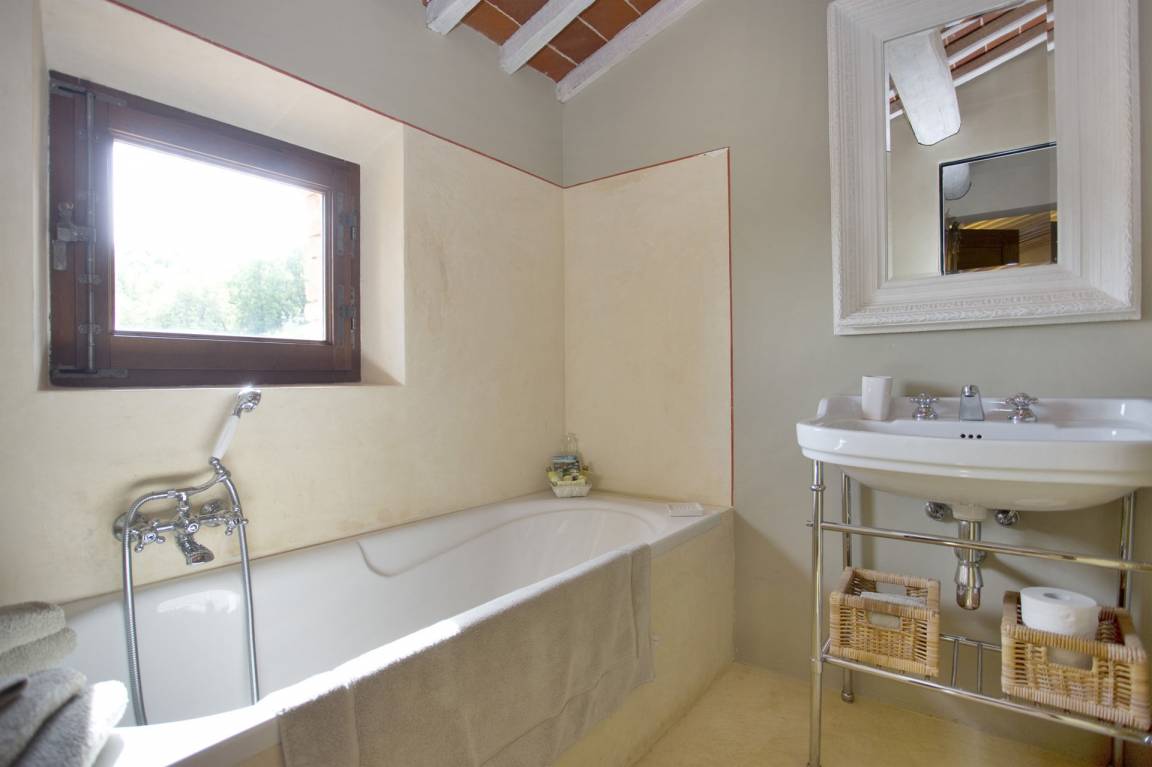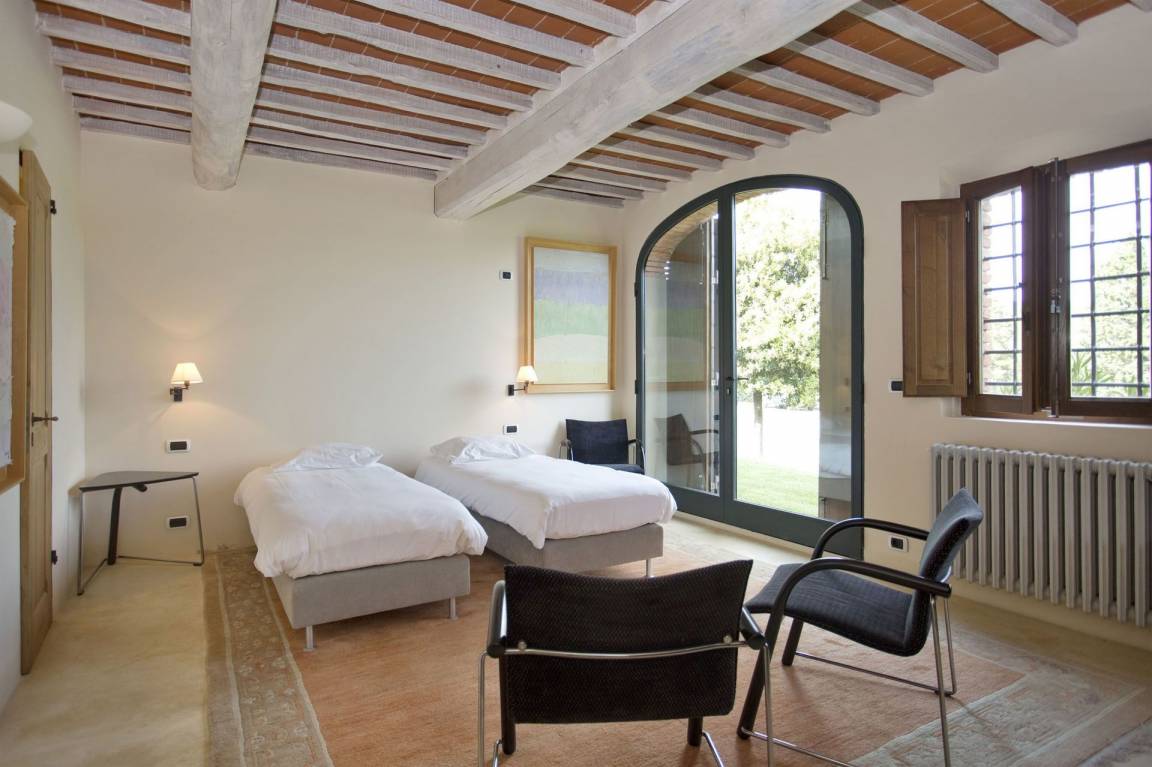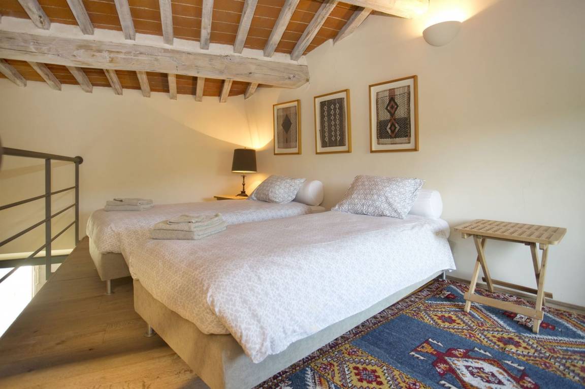 Schlafzimmer mit Bad 1: vier Einzelbetten, WiFi Internet, Klimaanlage, Waschbecken, WC, Bidet, Dusche, Fön, Ausgang auf den Garten, Galerie.