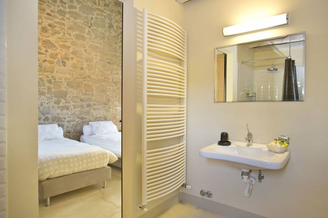 Schlafzimmer mit Bad 2: zwei Einzelbetten, WiFi Internet, Waschbecken, WC, Dusche, Fön, Ausgang auf den Garten.