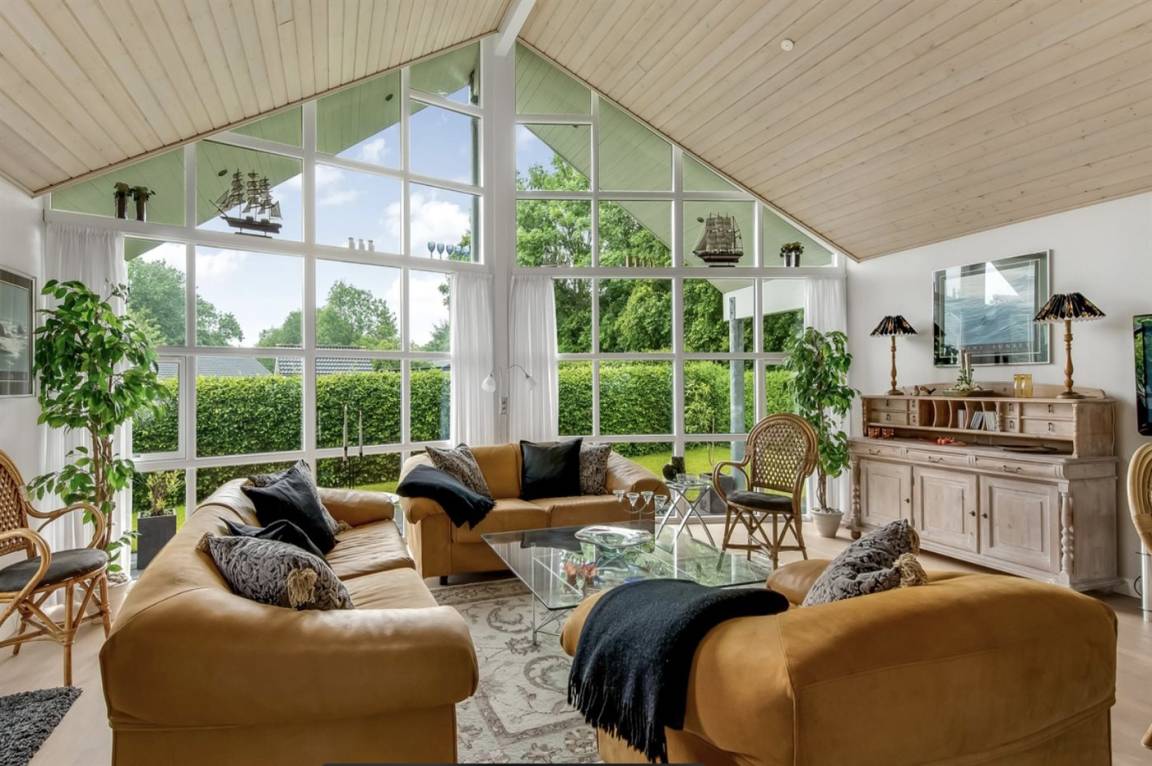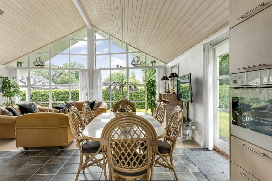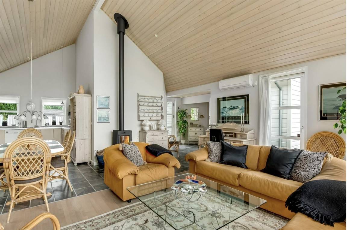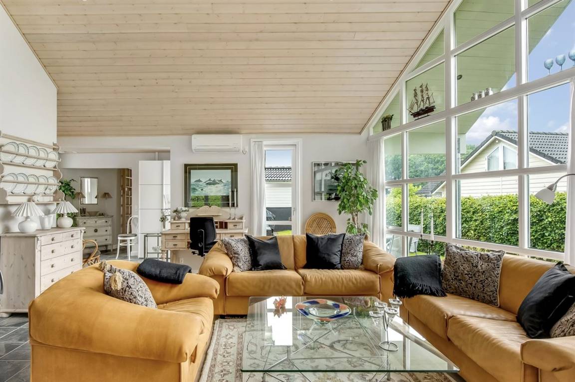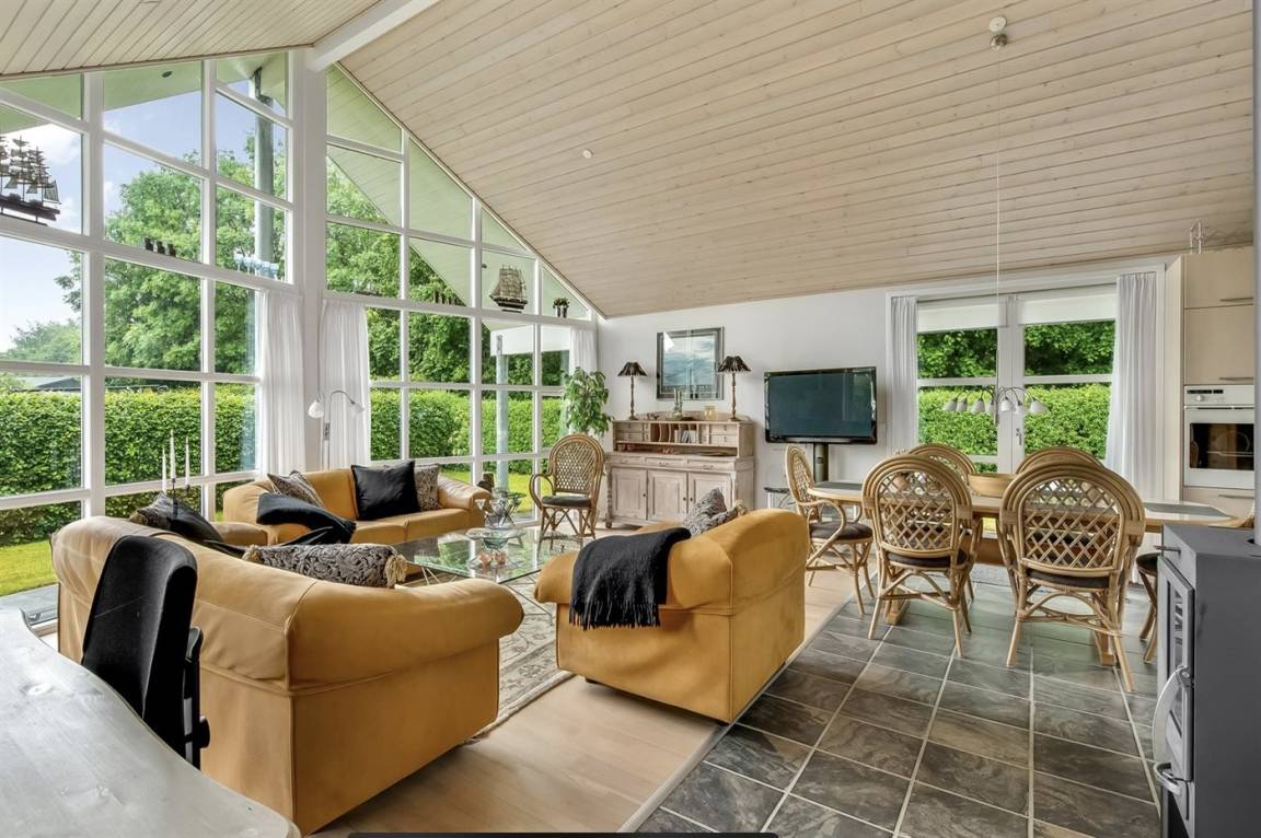 Das geräumige und sehr gemütliche Ferienhaus verfügt über eine Wohnküche mit einer beeindruckenden Fensterfront vom Boden bis zur Decke, durch die das Licht hereinströmt und euch einen herrlichen Blick in den Garten schenkt. Der große Wohnbereich bildet den perfekten Rahmen für euer Urlaubszusammensein, wo ihr euch versammeln und die Gesellschaft miteinander genießen könnt. Hier findet ihr eine schöne Sofagarnitur in frischem Orange, die zusammen mit dem Essbereich zu vielen gemütlichen Stunden mit gutem Essen, langen Gesprächen oder einem Spiel am Küchentisch einlädt.