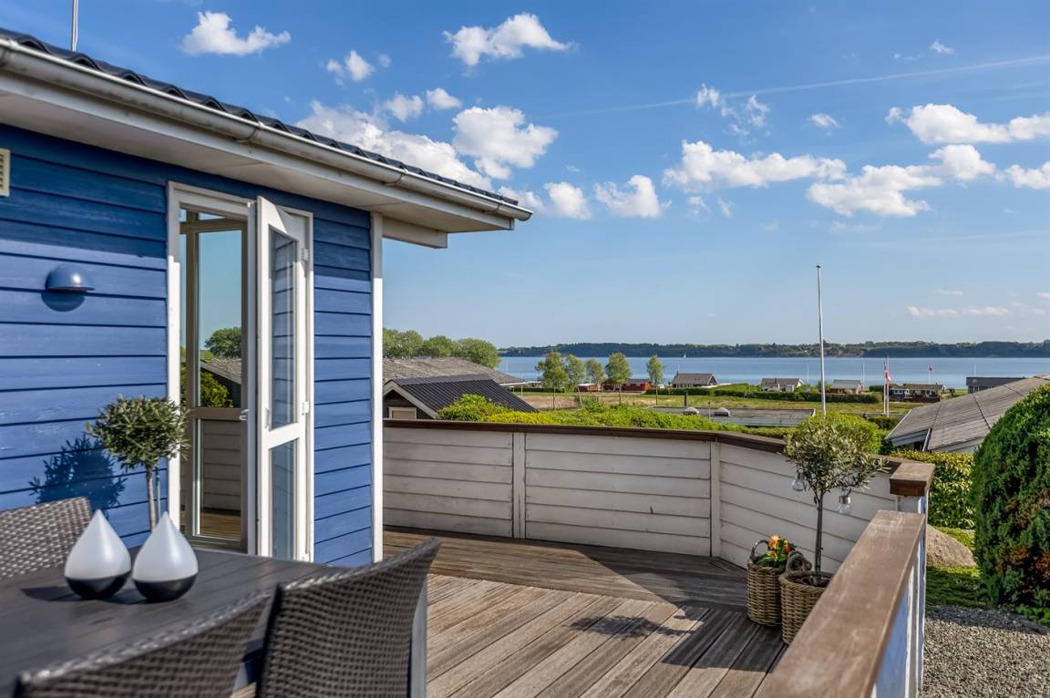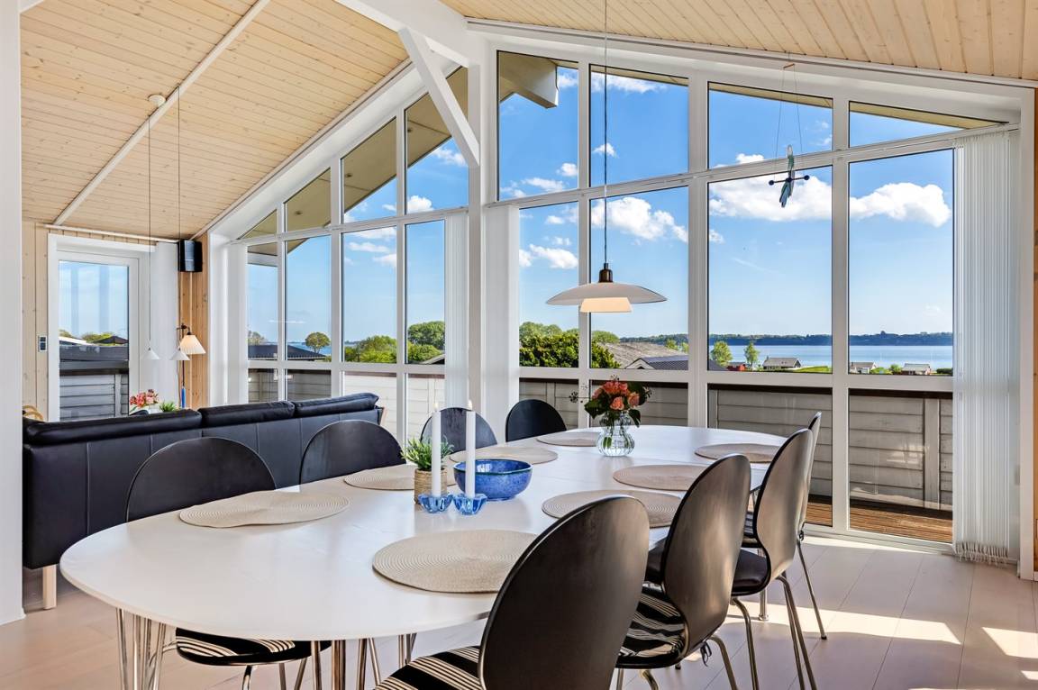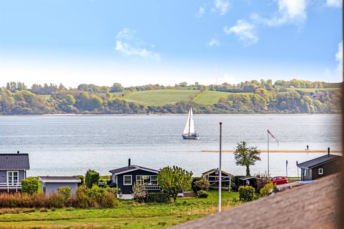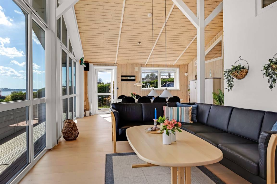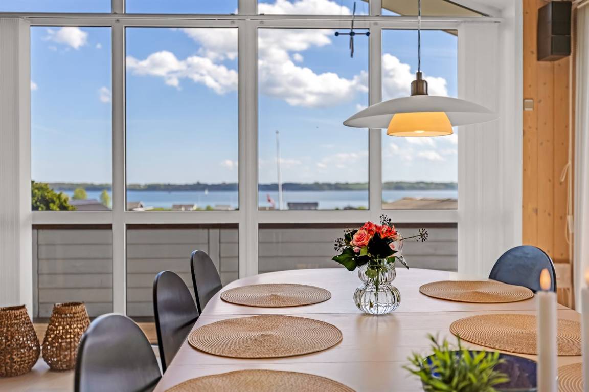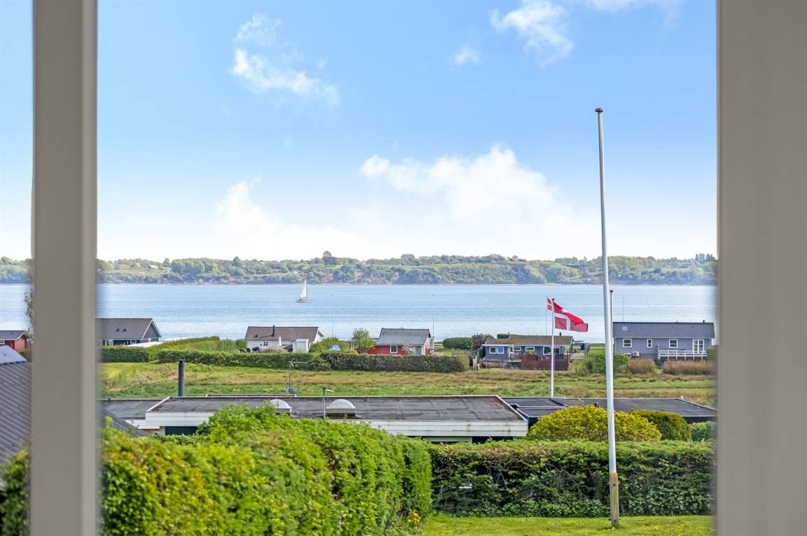 Ferienhaus in Skarrev mit Panoramablick über den Aabenraa-Fjord, nur wenige Schritte von einem schönen, kinderfreundlichen Sandstrand entfernt.