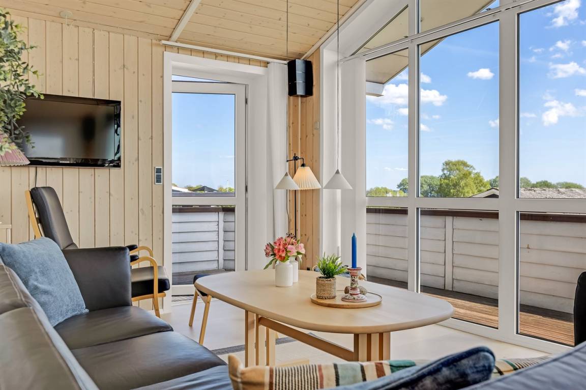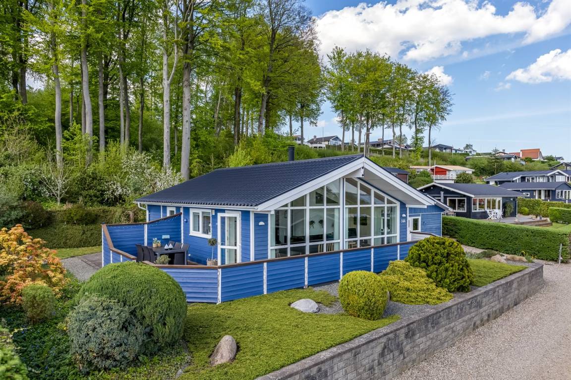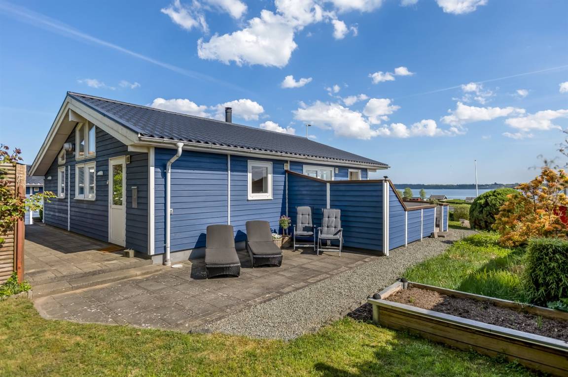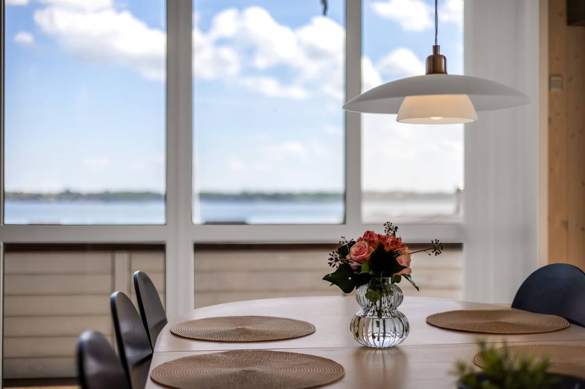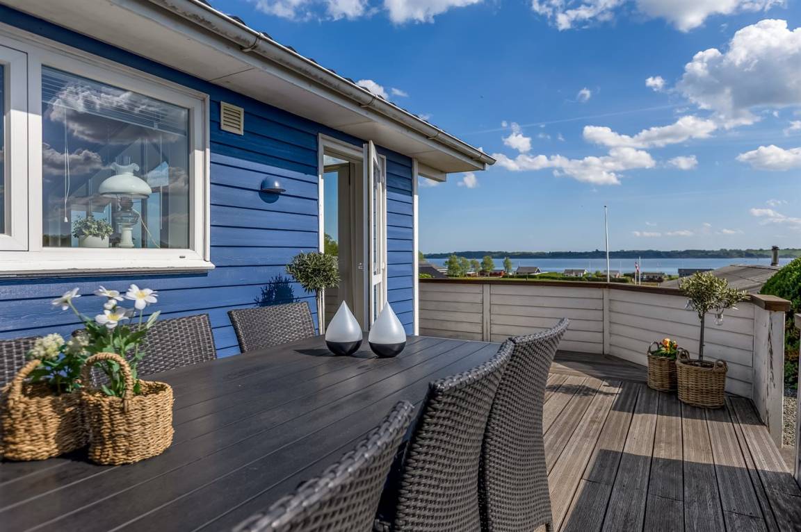 Ferienhaus in Skarrev mit Panoramablick über den Aabenraa-Fjord, nur wenige Schritte von einem schönen, kinderfreundlichen Sandstrand entfernt.