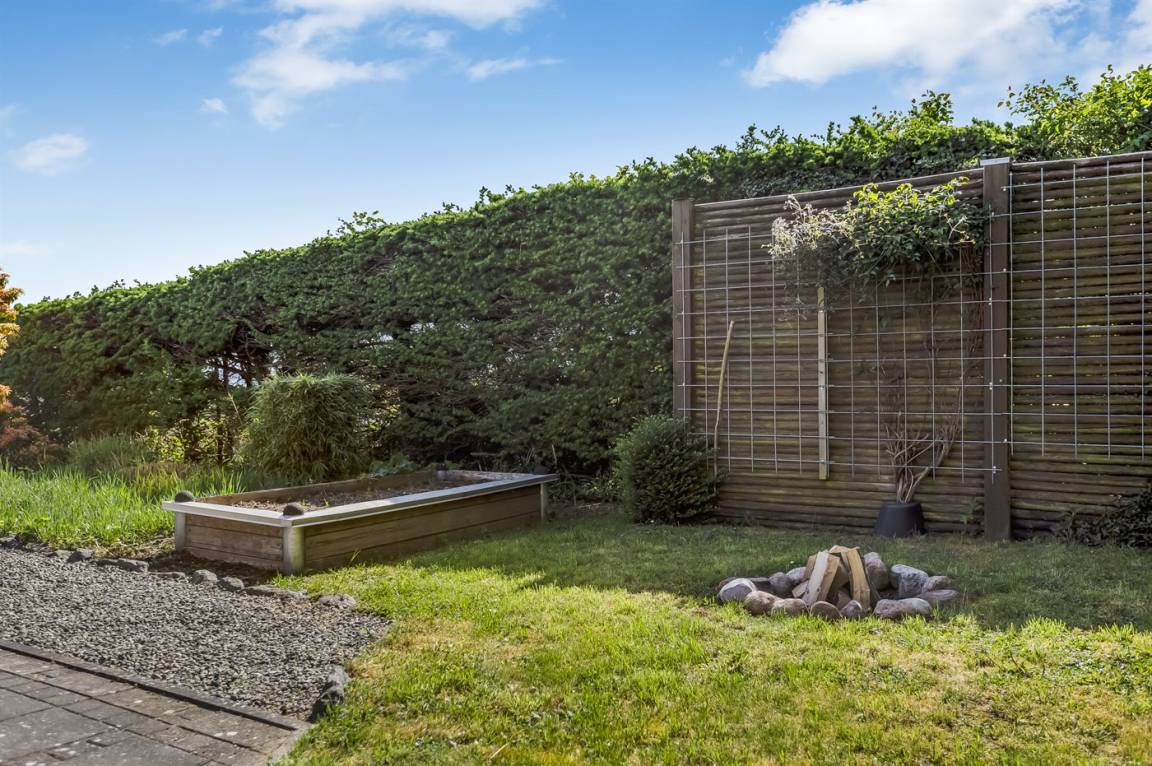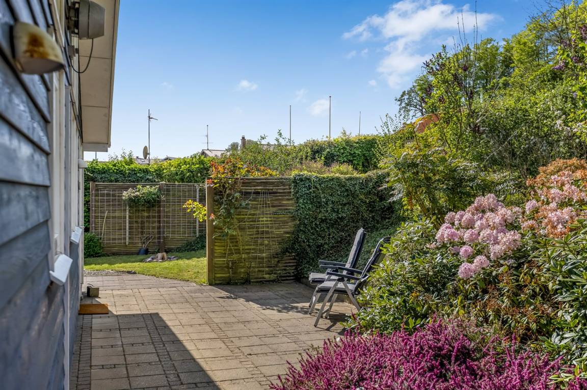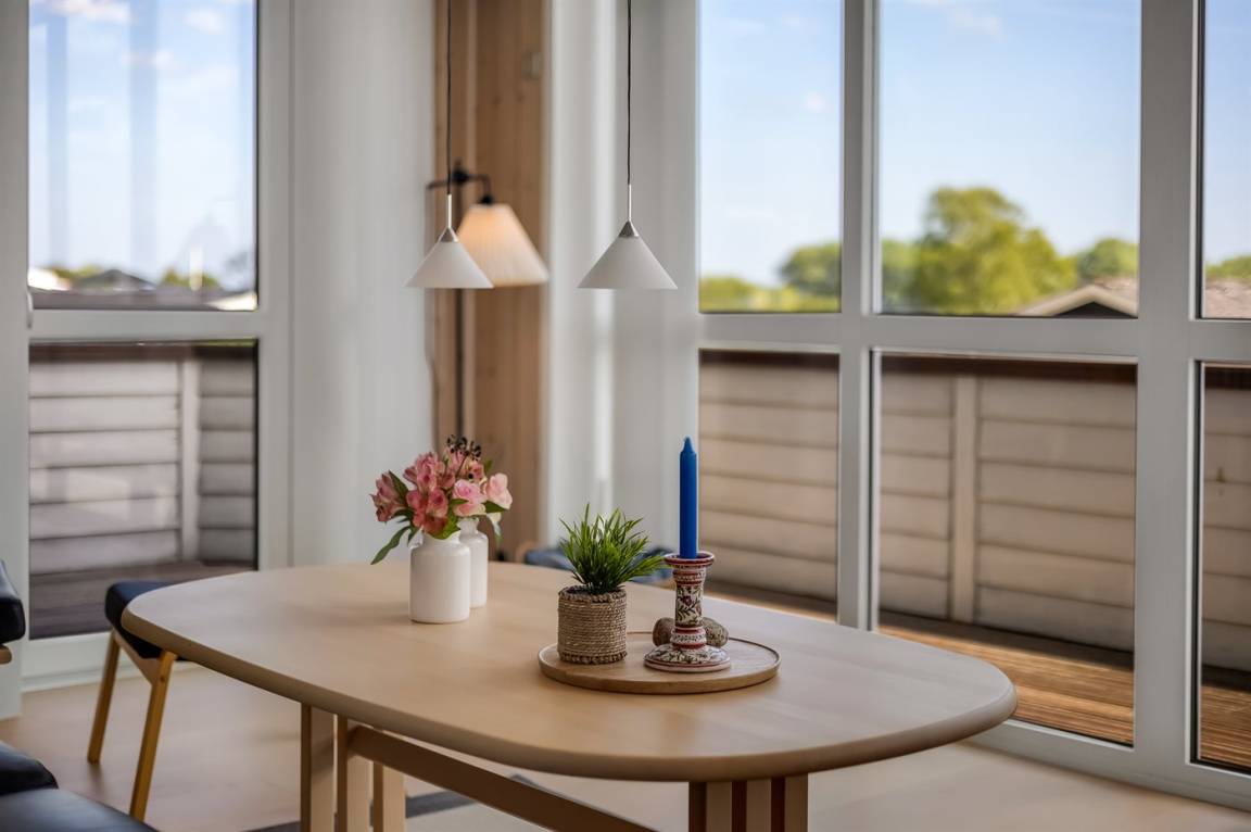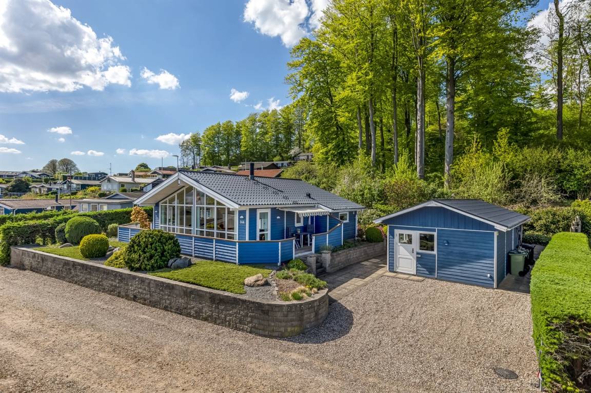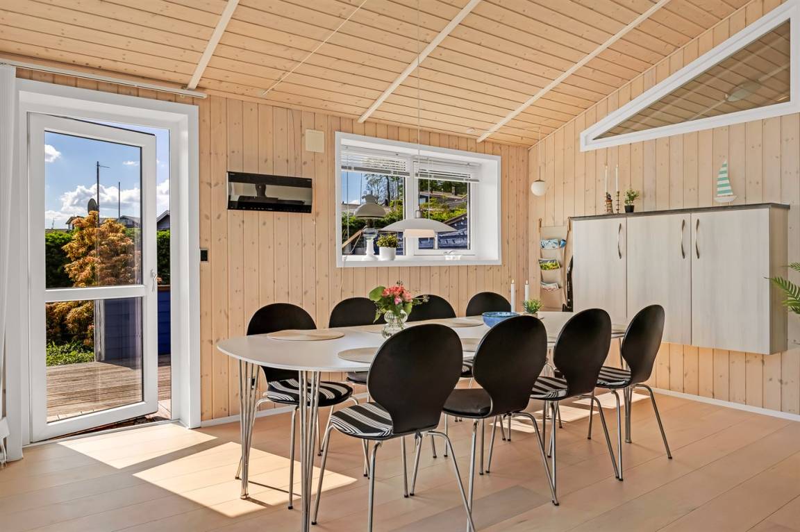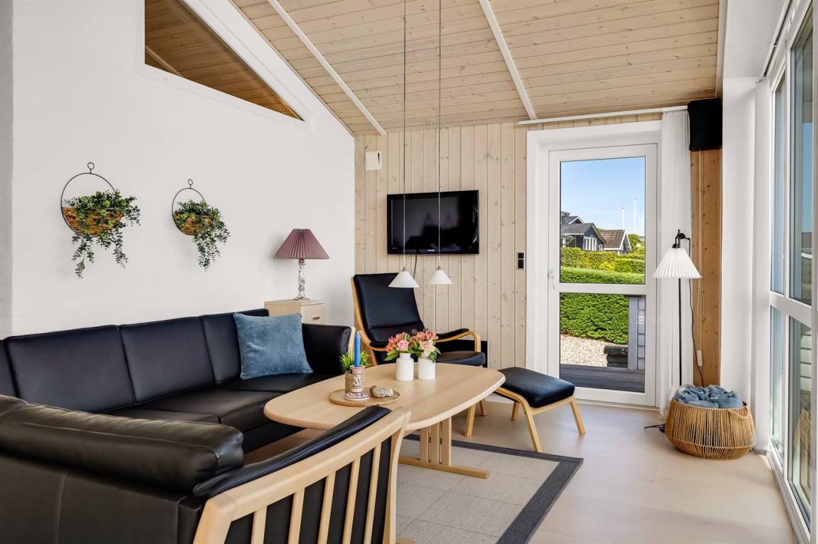 Ferienhaus in Skarrev mit Panoramablick über den Aabenraa-Fjord, nur wenige Schritte von einem schönen, kinderfreundlichen Sandstrand entfernt.