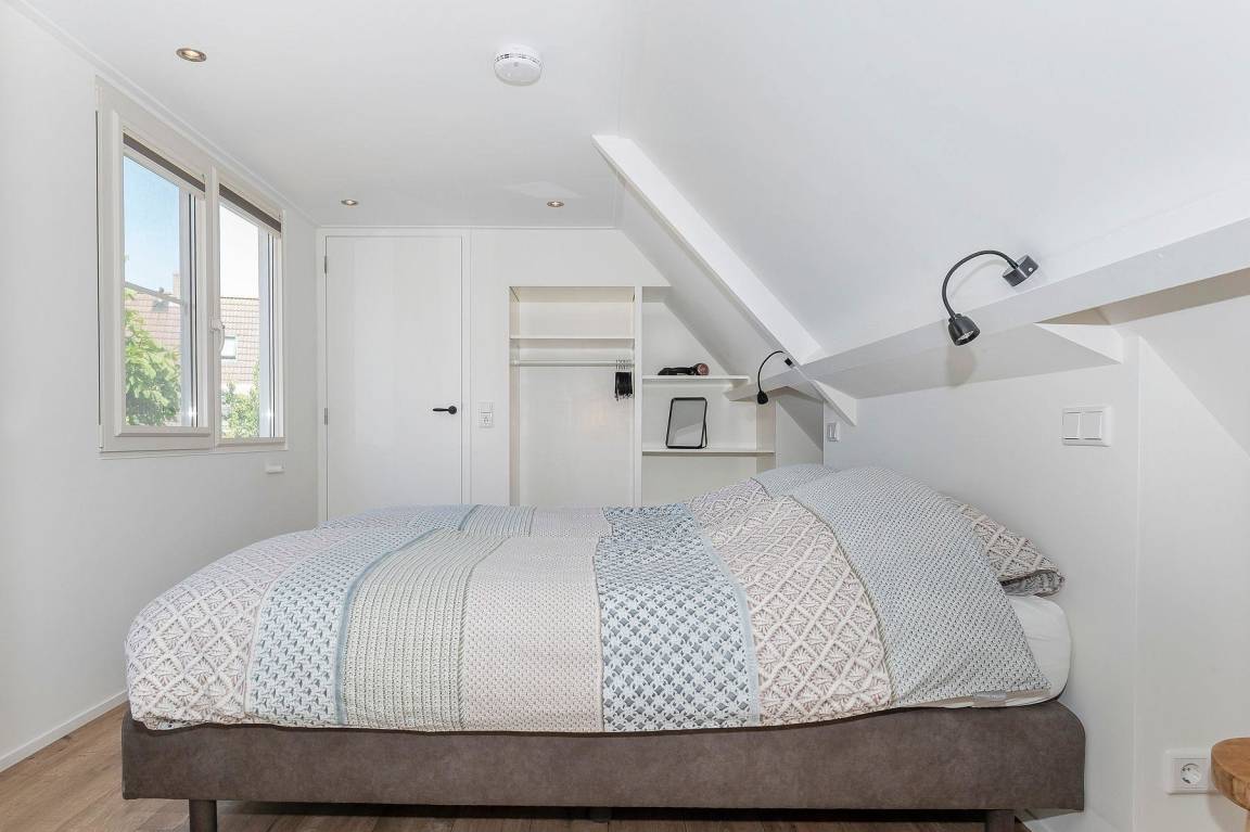 Das Schlafzimmer mit Klimaanlage hat 2 schöne 90 x 200 cm Boxspringbetten und bei Ihrer Ankunft ist Ihr Bett gemacht. Unter der Schräge gibt es Platz für Ihre Tasche oder Ihren Koffer. Für Ihre Kleidung gibt es einen offenen Kleiderschrank mit Hänge- und Liegefläche. Am Kopfende des Bettes befinden sich Steckdosen und Leselampen. Das Zimmer hat Verdunklungsvorhänge und Insektenschutzgitter vor den Fenstertüren. Eine Schiebetür führt in die angrenzende Toilette.