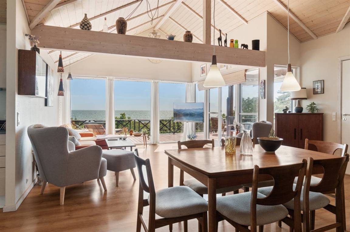 Die Einrichtung des Hauses ist hochwertig, und du kannst hier einen erholsamen Urlaub mit deiner Familie verbringen. Die offene Küche, in der du die Mahlzeiten zubereiten oder dich um die täglichen Aufgaben kümmern kannst, ist dezent in das große Wohnzimmer mit den herrlichen Panoramafenstern integriert. Die hellen Wände, Böden und Decken verleihen dem Haus ein einladendes Ambiente, und es gibt genug Platz fürs gemütliche Beisammensein, Spiele oder ein gutes Buch. Vielleicht nimmst du ja auch dein Strickzeug mit in den Urlaub.