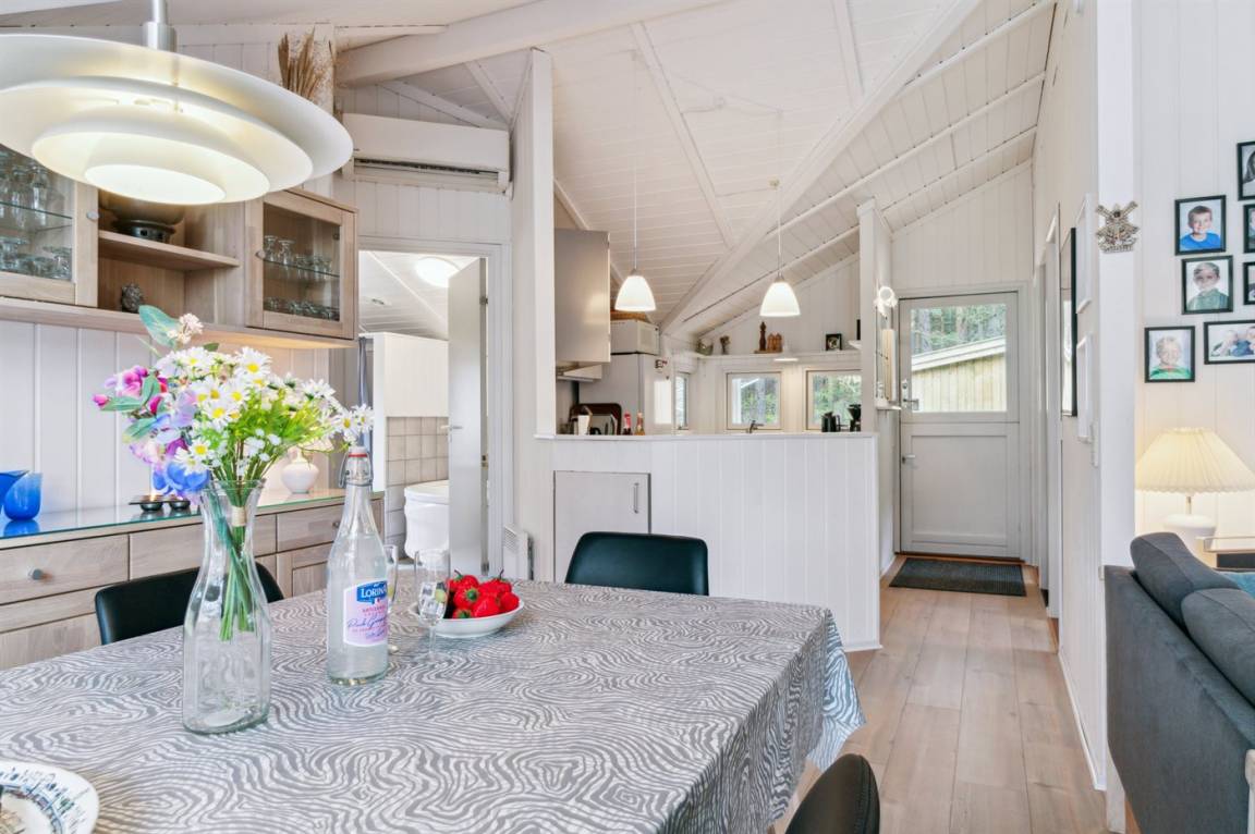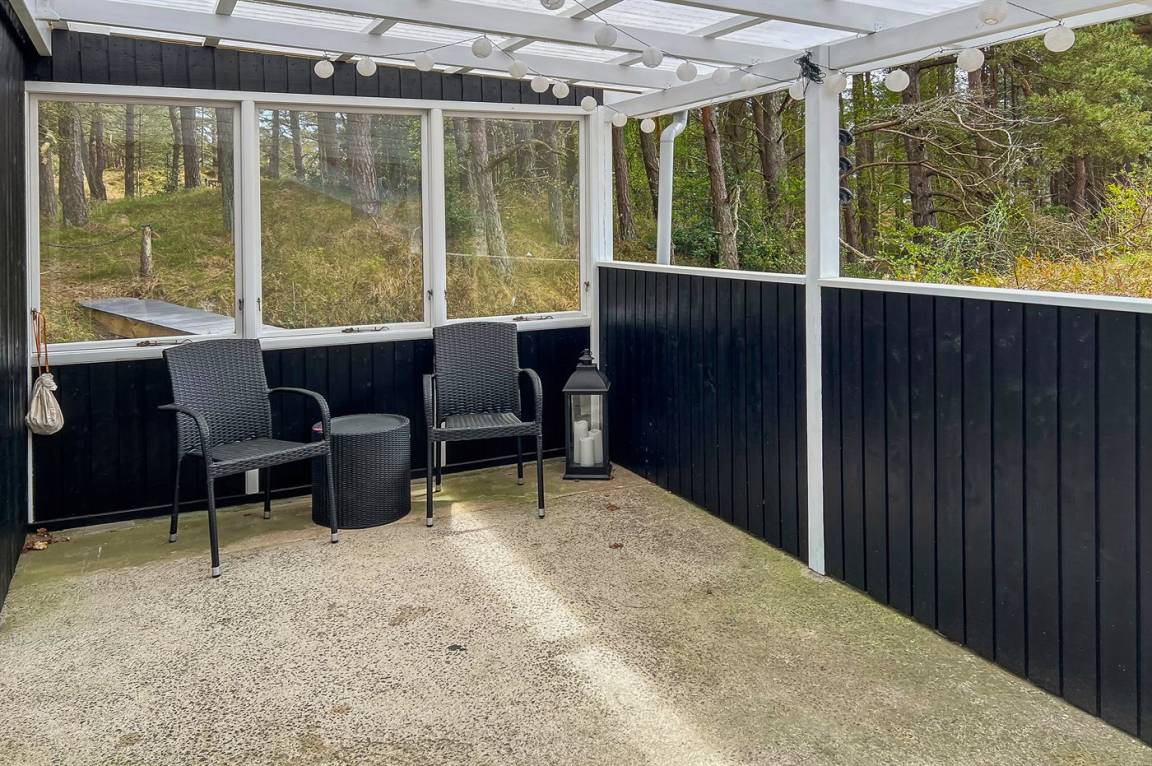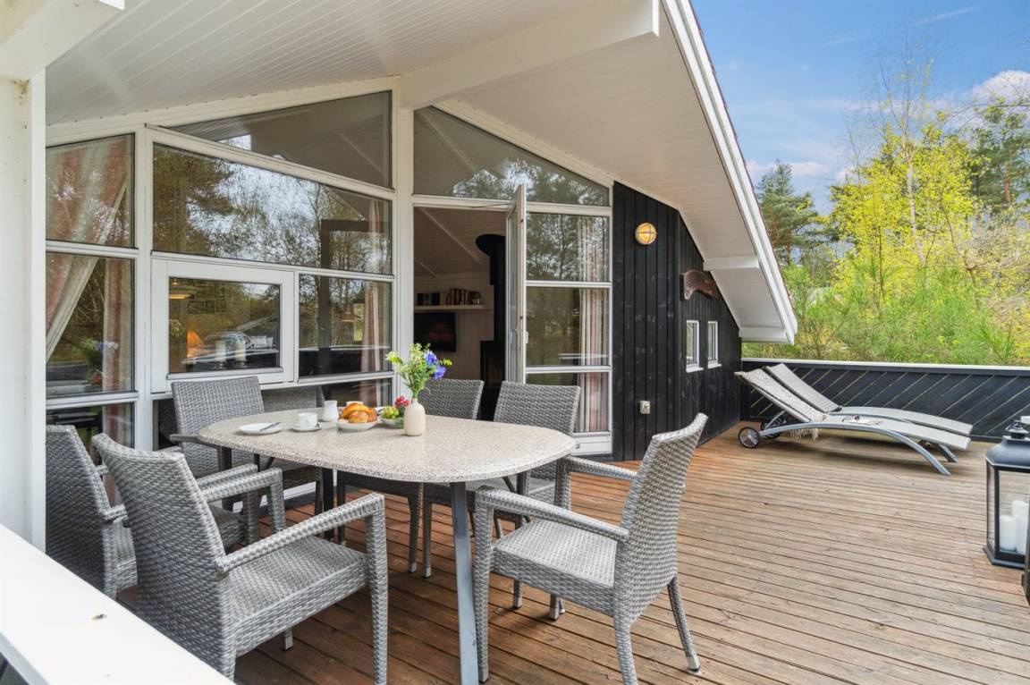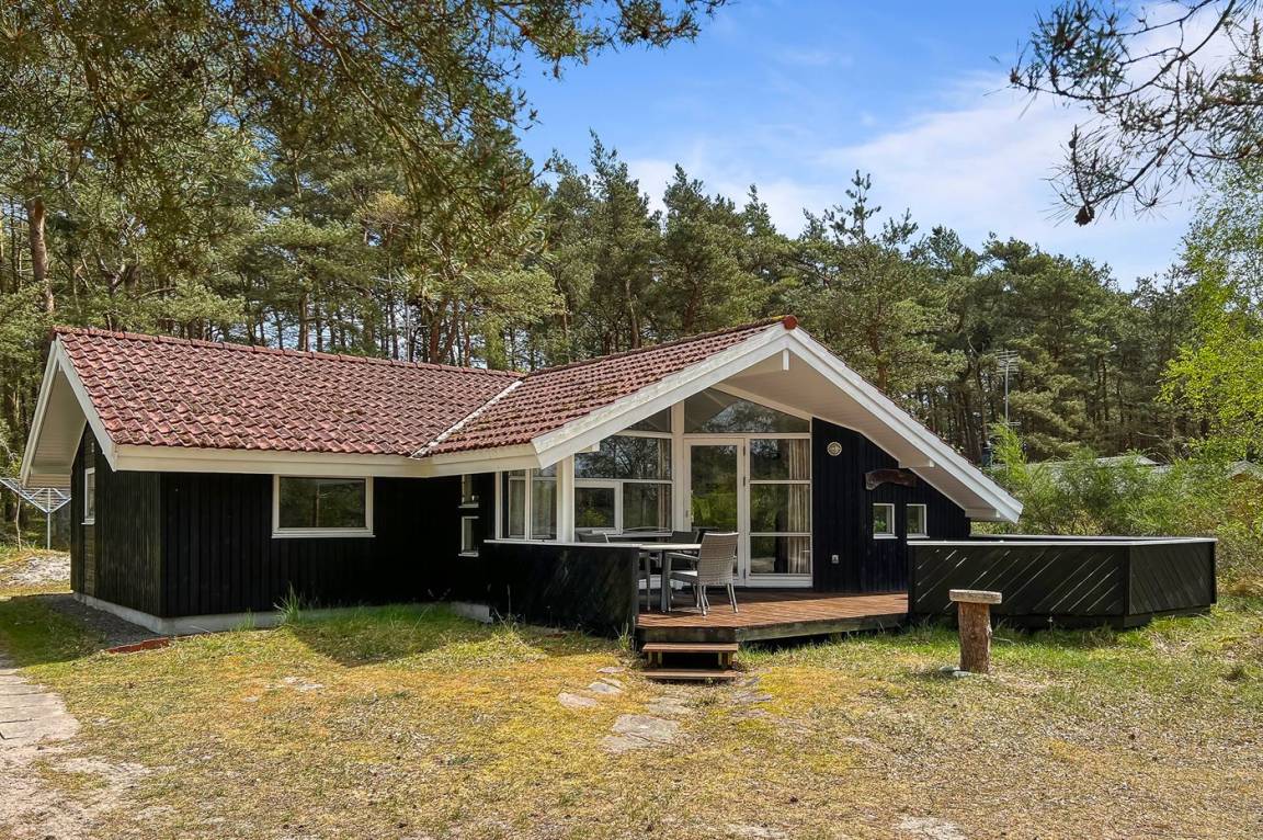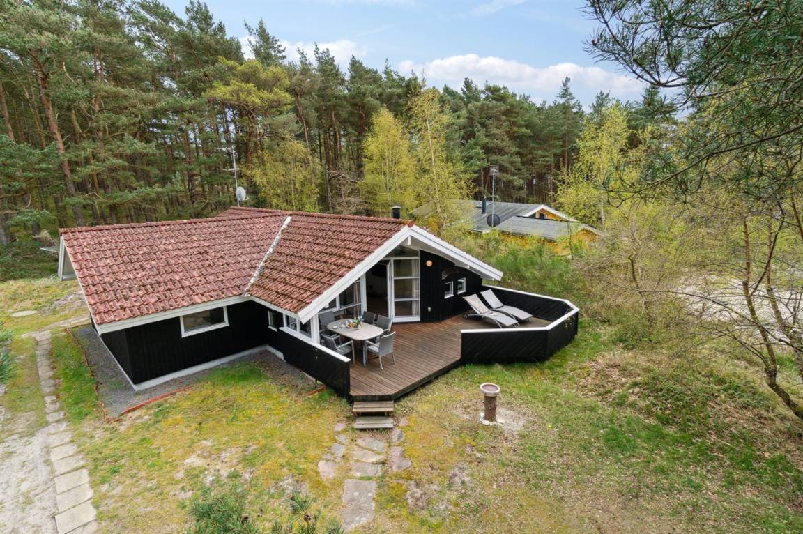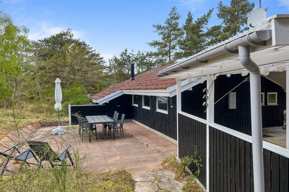 Strandnahes, gut ausgestattetes Ferienhaus in schöner Lage in einem gemütlichen Ferienhausgebiet. Das Haus grenzt an ein geschütztes Waldgebiet an, sodass man eine ungestörte Terrasse hinter dem Haus findet, auf der man die Sonne in vollen Zügen genießen kann. Die Nachmittagsterrasse auf der anderen Seite des Hauses ist teilweise überdacht und gut möbliert mit passenden Gartenmöbeln.