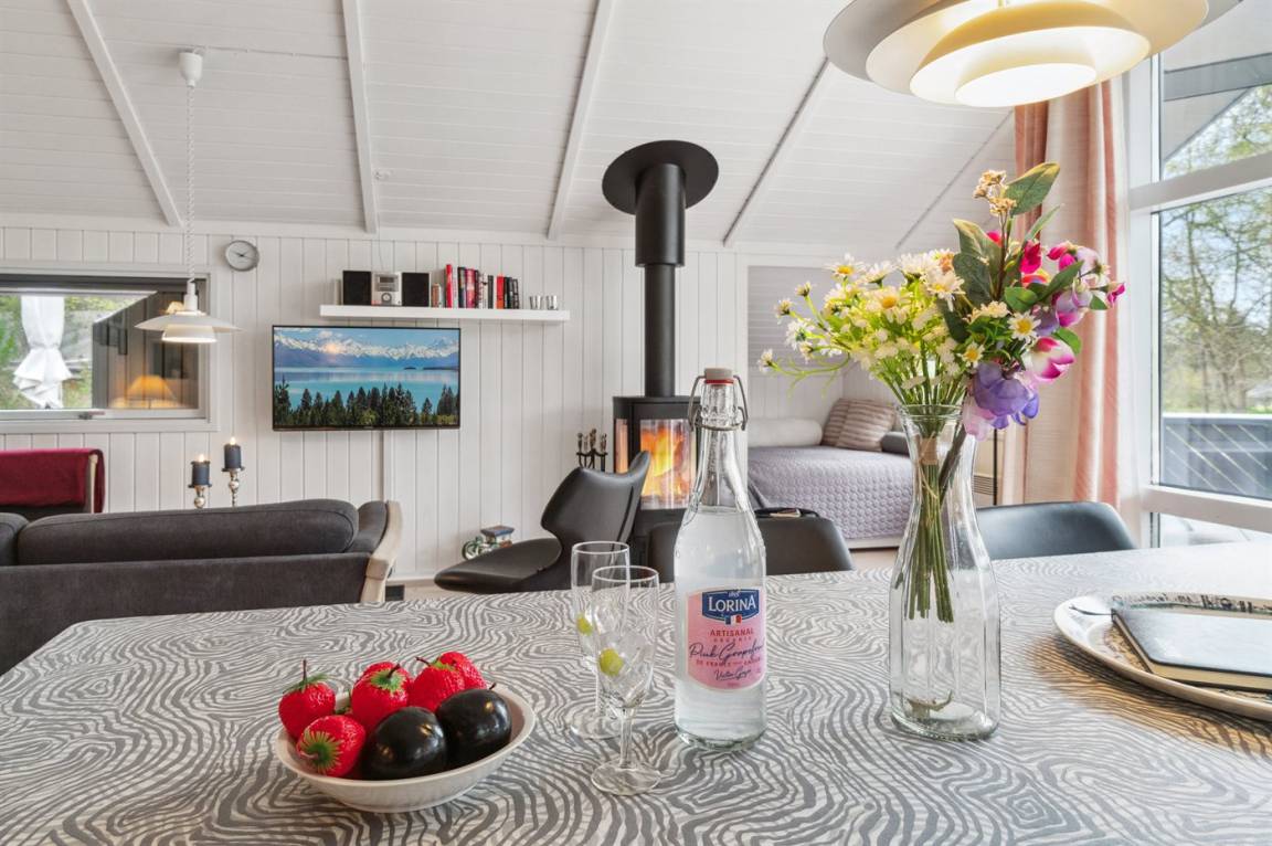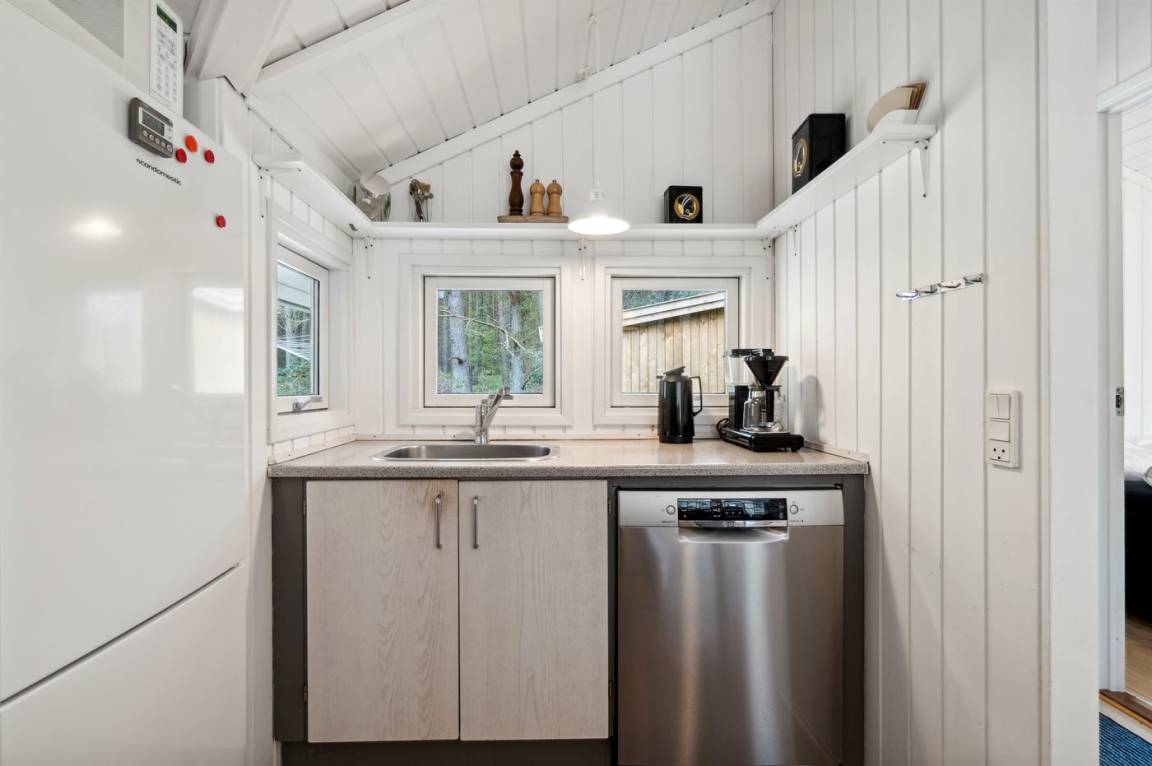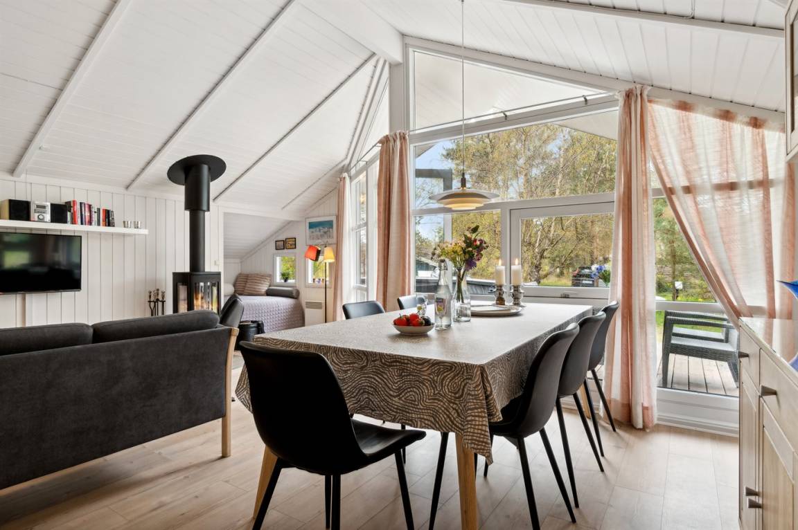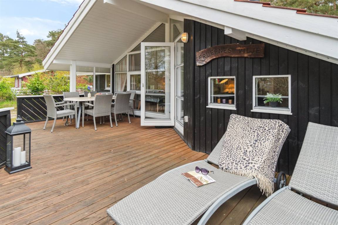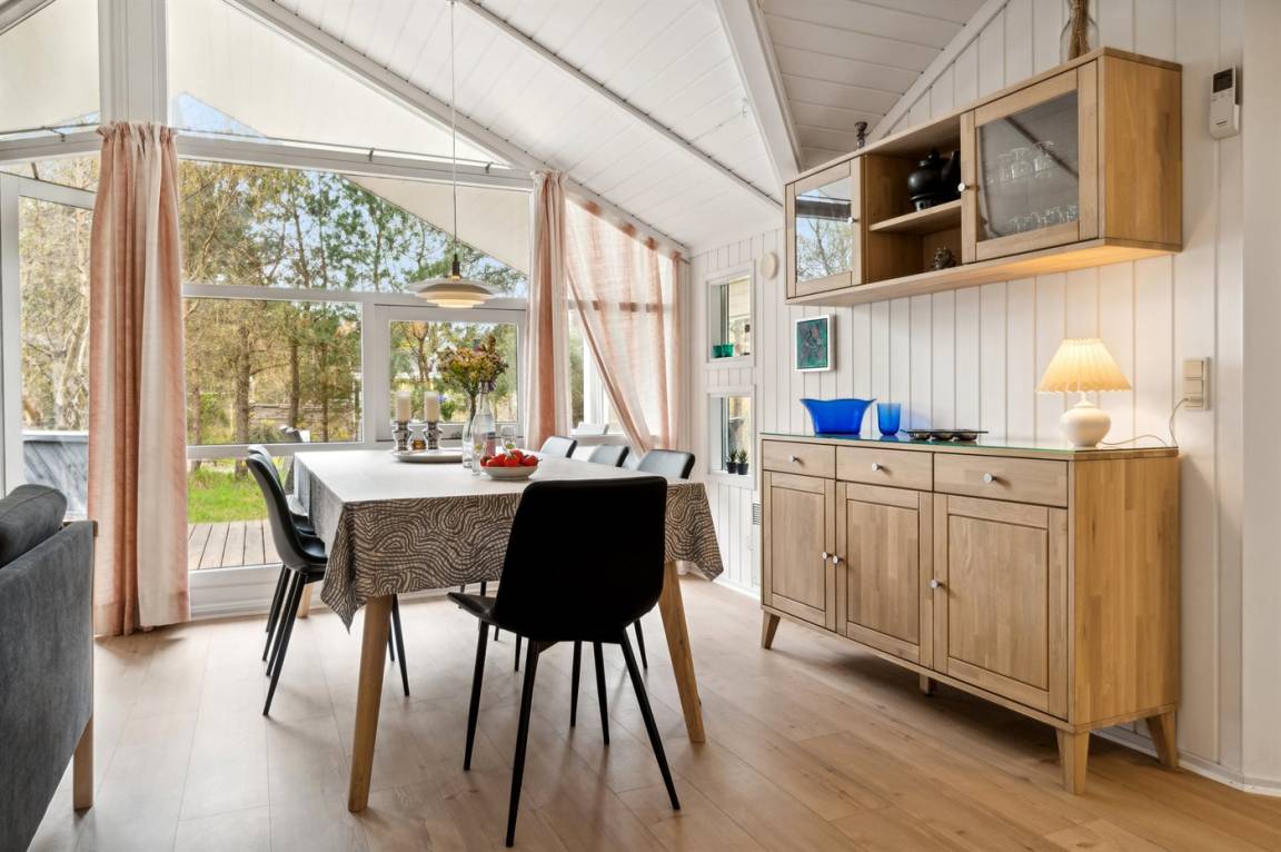 Strandnahes, gut ausgestattetes Ferienhaus in schöner Lage in einem gemütlichen Ferienhausgebiet. Das Haus grenzt an ein geschütztes Waldgebiet an, sodass man eine ungestörte Terrasse hinter dem Haus findet, auf der man die Sonne in vollen Zügen genießen kann. Die Nachmittagsterrasse auf der anderen Seite des Hauses ist teilweise überdacht und gut möbliert mit passenden Gartenmöbeln.