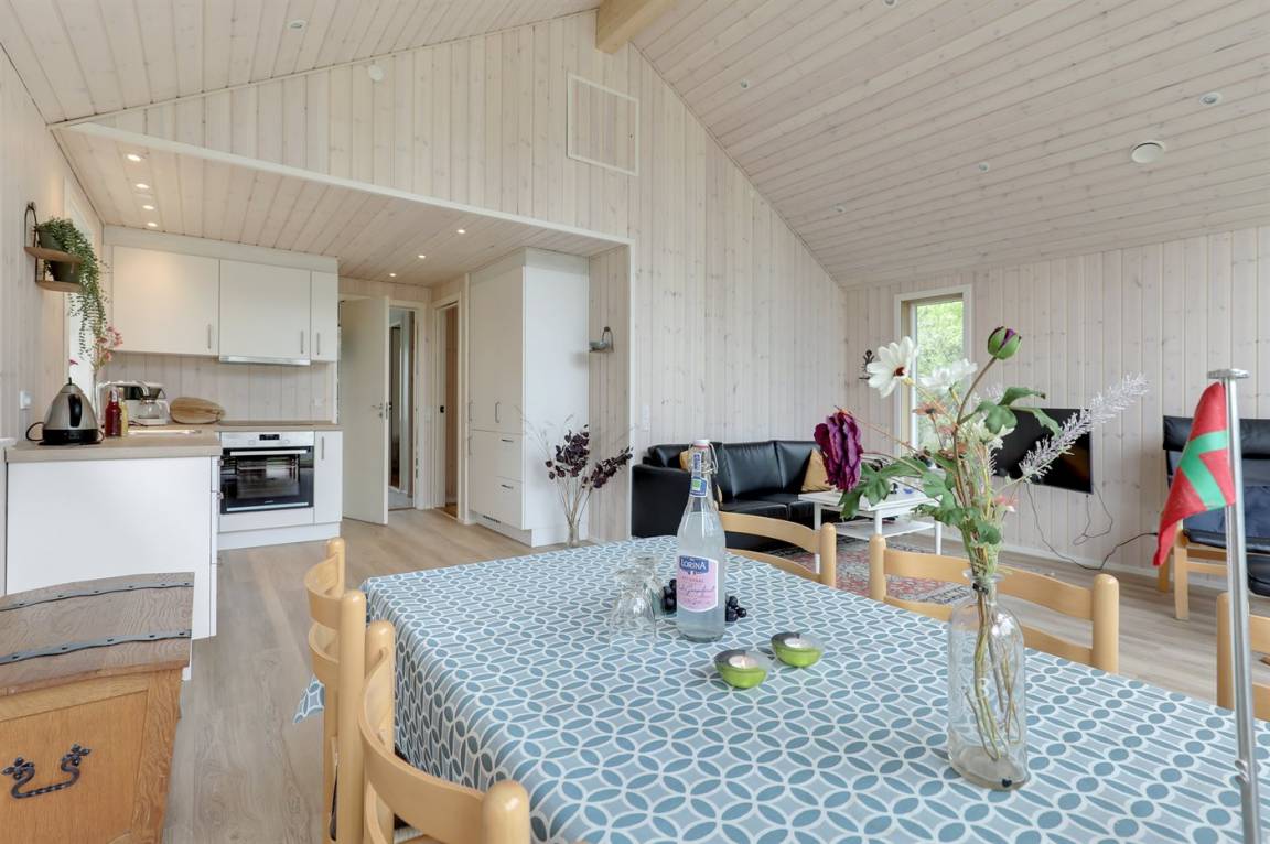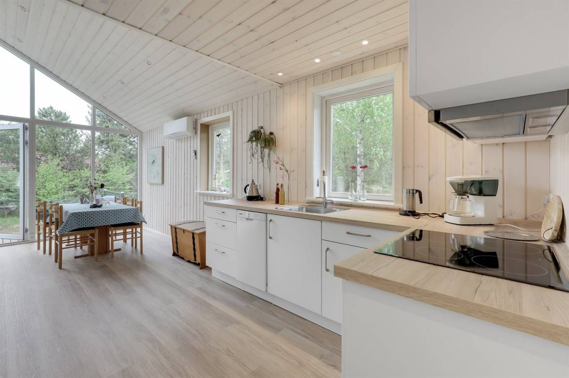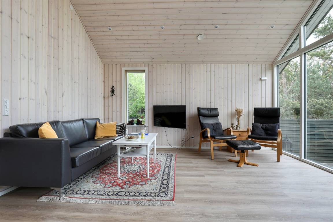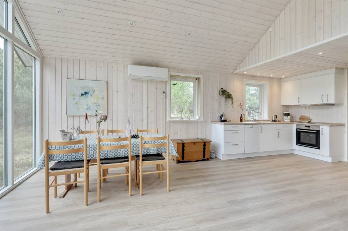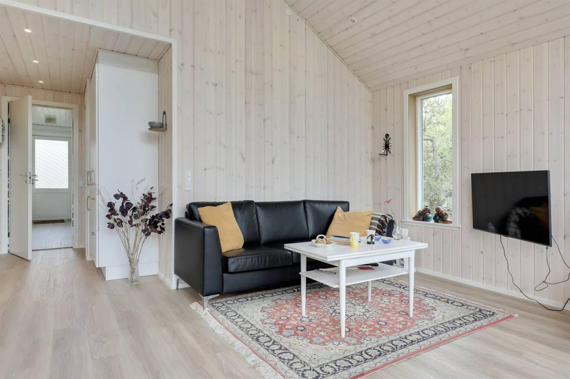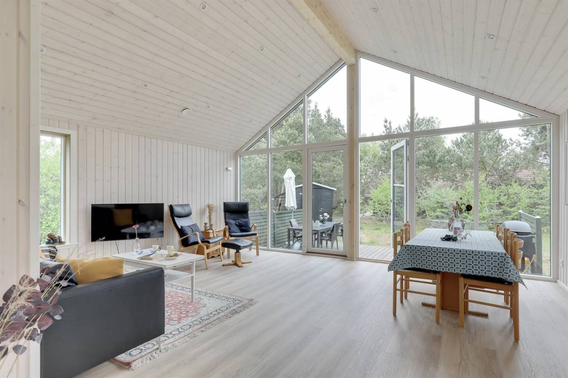 Ferienhaus in guter Lage, das 2022 modernisiert und mit neuen, hellen Holzböden, einem Küchenbereich und einer Erweiterung des Wohnzimmers mit hellen Wänden und einer bis unter den Dachfirst reichenden Decke ausgestattet wurde. Die großen Panoramafenster reichen im Wohnzimmer bis unter den Dachfirst und sorgen dafür, dass Sie Wetter und Natur auch im Haus erleben können.