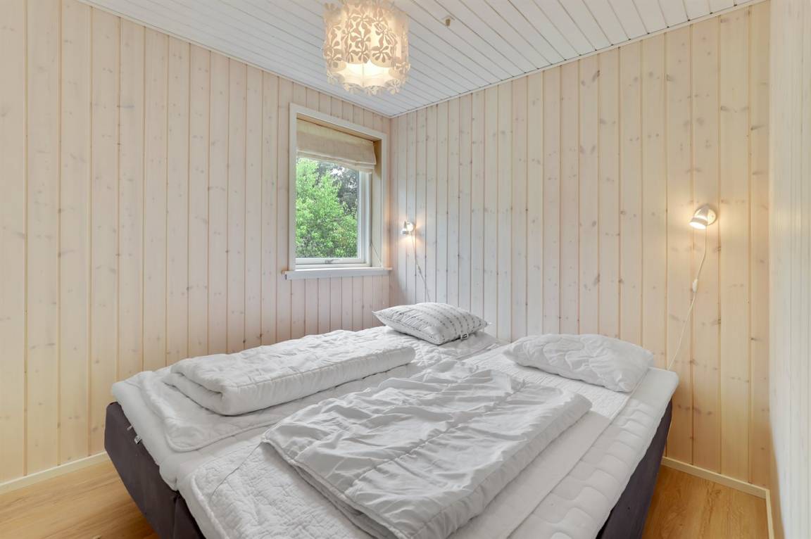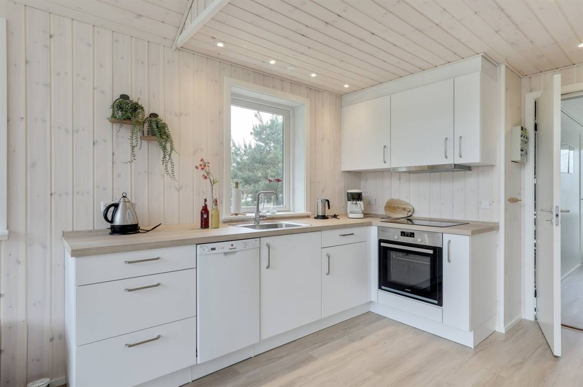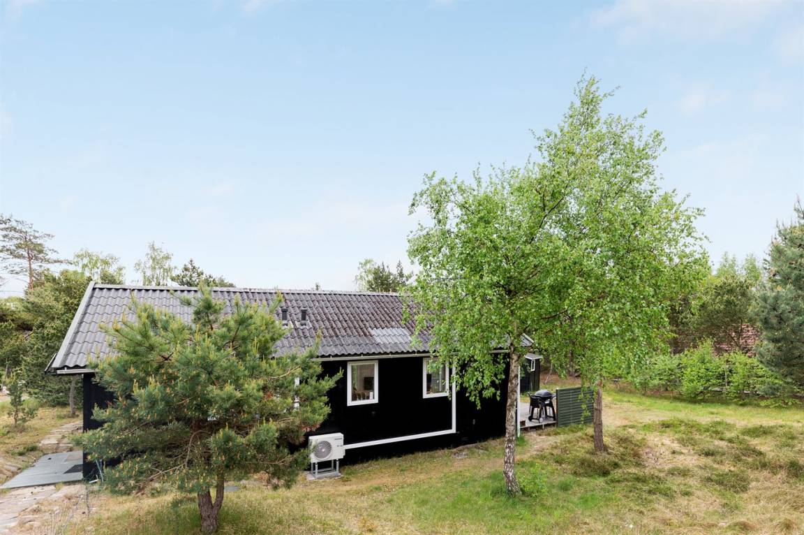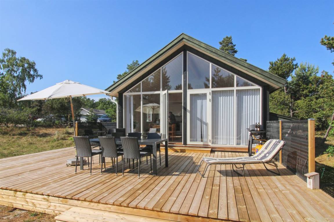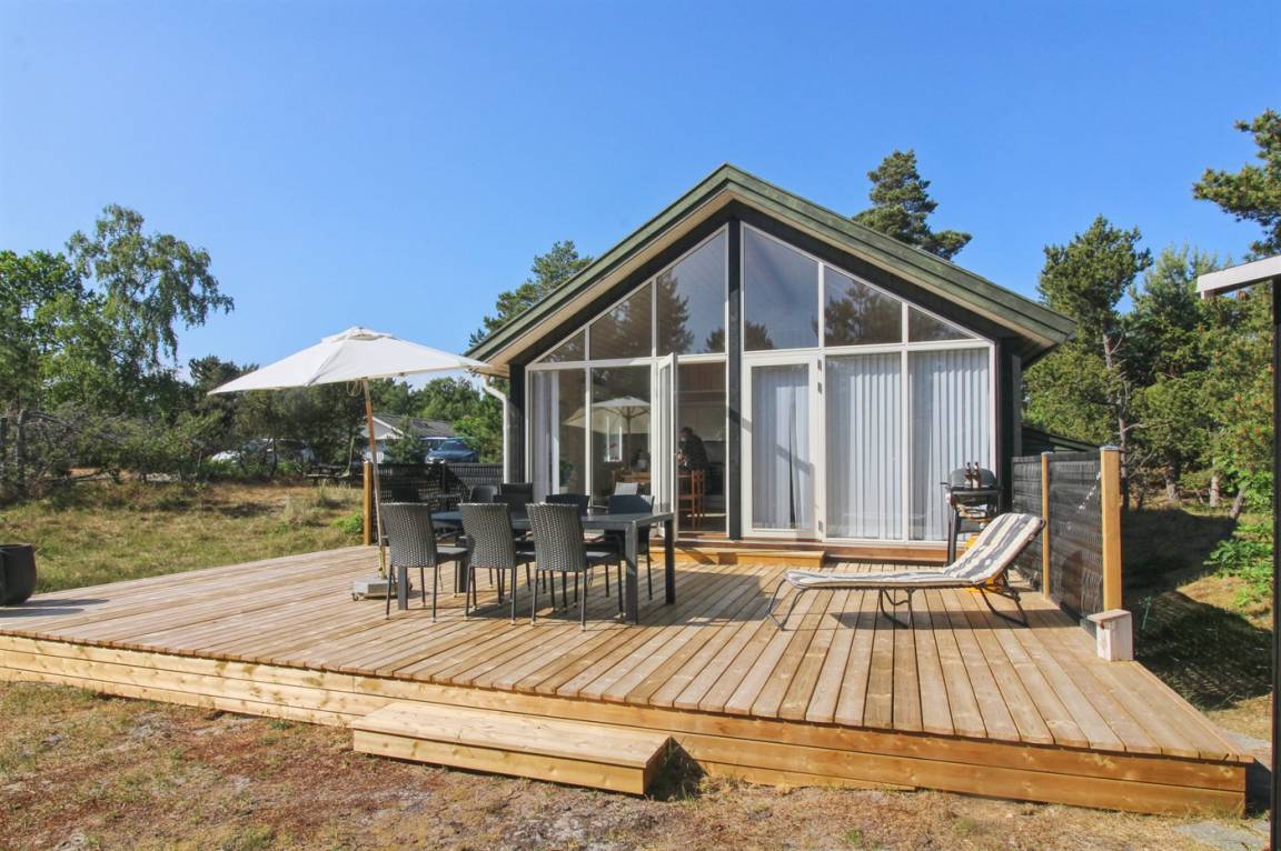 Ferienhaus in guter Lage, das 2022 modernisiert und mit neuen, hellen Holzböden, einem Küchenbereich und einer Erweiterung des Wohnzimmers mit hellen Wänden und einer bis unter den Dachfirst reichenden Decke ausgestattet wurde. Die großen Panoramafenster reichen im Wohnzimmer bis unter den Dachfirst und sorgen dafür, dass Sie Wetter und Natur auch im Haus erleben können.