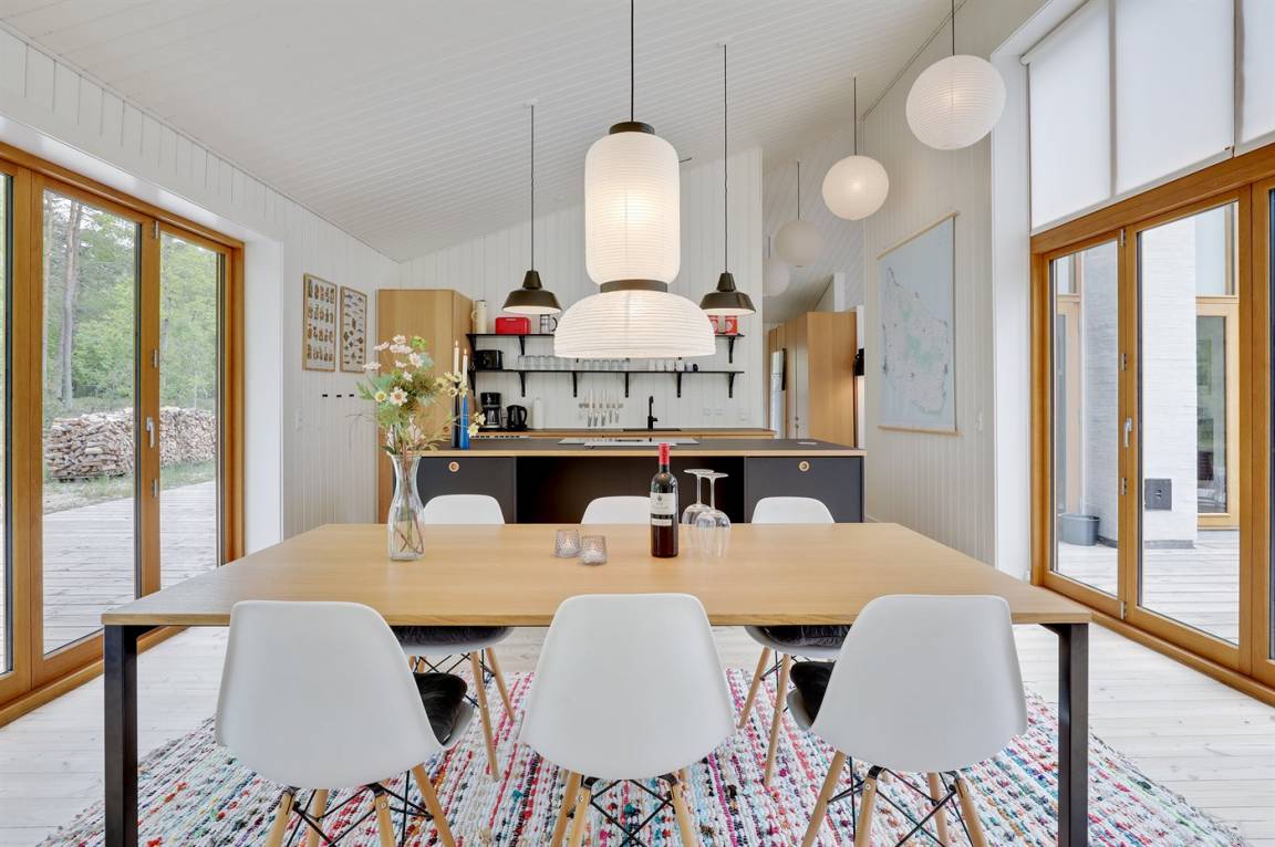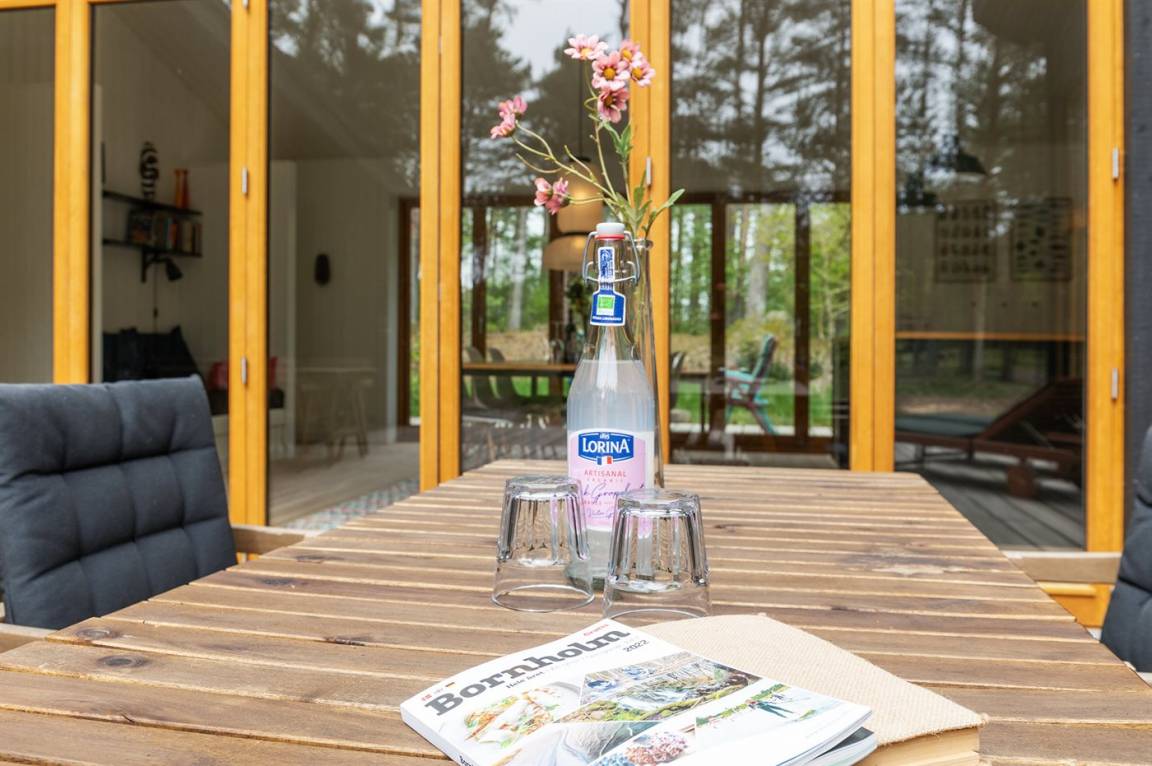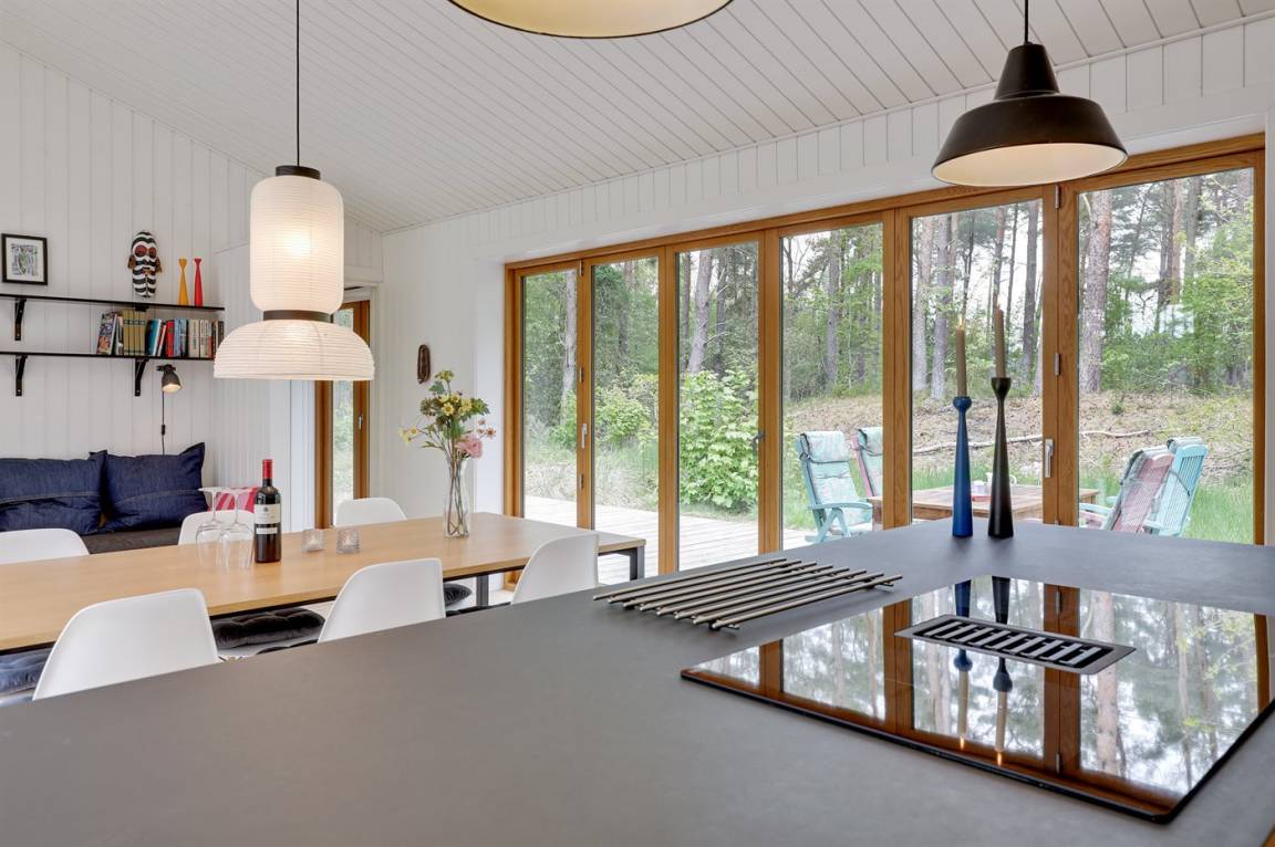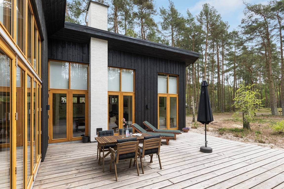 Ein von einem Architekten gezeichnetes, 2021 erbautes Ferienhaus in einem naturschönen Ferienhausgebiet unweit von einem beliebten Badestrand. Das Grundstück ist von hohen Bäumen umgeben und zum Haus gehört eine ungestörte und teilweise abgeschirmte Terrasse.