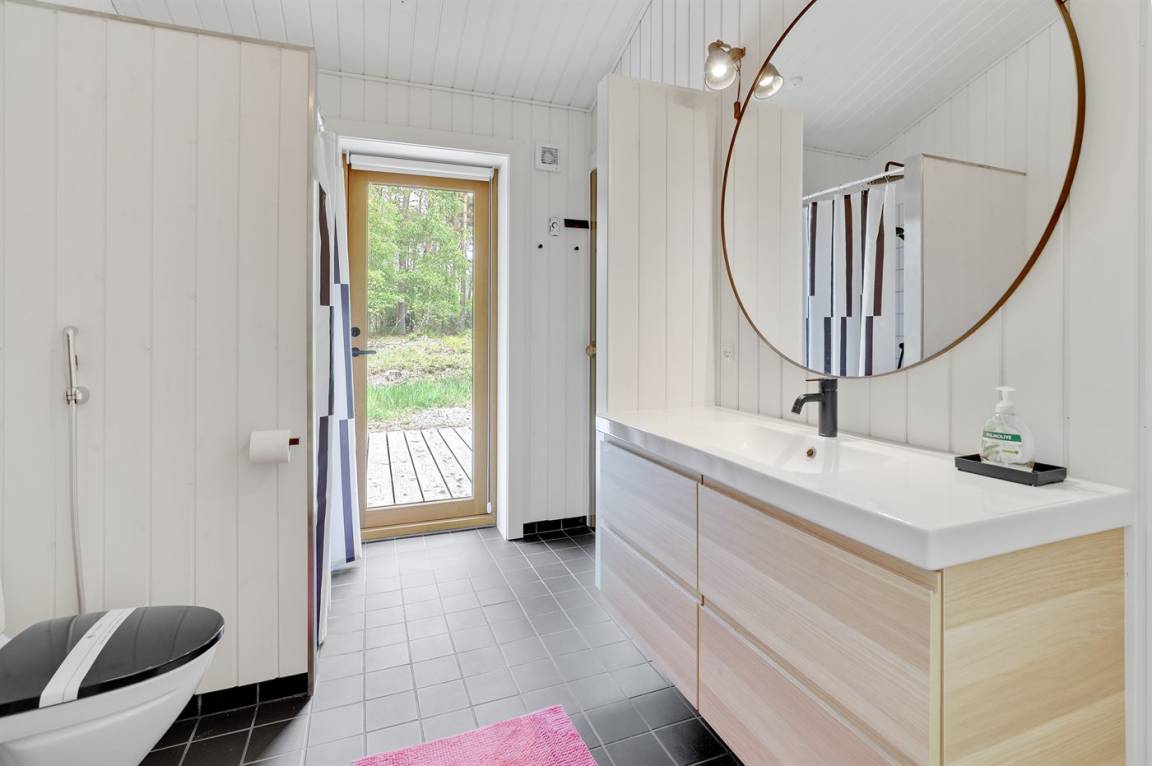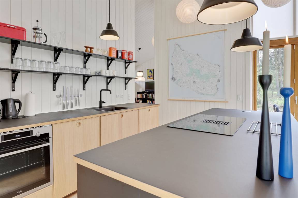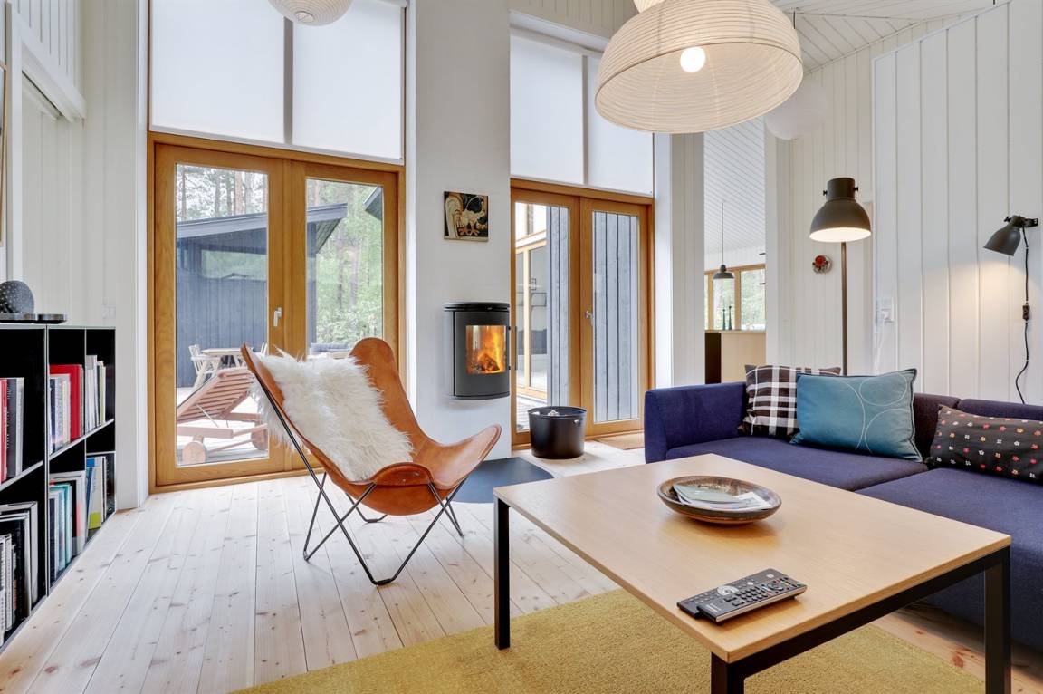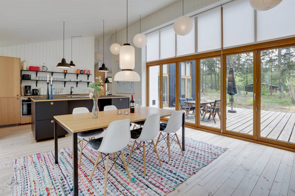 Ein von einem Architekten gezeichnetes, 2021 erbautes Ferienhaus in einem naturschönen Ferienhausgebiet unweit von einem beliebten Badestrand. Das Grundstück ist von hohen Bäumen umgeben und zum Haus gehört eine ungestörte und teilweise abgeschirmte Terrasse.