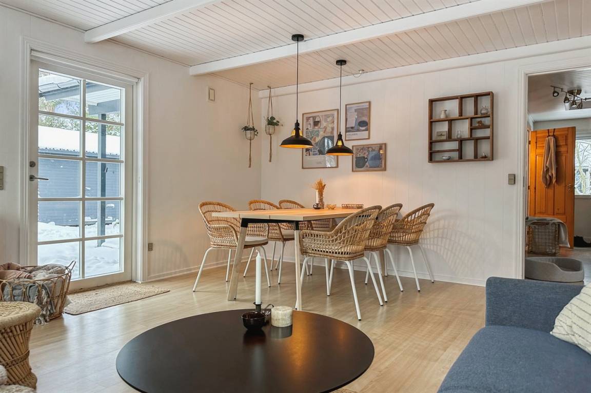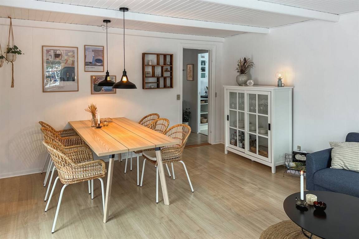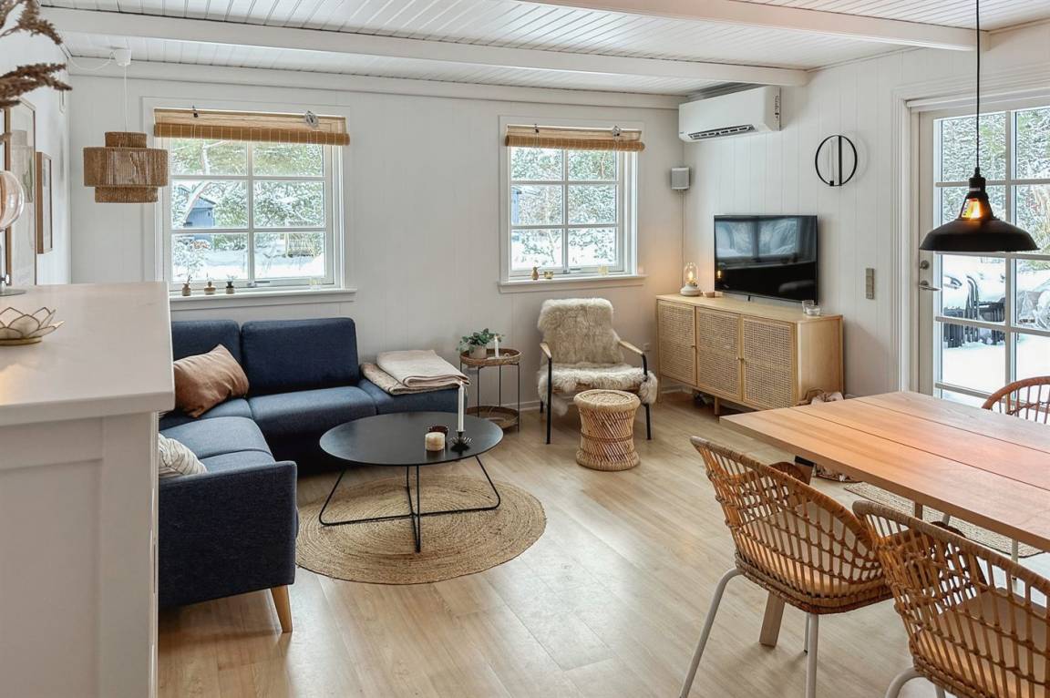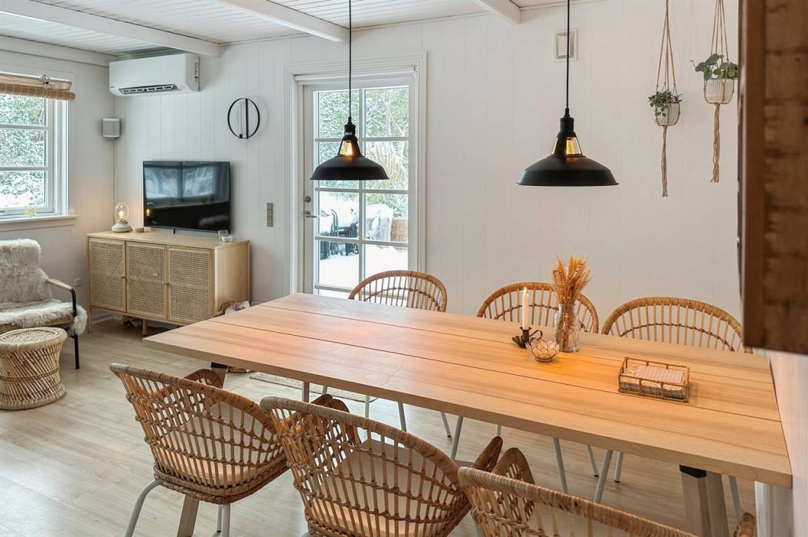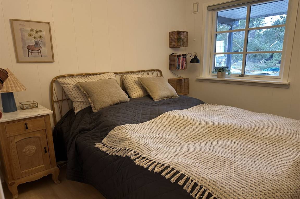 Das Haus wurde 2021 mit neu gestrichenen Wänden und Decken sowie einzelne neue Möbel modernisiert – und tritt hell und freundlich hervor. Die separate Kücheabteilung ist u. a. mit Geschirrspüler ausgestattet. Das Wohnzimmer hat direkten Zutritt zur Terrasse und enthält u. a. Fernseher mit Smart-TV (4 deutsch Fernsehsender), Sonos Bluetooth-Lautsprecher und Stereoanlage. Die Schlafplätze verteilen sich auf 3 helle Zimmer; eines mit Doppelbett, eines mit zwei Einzelbetten und eines mit einer ausziehbaren Schlafcouch. Alle Betten sind von guter Qualität. Das Kinderzimmer ist ein Durchgangszimmer und hat eigenen Zutritt zur Terrasse. Schönes Badezimmer mit Fußbodenheizung und Duschnische.