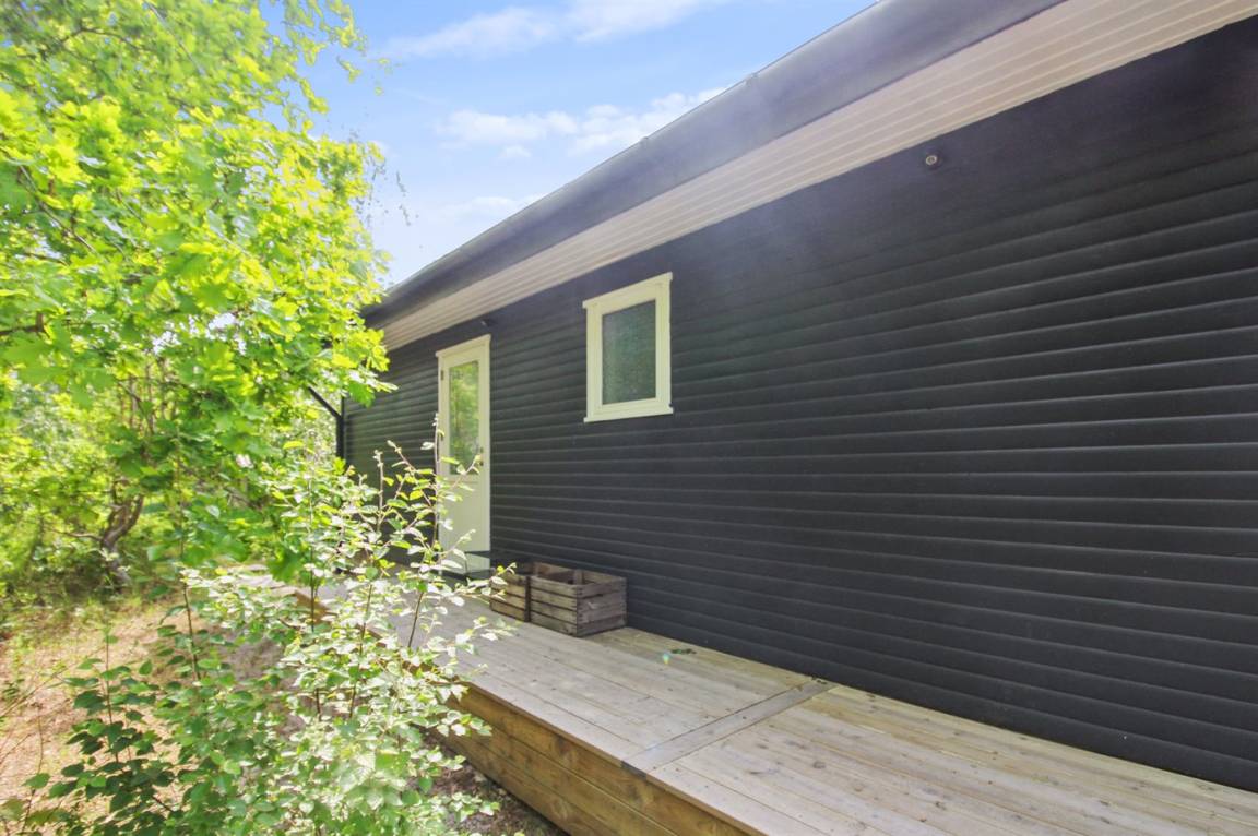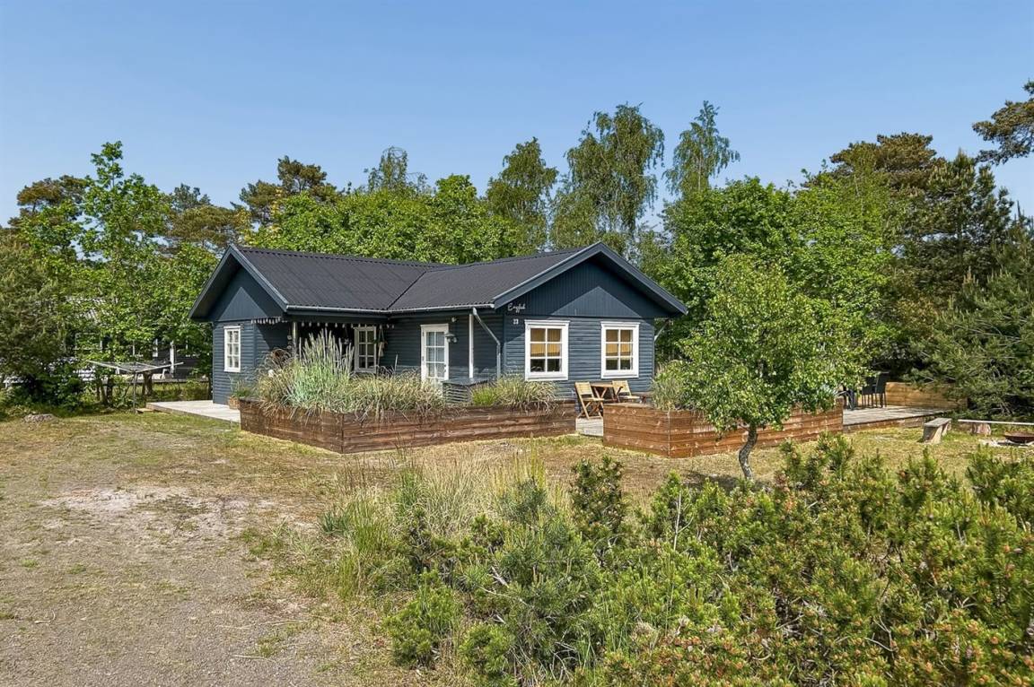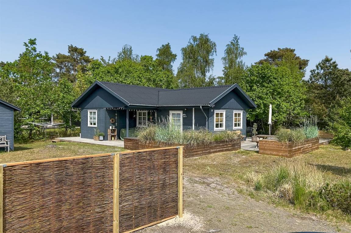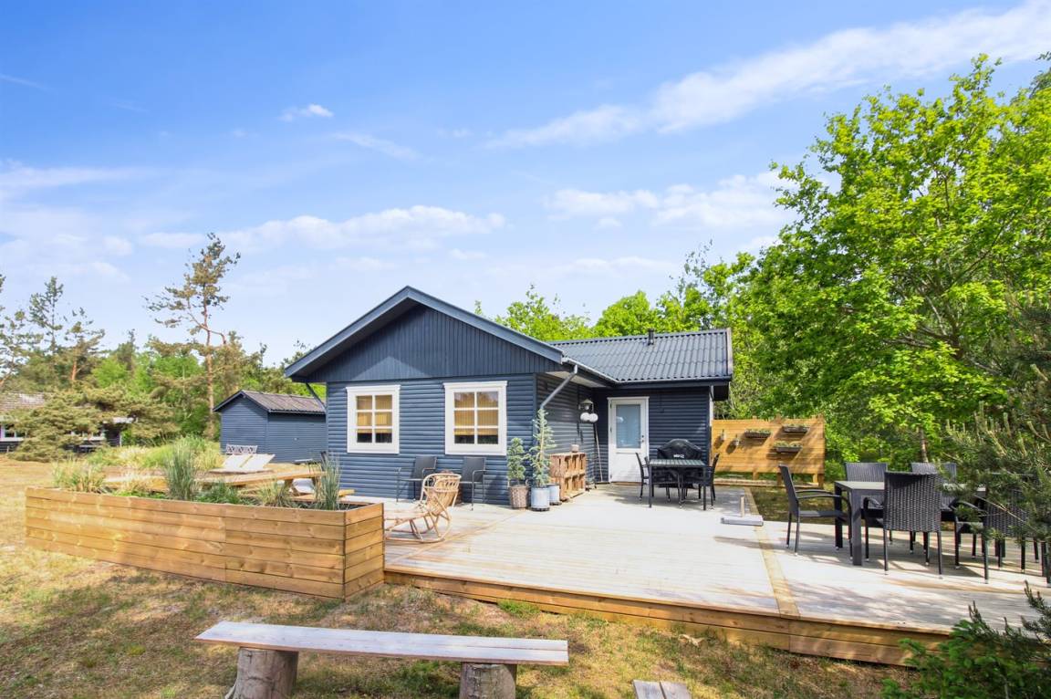 Ein schönes und gepflegtes Ferienhaus aus Holz auf einem Naturgrundstück mit Sand, Heidekraut und Kiefern sowie Lagerfeuerstelle gelegen. Große und teils überdachte Terrasse (80 m² überdachte Terrasse) mit diversen Gartenmöbeln, Kugelgrill und Gasgrill.