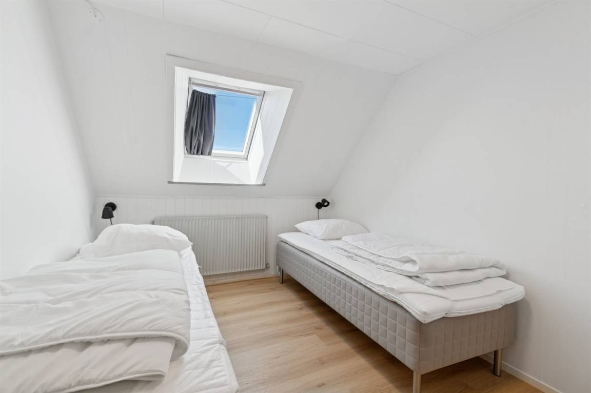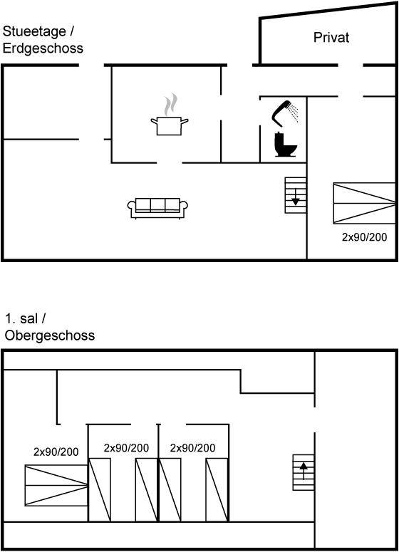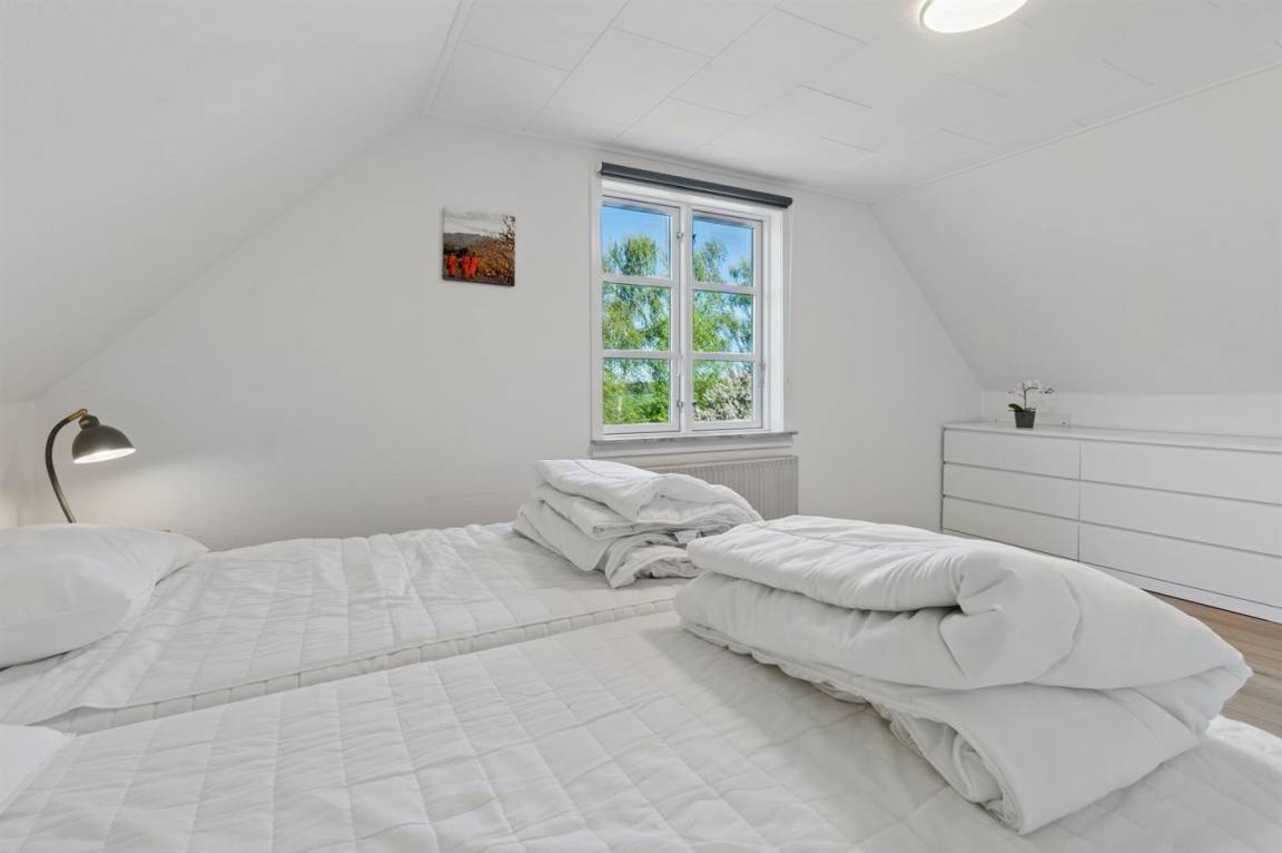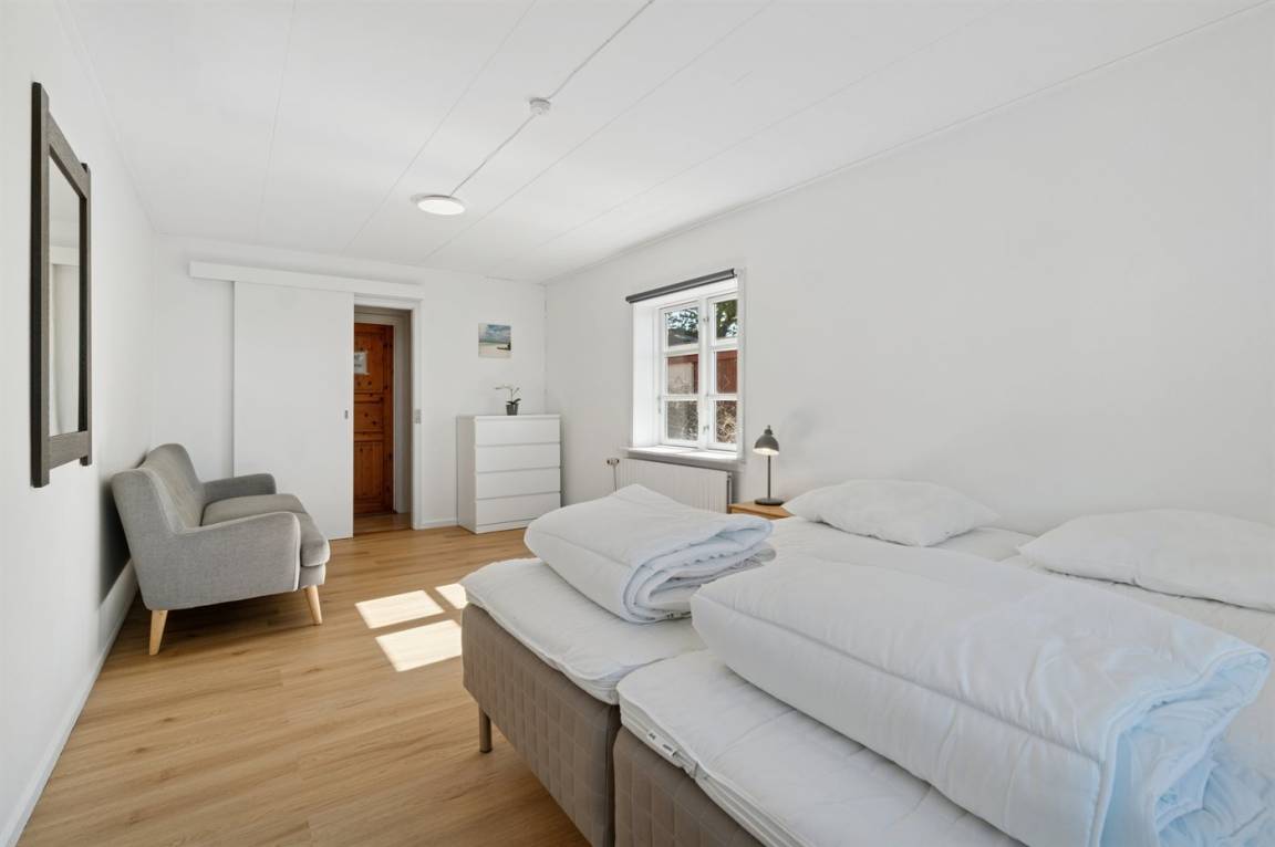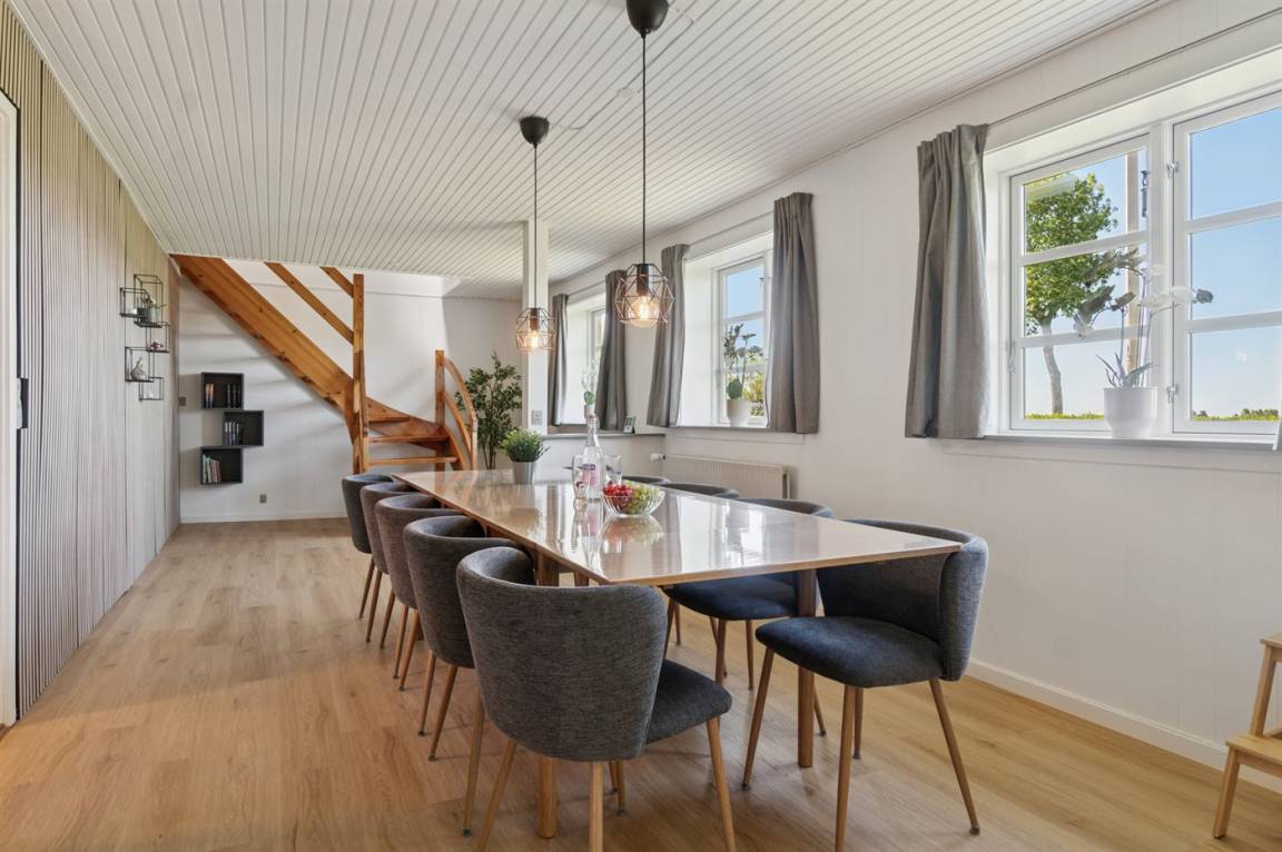 Die Tischler-Küche ist gut ausgestattetet - auch hier gibt es viel Platz, und man kann gemeinsam leckere Mahlzeiten zubereiten. Das Badezimmer befindet sich im Erdgeschoss. Auch eines der Schlafzimmer liegt im Ergeschoss und die drei anderen liegen im Obergeschoss. Dort findest du auch einen kleinen Aufenthaltsbereich mit bequemen Möbeln – ideal, wenn du dich tagsüber einmal zurückziehen möchtest.