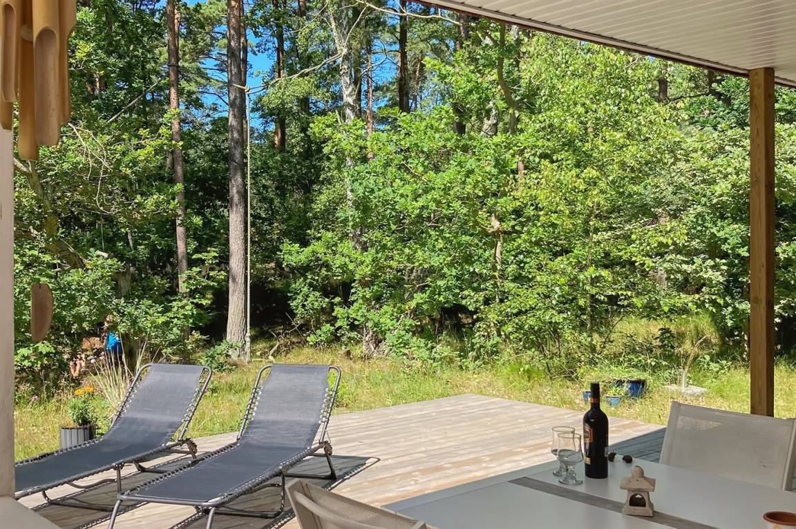 DraußenDie Ferienunterkunft liegt auf einem 2550 m² großen Naturgrundstück. Die Entfernung zum Meer beträgt 800 m. Die nächste Einkaufsmöglichkeit liegt 3000 m entfernt. In einem Abstand von 6000 m gibt es einen Golfplatz. Es steht ein 20 m² Terrassenareal zur Verfügung. Außerdem gibt es 10 m² überdachte Terrasse. Schaukel. Es steht ein Carport zur Verfügung. Parkplatz auf dem Grundstück.