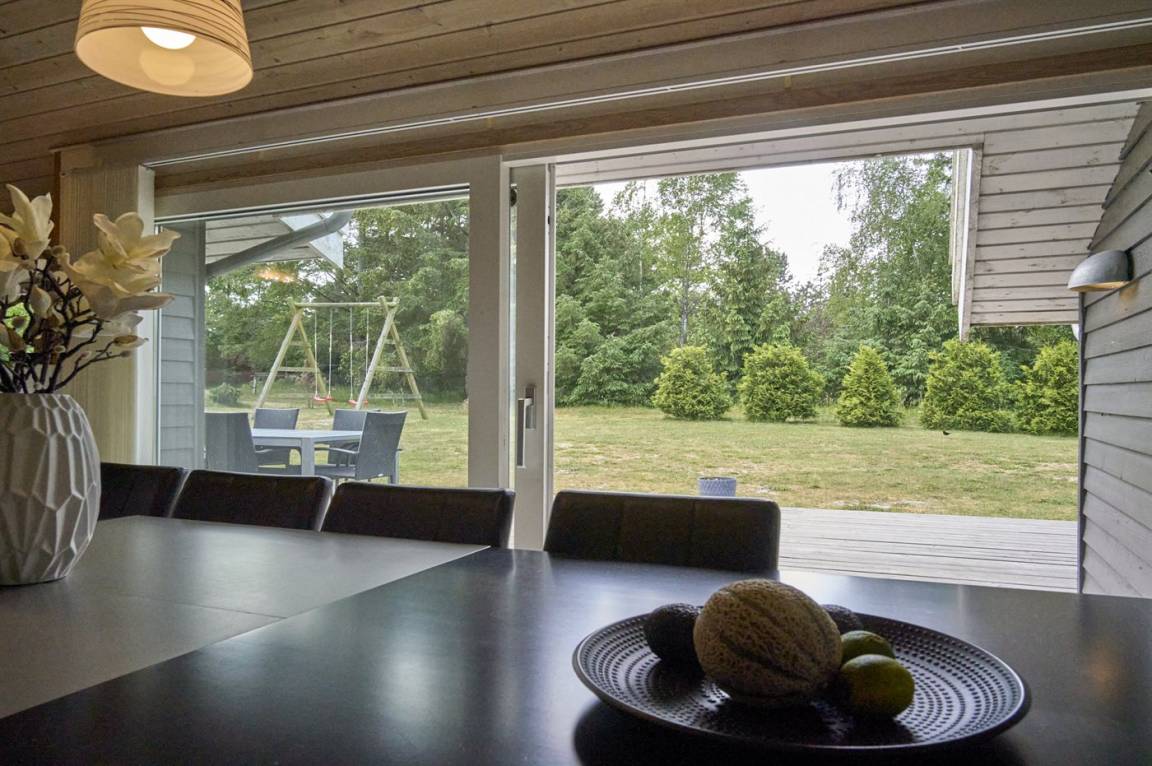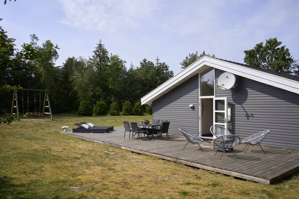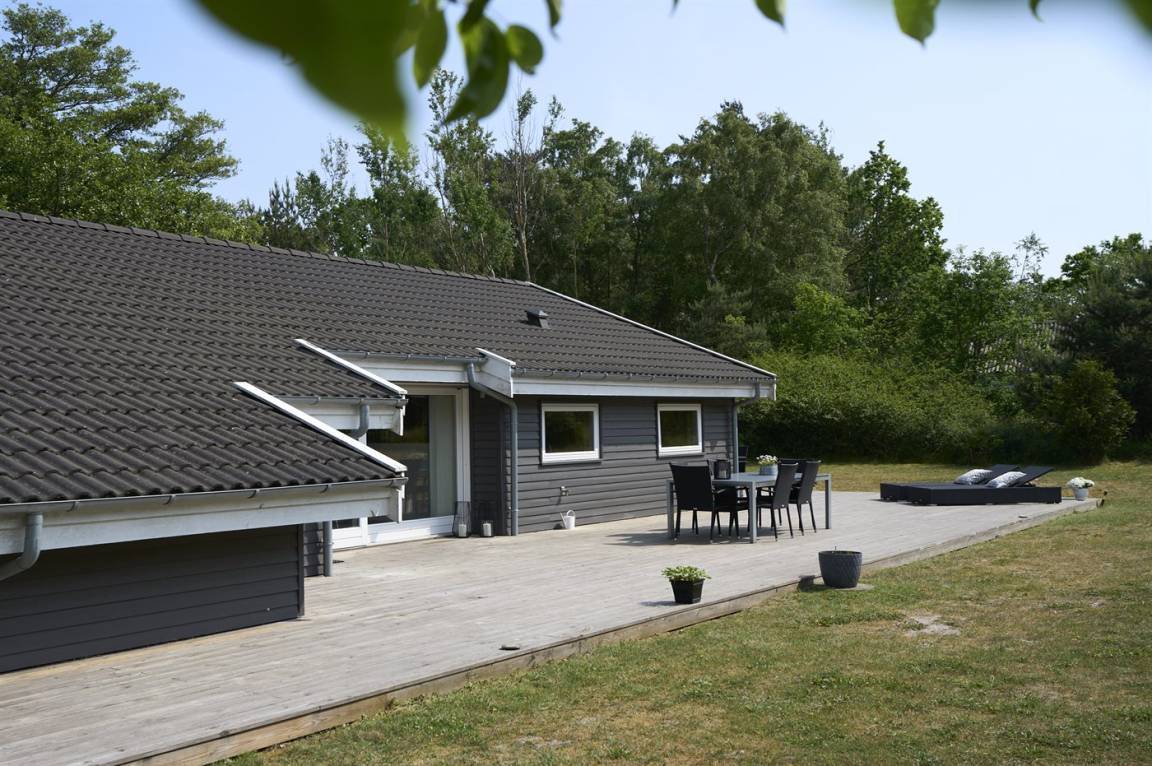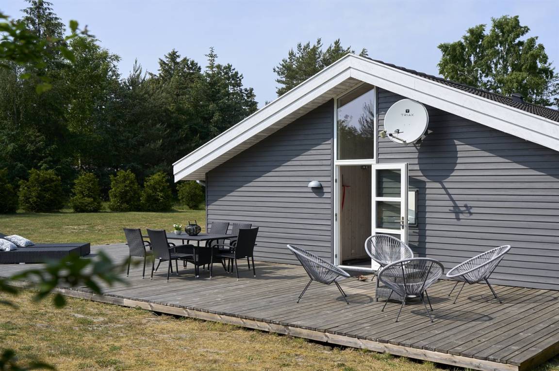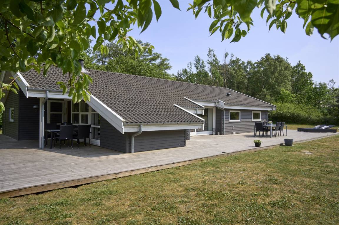 Neben dem großen, hellen Wohnzimmer mit Essbereich und einer gut ausgestatteten, offenen Küche findest du gemütliche Schlafzimmer, die alle mit Betten mit Boxmatratzen ausgestattet sind. Die absoluten Mittelpunkte des Hauses sind der große Wohn- und Essbereich sowie die schöne Terrasse, die sich an drei Seiten des Hauses erstreckt. Auf der Terrasse gibt es gute Gartenmöbel und einen Grill.