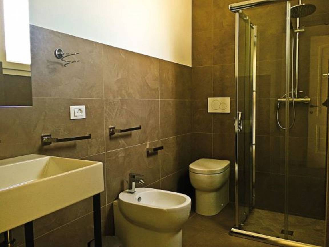 Badezimmer: Waschbecken, WC, Bidet, Dusche, Fön.