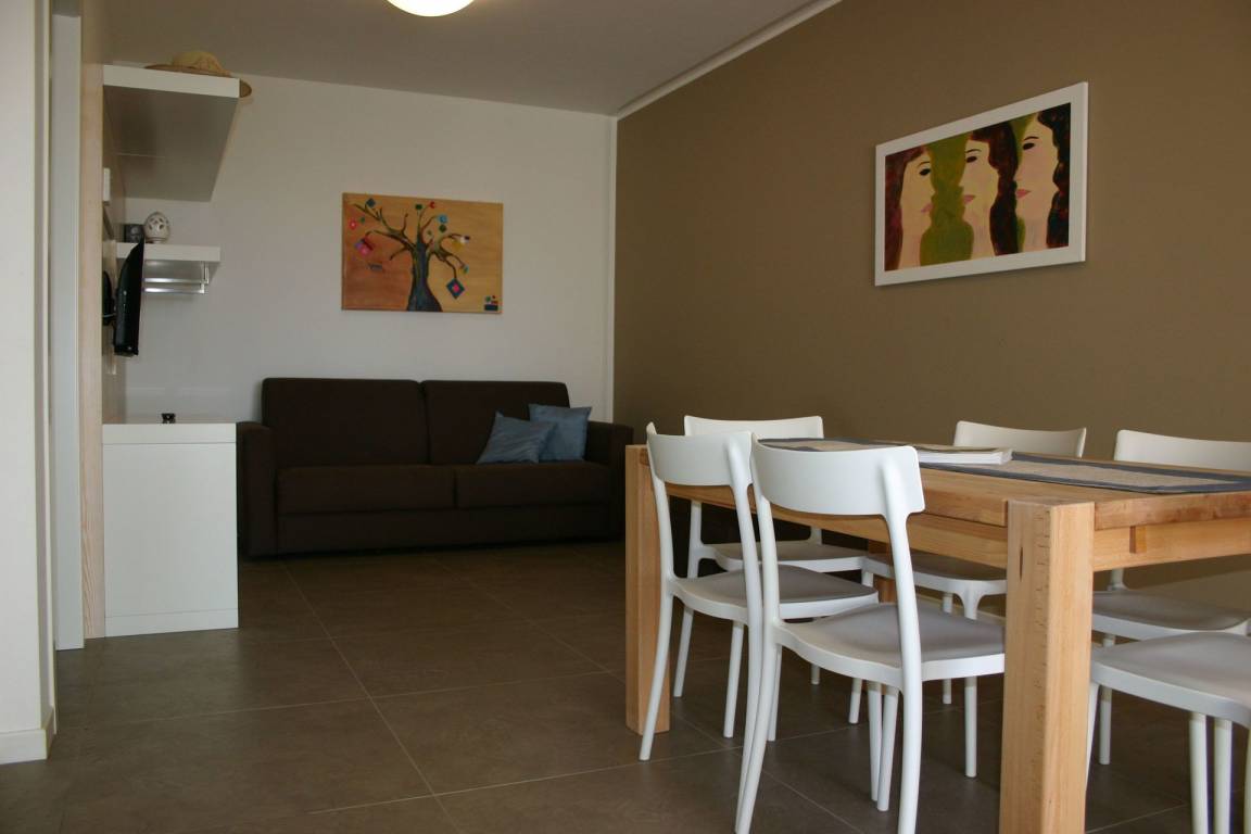 Wohnküche (20 m²): gut ausgestattete Küche, Esstisch, Spülmaschine, Kühlschrank, Tiefkühler, Herd, Bügeleisen, Italienische Kaffeemaschine, Waschmaschine, Doppel-Schlafsofa, WiFi Internet, Klimaanlage, Fliegengitter, TV, Ausgang auf den Patio.