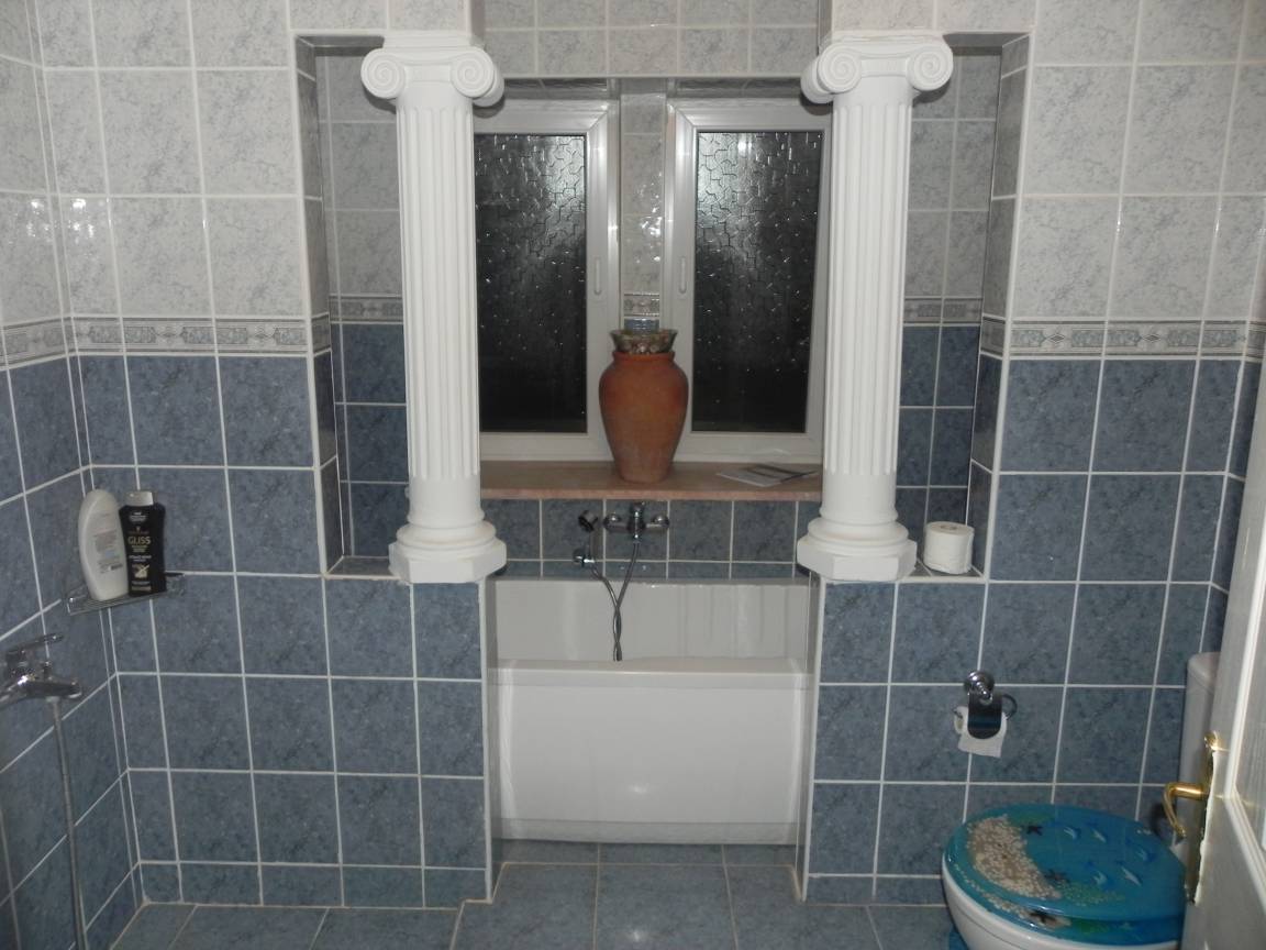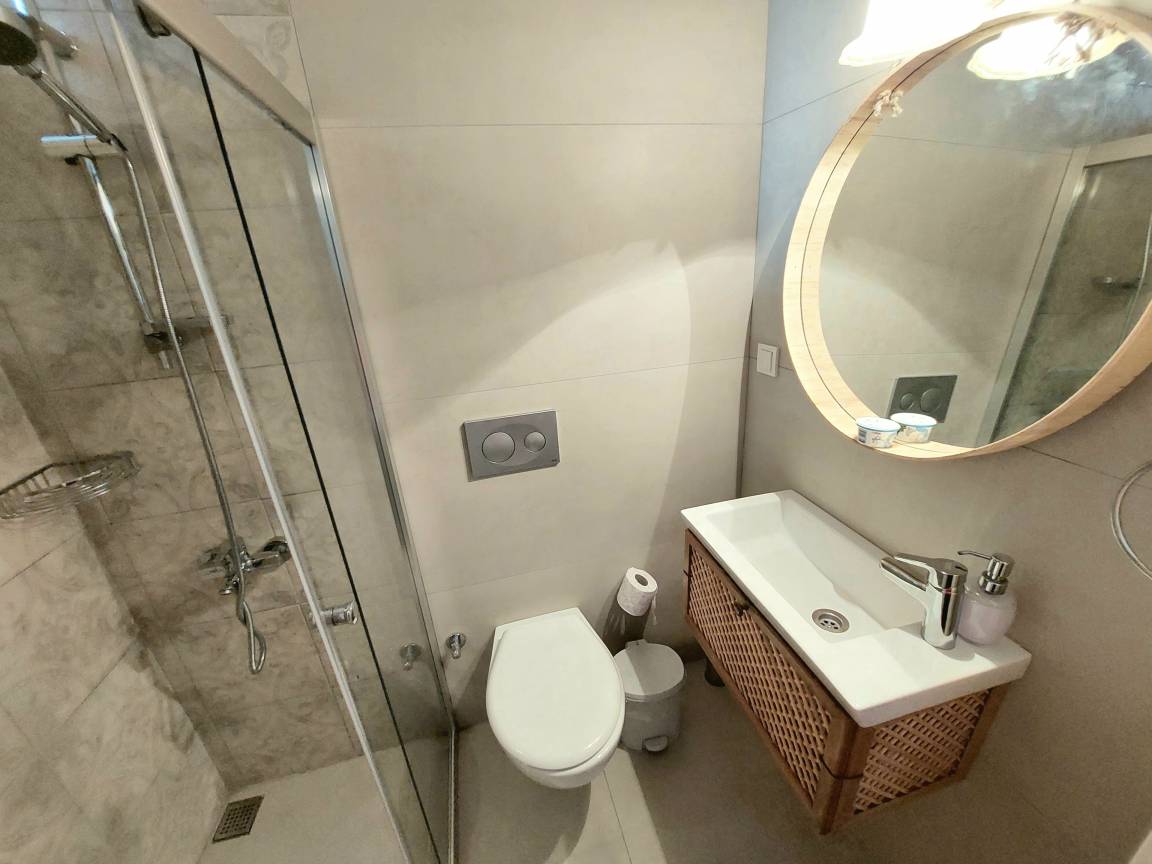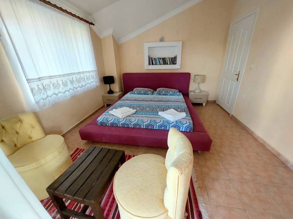 Erster Stock: Offener Küchen- und Wohnbereich, der zur Hälfte durch eine Marmor-Frühstücksbar getrennt ist. Dieser frische und helle Wohnbereich verfügt über einen dekorativen Kamin mit romantischen Accessoires, TV-Möbel, 2 Sofas und 2 Sessel. Sowohl die Küche als auch das Wohnzimmer haben Zugang zu ihren eigenen großen Terrassen mit Blick auf das Felsengrab und die Berge. Es gibt 2 Schlafzimmer und ein gemeinsames großes Familienbadezimmer mit Dusche, Badewanne und Toilette auf dieser Etage. Das erste Schlafzimmer hat 2 Einzelbetten. Das zweite Schlafzimmer hat ein großes Doppelbett. Beide Schlafzimmer sind mit Kleiderschränken, Sesseln und Zugang zum Balkon ausgestattet.