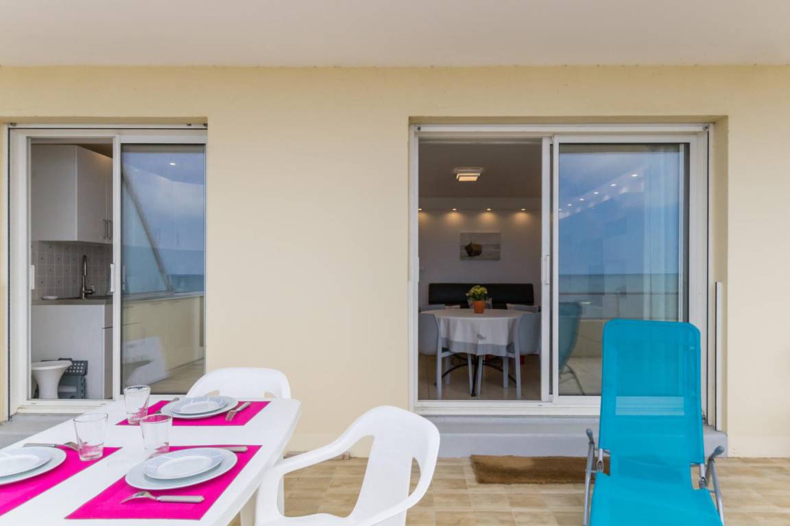 In einer kleinen Strandresidenz. Erdgeschosswohnung (5 Stufen am Eingang). Eingangsbereich mit Garderobe und WC. Wohnzimmer. Ausgestattete Küchenzeile (Backofen, Geschirrspüler, Mikrowelle). Duschbad (mit Waschmaschine). Schlafzimmer (2 Einzelbetten 90x190 cm). Doppelschlafsofa im Wohnzimmer. TV. WLAN. Bettwäsche und Handtücher werden gestellt. Die Betten sind bei Ankunft bezogen. Reinigungsservice inklusive. Elektrische Heizung inklusive. Private Terrasse mit Gartenmöbeln und Sonnenliegen. Meerblick von der Wohnung und der Terrasse. Privater Parkplatz. Nichtraucherunterkunft.