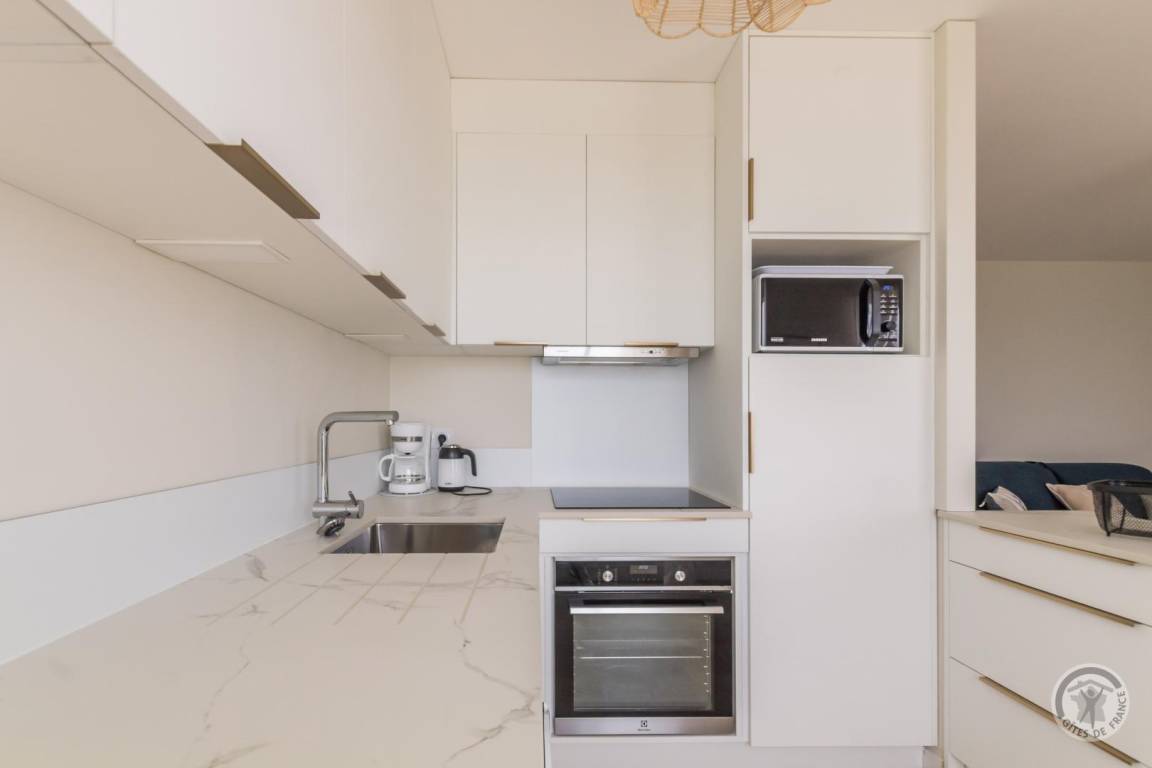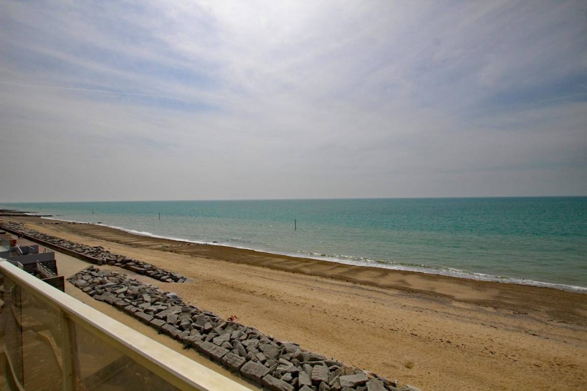 In einer kleinen Strandresidenz. Apartment im 2. Stock mit Aufzug. Eingangsbereich mit Garderobe und WC. Wohnzimmer (TV). Ausgestattete Küchenzeile (Induktionskochfeld, Backofen, Geschirrspüler, Kühlschrank mit Gefrierfach, Mikrowelle, Waschmaschine, Espressomaschine). Duschbad (ebenerdige Dusche). Schlafzimmer mit offenem Zugang zum Wohnzimmer durch einen Faltvorhang (160 x 200 cm Bett und Ankleidezimmer). Babyausstattung auf Anfrage. Bettwäsche und Handtücher werden gestellt. Die Betten sind bei Ankunft bezogen. Reinigungsservice inklusive. Elektrische Heizung inklusive. Balkon mit Markise. Gartenmöbel und Sonnenliegen. Meerblick vom Apartment und Balkon. Privater Parkplatz. Keller mit 2 Fahrrädern.