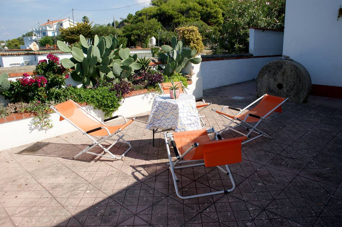 At Casetta sulla Scogliera, you are 'surrounded' by the sea. The ca. 70 m² terrace is enclosed by a small stone wall, 'ends' right above the Tyrrhenian Sea and offers a lot of space for relaxing in the shade, sunbathing and enjoying the panorama. The Amalfi Coast, amongst others, is within eyeshot.