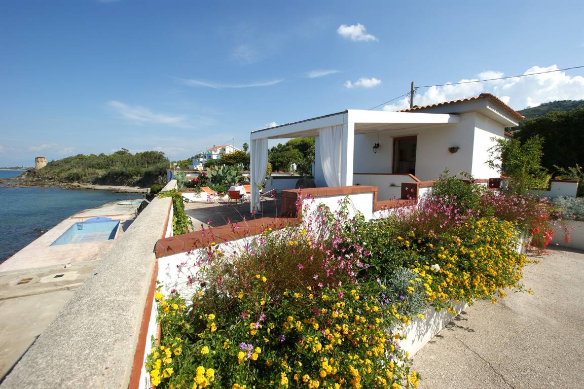 On the horizon, the azure blue of the sky rises above the deep blue of the sea. Prickly pear cacti and a variety of colorful flowers growing around the white house round off this composition of late-summer colors. The sound of the waves moving gently below the large sea view terrace is more than once interrupted by the owner's infectious laughter. You cannot but feel completely at ease.