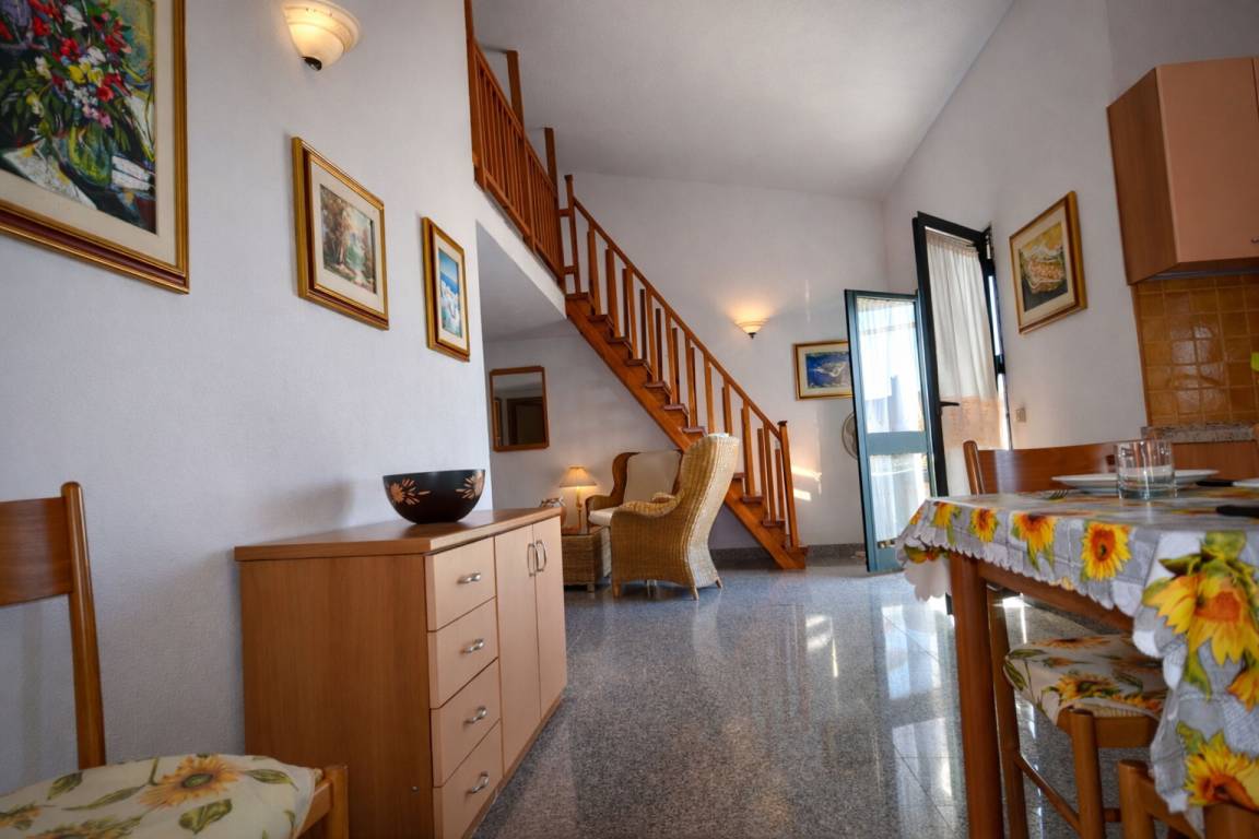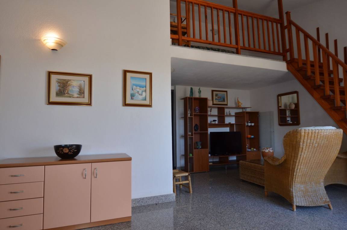 Wohnküche: Esstisch, Kühlschrank, Herd, Ofen, Sofa, Klimaanlage, TV, Galerie.