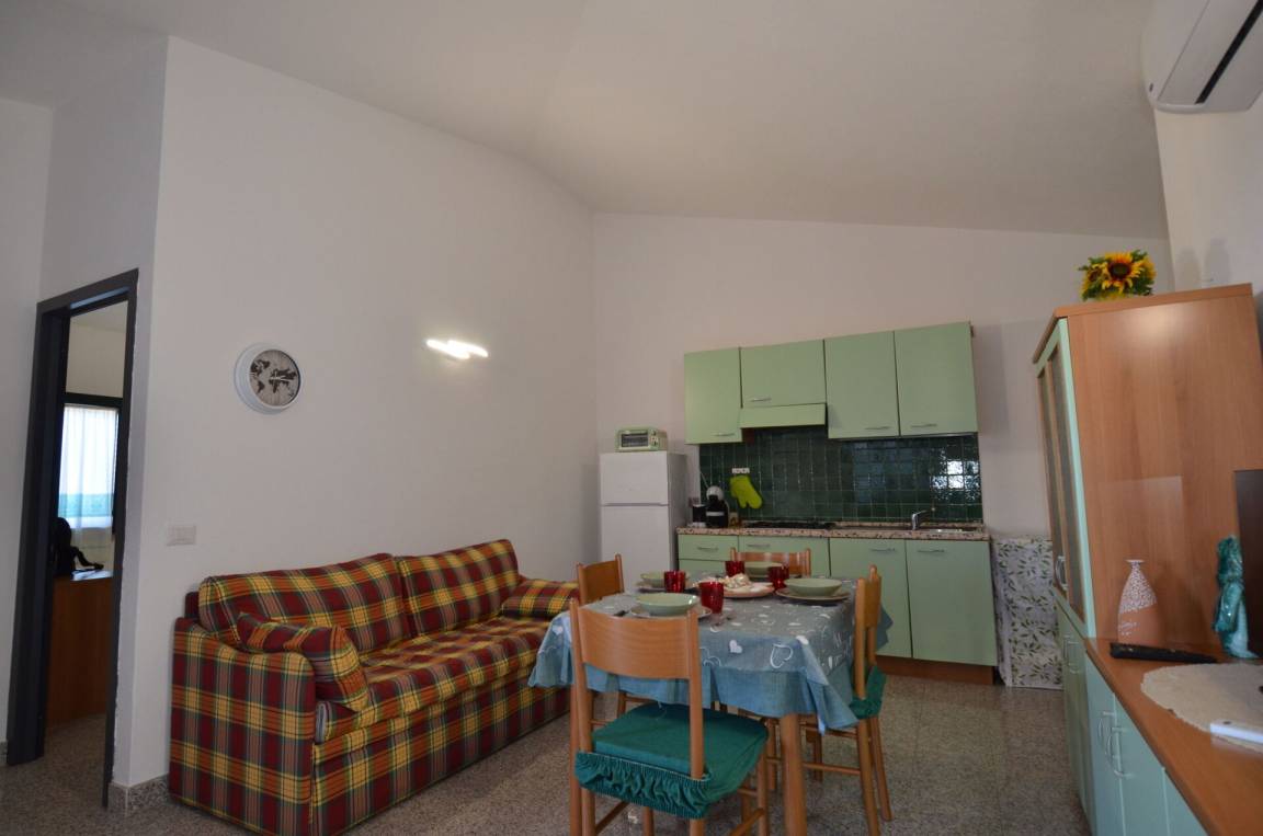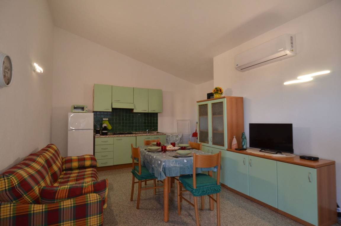 Wohnküche: Esstisch (Personen: 4), Kühlschrank, Herd, Ofen, Sofa, WiFi Internet, Klimaanlage, TV, Ausgang auf den Balkon.