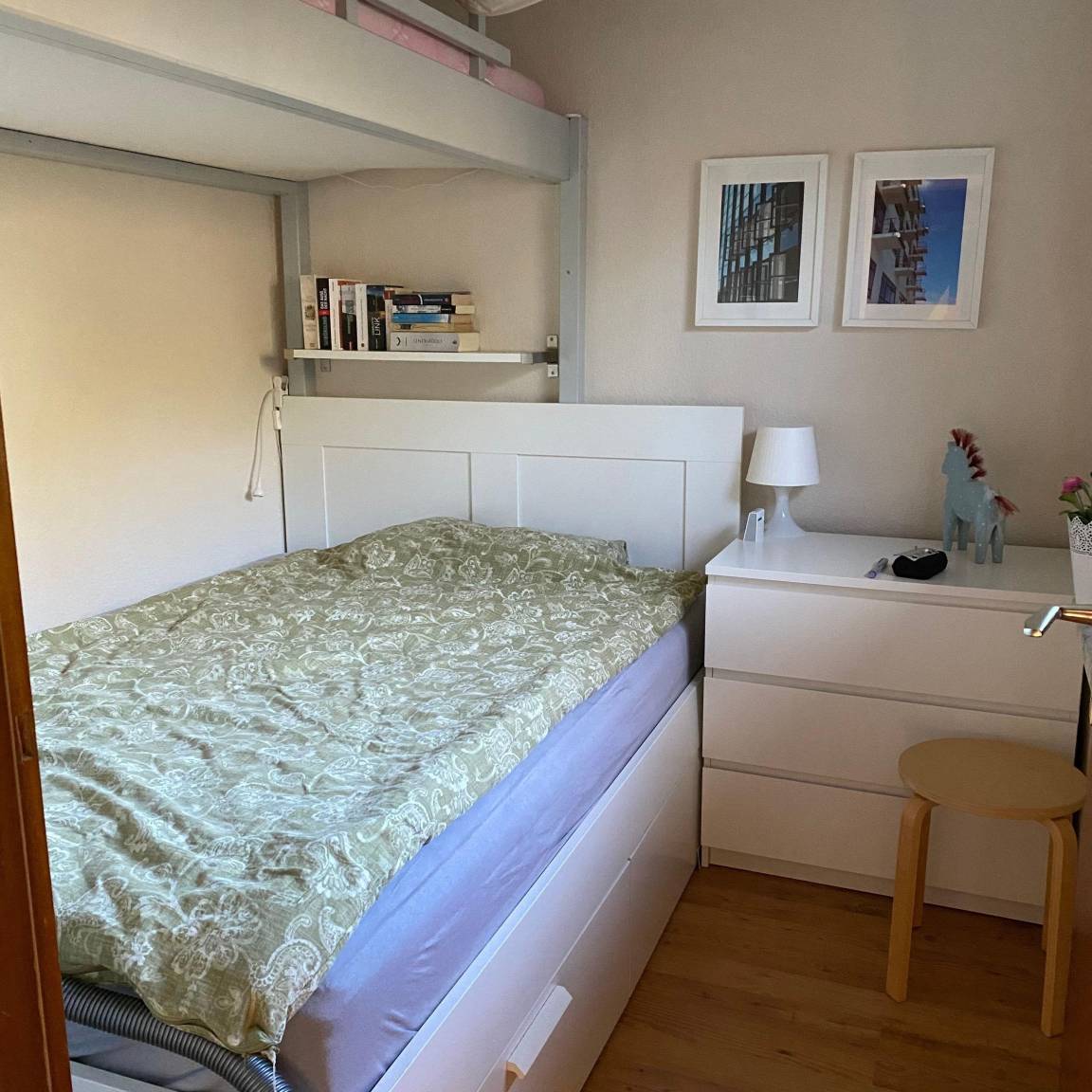Insgesamt bietet das kleine Schwedenhaus Schlafmöglichkeit für 5-6 Personen. Es gibt zwei Schlafräume: Ein Schlafraum ist mit einem Doppelbett ausgestattet, der zweite mit einem Hochbett und einem Doppelbett. Zusätzlich bietet das komfortable Schlafsofa bis zu zwei weitere Schlafmöglichkeiten (Eigentümergetestet! Es lässt sich wirklich darauf schlafen!).
