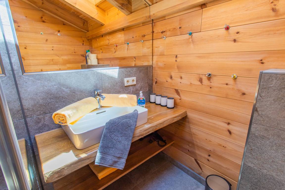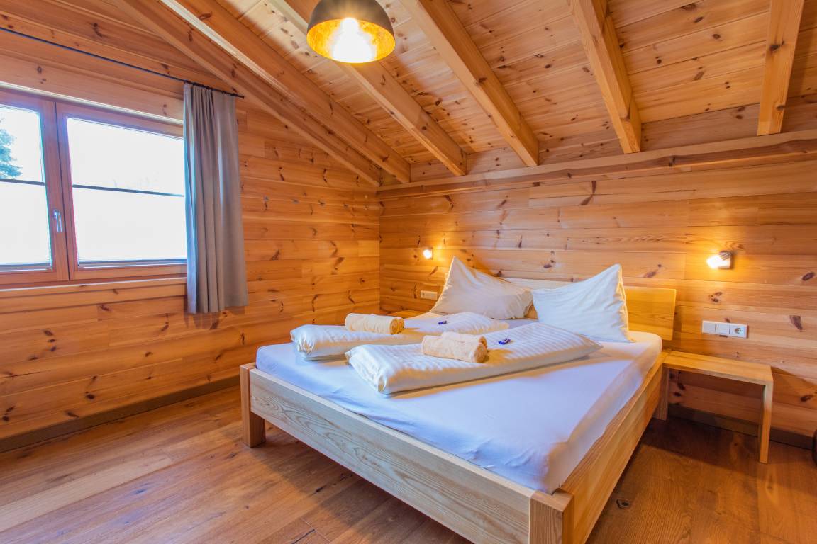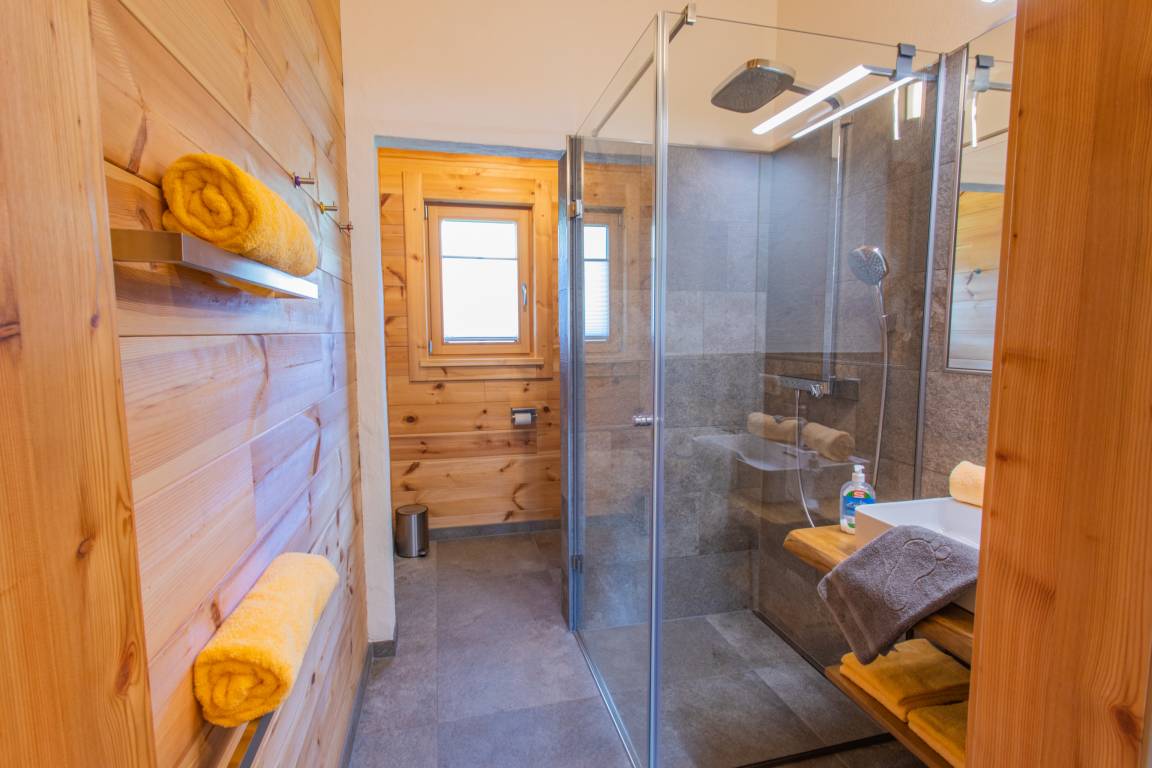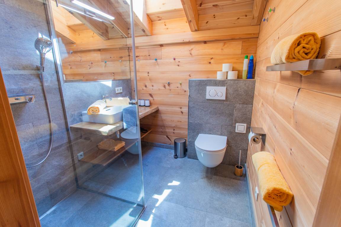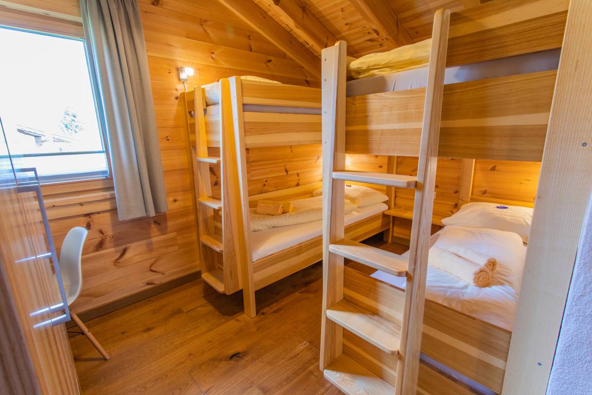 Drei Schlafzimmer im alpinen Stil sorgen mit komfortablen Massivholzbetten für erholsamen Schlaf. Jedes Zimmer ist zudem mit einem eigenen Fernseher ausgestattet. Zwei moderne Badezimmer mit stilvollen Holz- und Natursteinelementen runden das harmonische Gesamtbild ab.